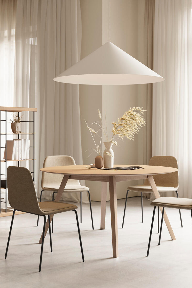 Jūsų pasirinkimui: fiksuoto dydžio šeimyninis pietų stalas arba stalas su prailginimo galimybe, pritaikomas ir didesniems susibūrimams. Kojelių apdailos pasirinkimui – skirtingų spalvų medžio lukštai arba dažytas plienas, o stalviršių spektre – medžio lukštų arba Tmatt dangų pasirinkimas.