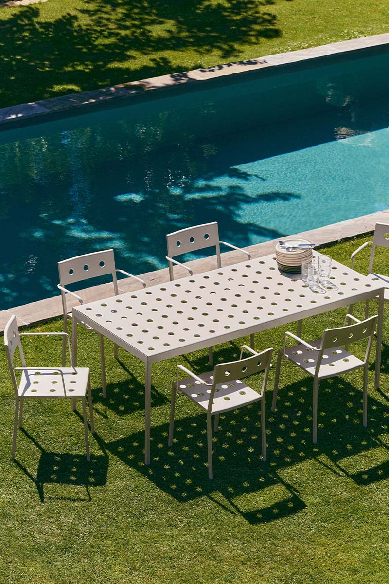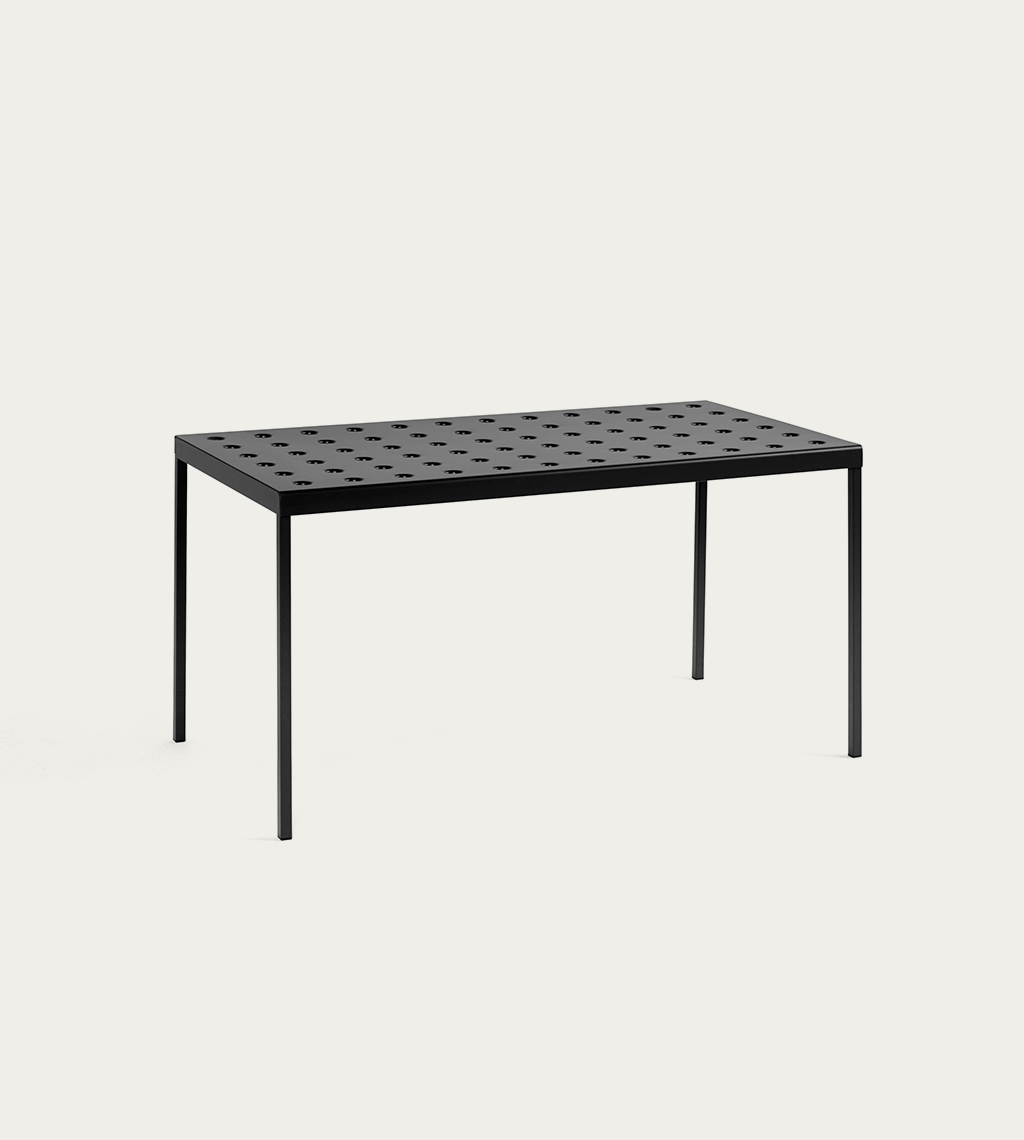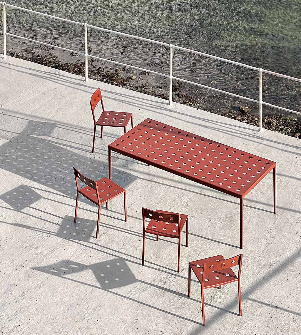 Charakteringo, tačiau universalaus dizaino paieškos brolių Bouroullec kūrybinį žvilgsnį kreipia į lauką. Specialiai HAY sukurta THE BALCONY COLLECTION pasiūlo itin praktiškus lauko erdvių apstatymo sprendimus. Išskirtinį charakterį šiai kolekcijai dovanoja speciali plieno perforavimo technika, leidžianti ne tik efektyviai išskirstyti baldams tenkančią apkrovą bei baldų paviršiuje besikaupiančią drėgmę, tačiau ir suteikianti ypatingo estetinio žavesio. Nors pavadinimas kolekcijos funkcinį vektorių brėžia balkono erdvės link, ši serija atliepia gerokai platesnio spektro poreikius, todėl neabejotina, kad BALCONY sutinkami visur: terasose, lauko kavinėse, soduose ar parkuose. Žavi spalvų gama BALCONY suteikia dar daugiau estetinio patrauklumo.