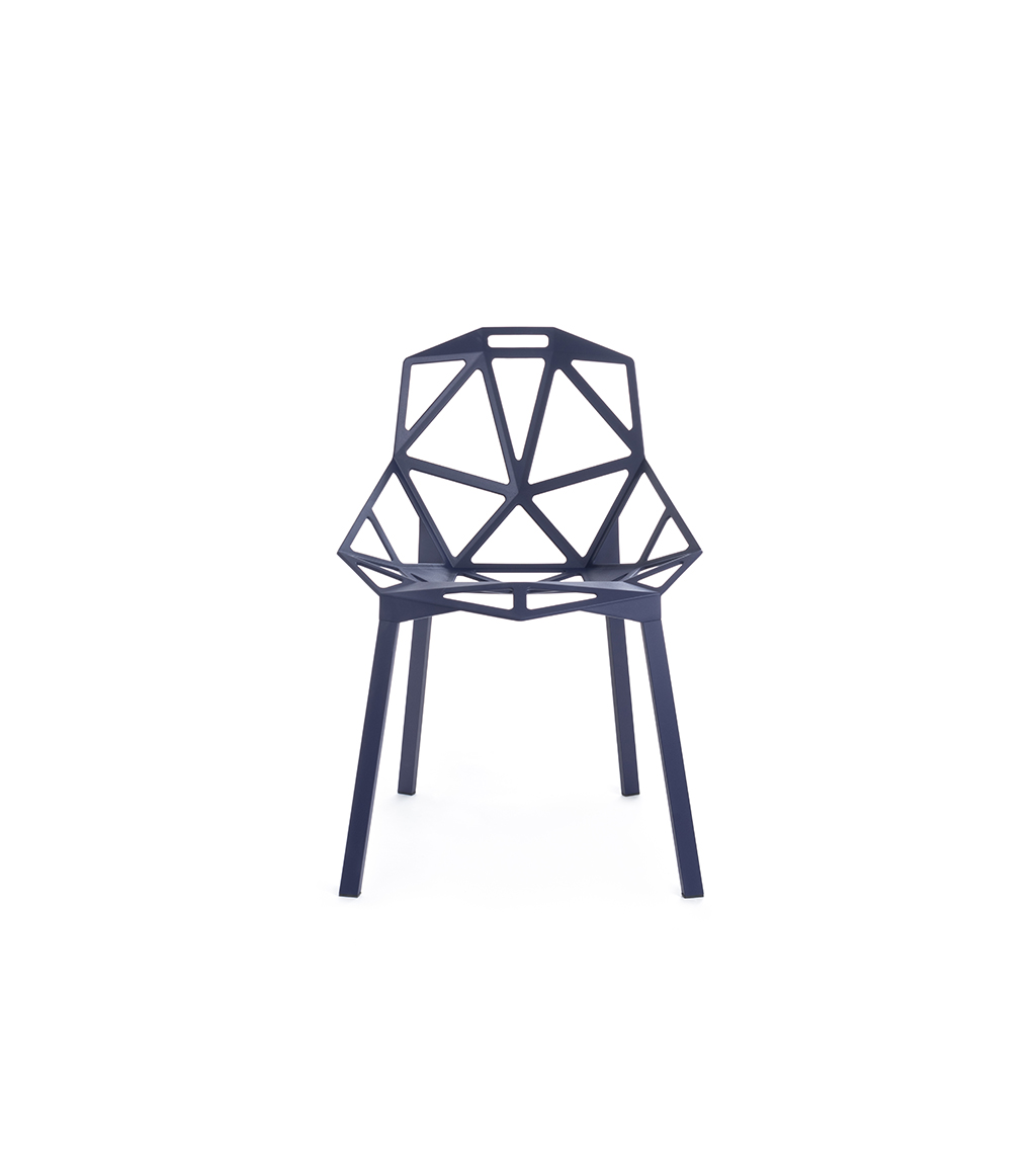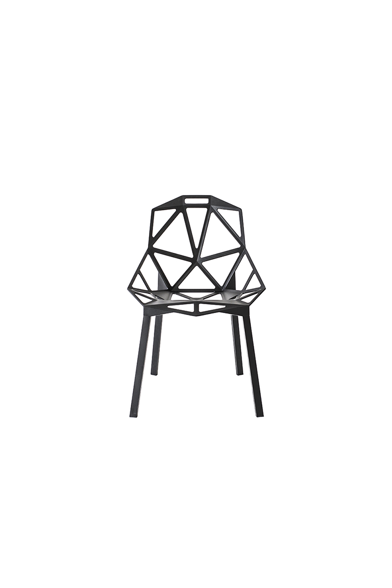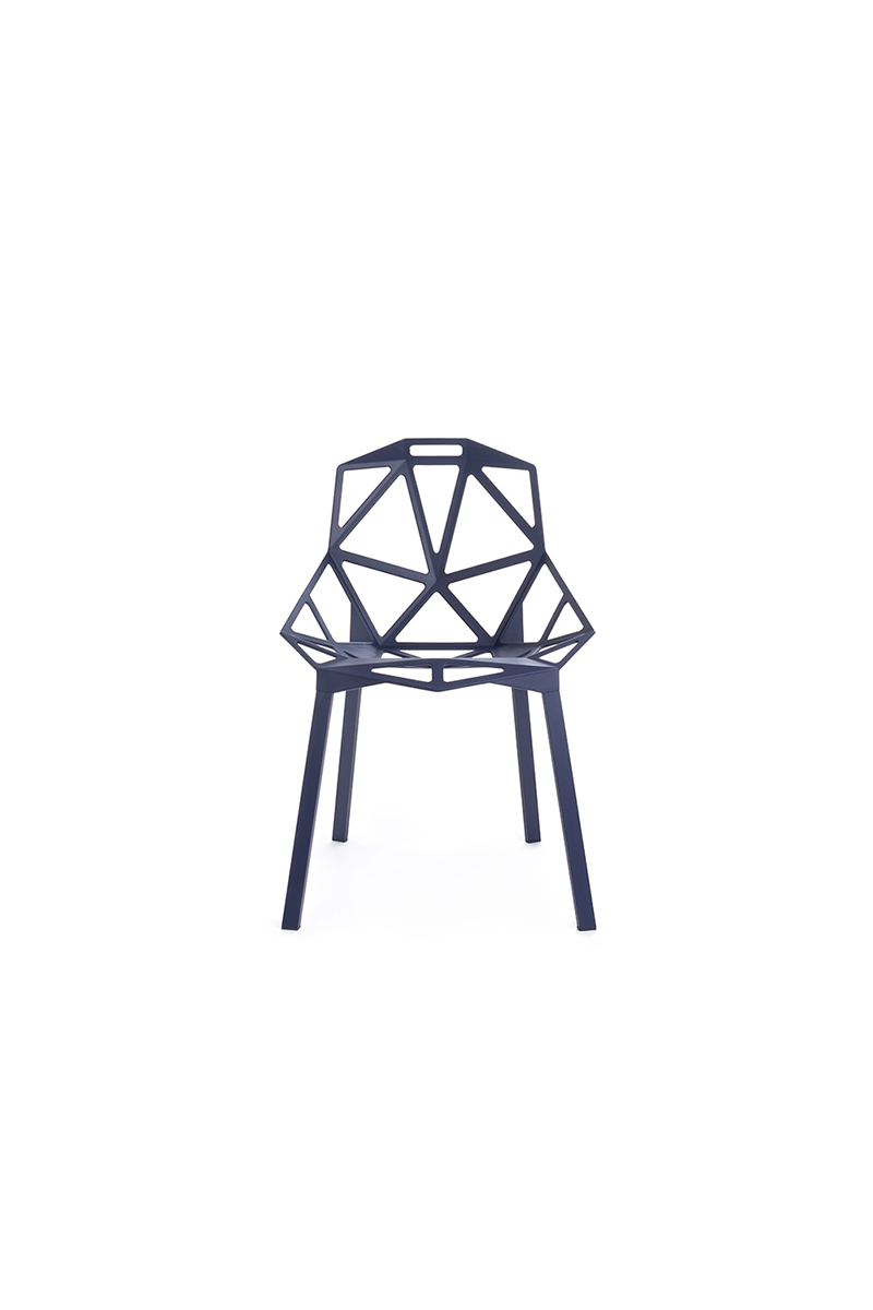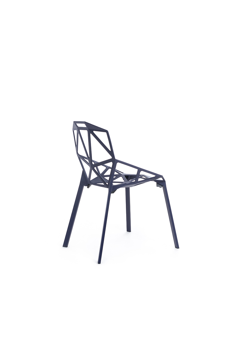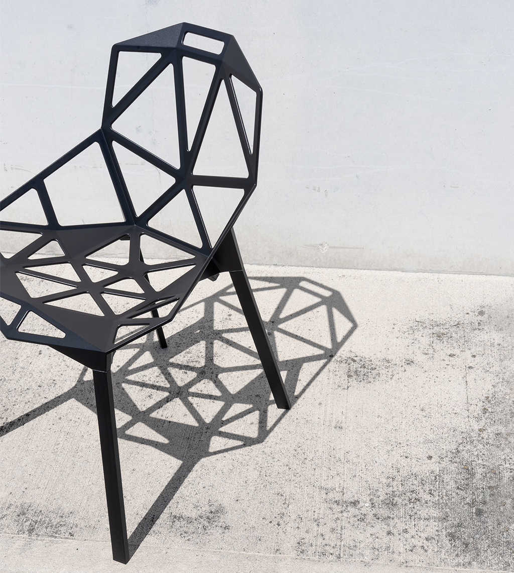 CHAIR_ONE – avangardinė, laikui nepavaldi sėdimųjų baldų kolekcija, puikiai tinkanti tiek namų, tiek viešosioms erdvėms – tiek vidaus, tiek lauko. Kėdės karkasas formuojamas iš plokščių trikampių elementų, sujungtų tarpusavyje kampu tarsi futbolo kamuolio briaunos – taip gimsta erdvinė baldo forma. Vyraujančios ertmės įrėmintos smulkiu rėmo profiliu, kuria išskirtinį grafinį piešinį, kuris tampa kėdės estetiniu parašu ir ryškia kėdės tapatybe.
