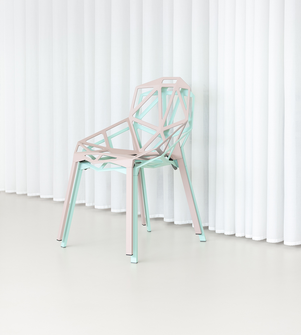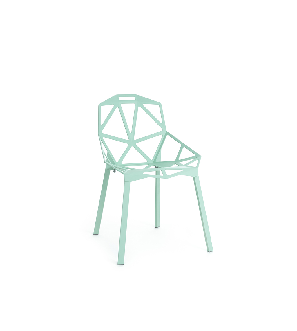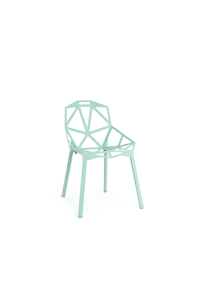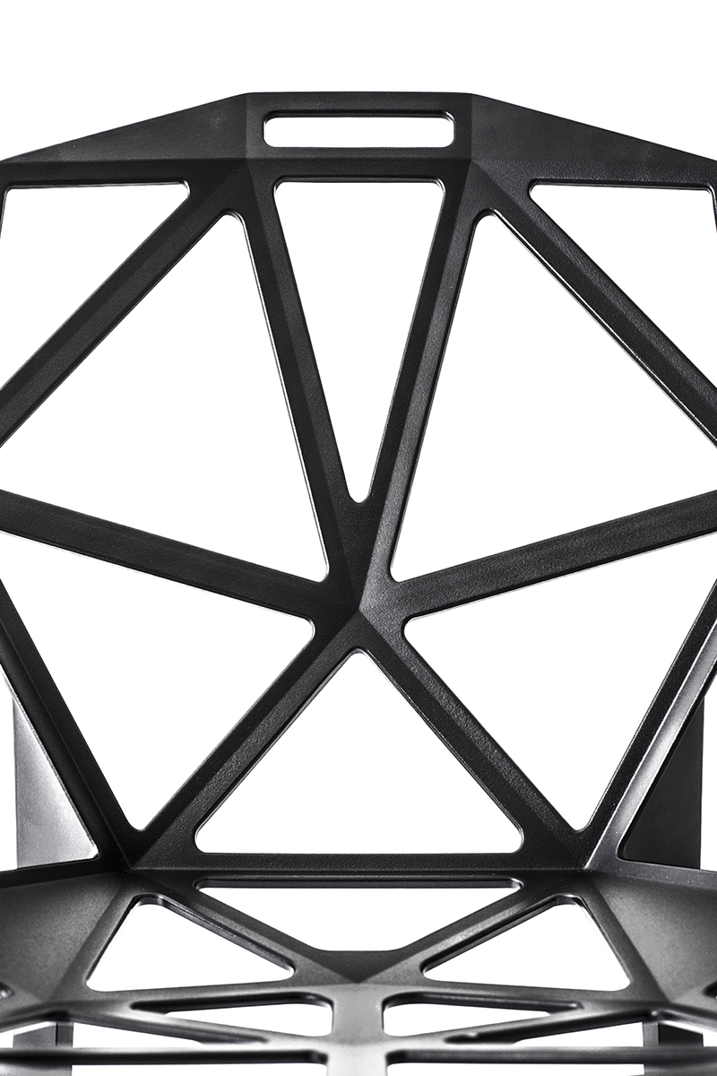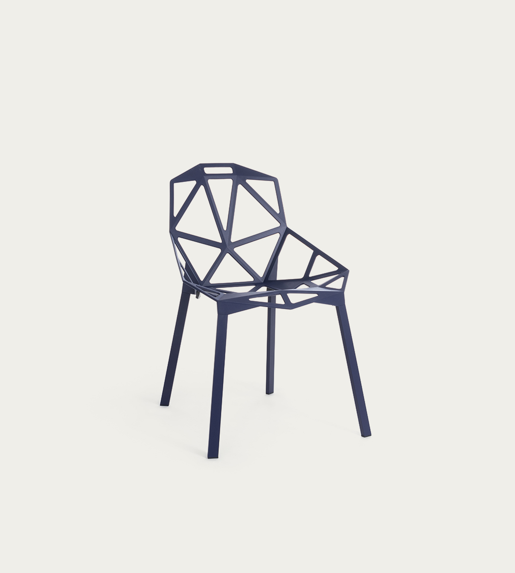 CHAIR_ONE – avangardinė, laikui nepavaldi sėdimųjų baldų kolekcija, puikiai tinkanti tiek namų, tiek viešosioms erdvėms – tiek vidaus, tiek lauko. Kėdės karkasas formuojamas iš plokščių trikampių elementų, sujungtų tarpusavyje kampu tarsi futbolo kamuolio briaunos – taip gimsta erdvinė baldo forma. Vyraujančios ertmės įrėmintos smulkiu rėmo profiliu, kuria išskirtinį grafinį piešinį, kuris tampa kėdės estetiniu parašu ir ryškia kėdės tapatybe.