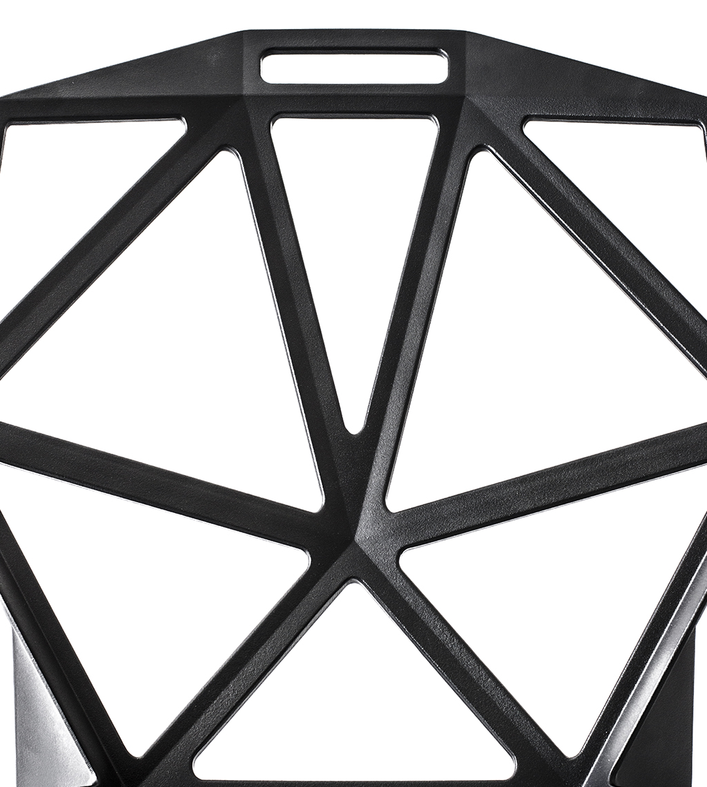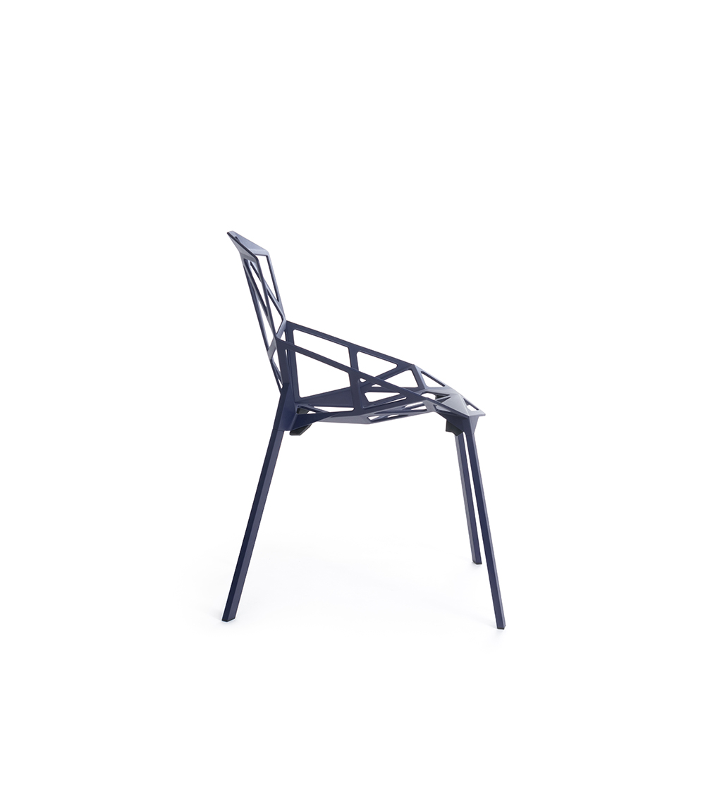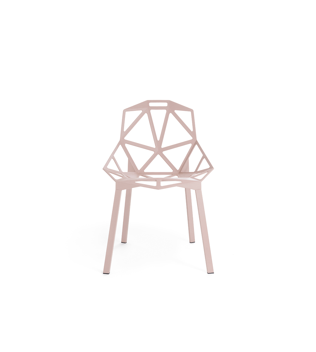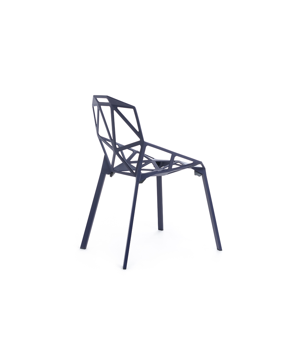 CHAIR_ONE – avangardinė, laikui nepavaldi sėdimųjų baldų kolekcija, puikiai tinkanti tiek namų, tiek viešosioms erdvėms – tiek vidaus, tiek lauko. Kėdės karkasas formuojamas iš plokščių trikampių elementų, sujungtų tarpusavyje kampu tarsi futbolo kamuolio briaunos – taip gimsta erdvinė baldo forma. Vyraujančios ertmės įrėmintos smulkiu rėmo profiliu, kuria išskirtinį grafinį piešinį, kuris tampa kėdės estetiniu parašu ir ryškia kėdės tapatybe.