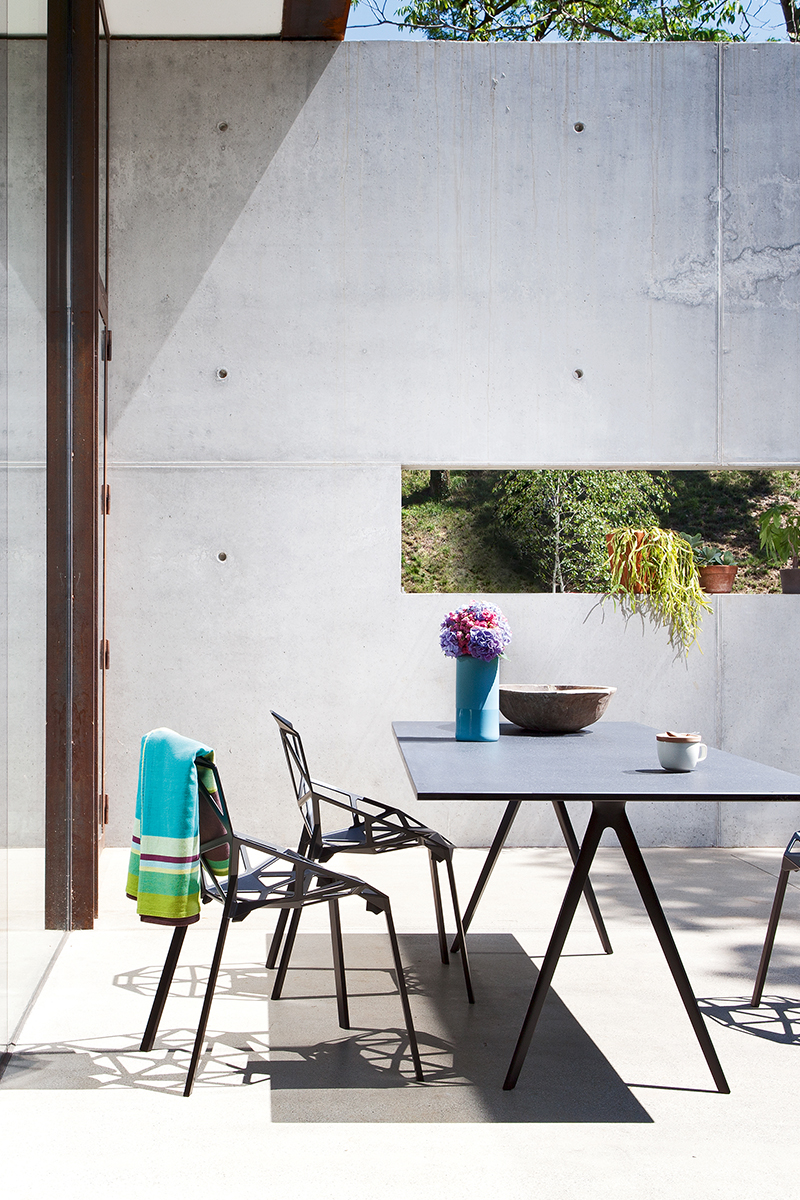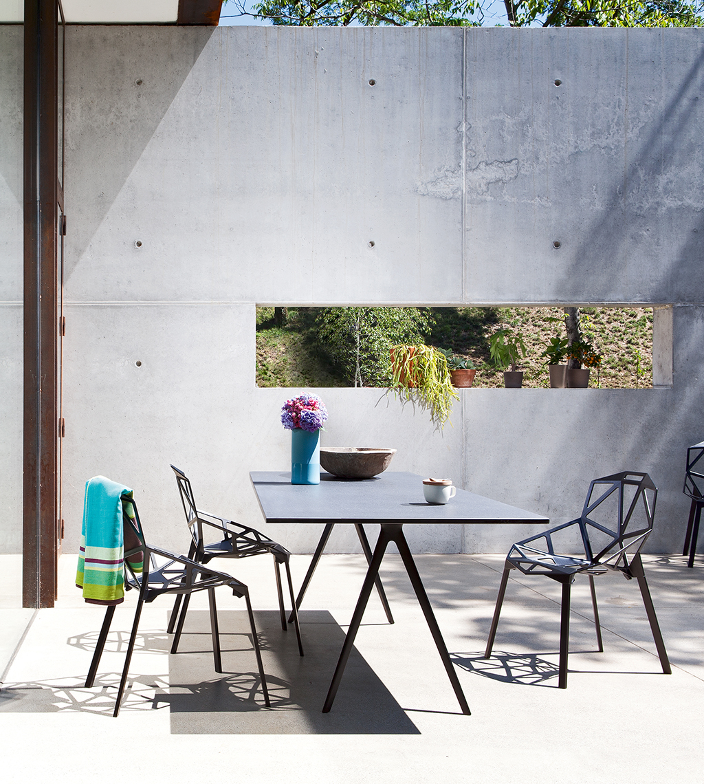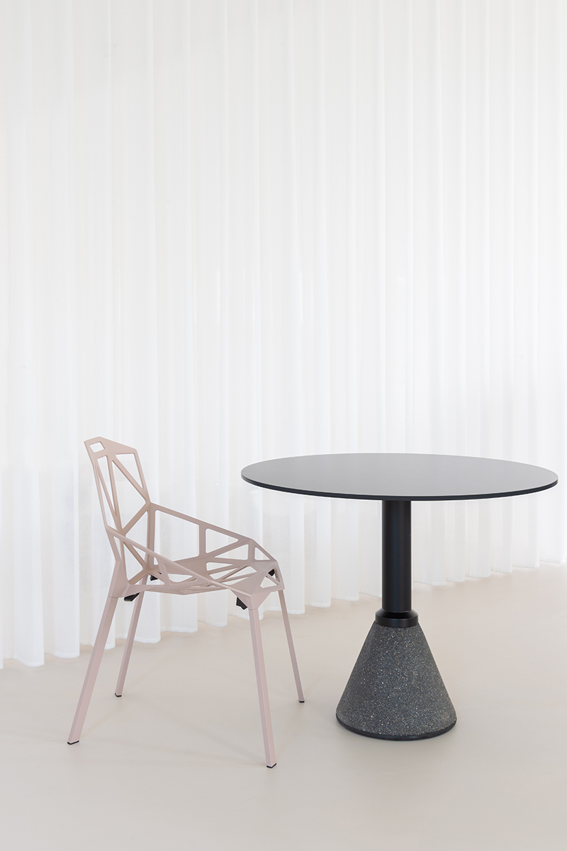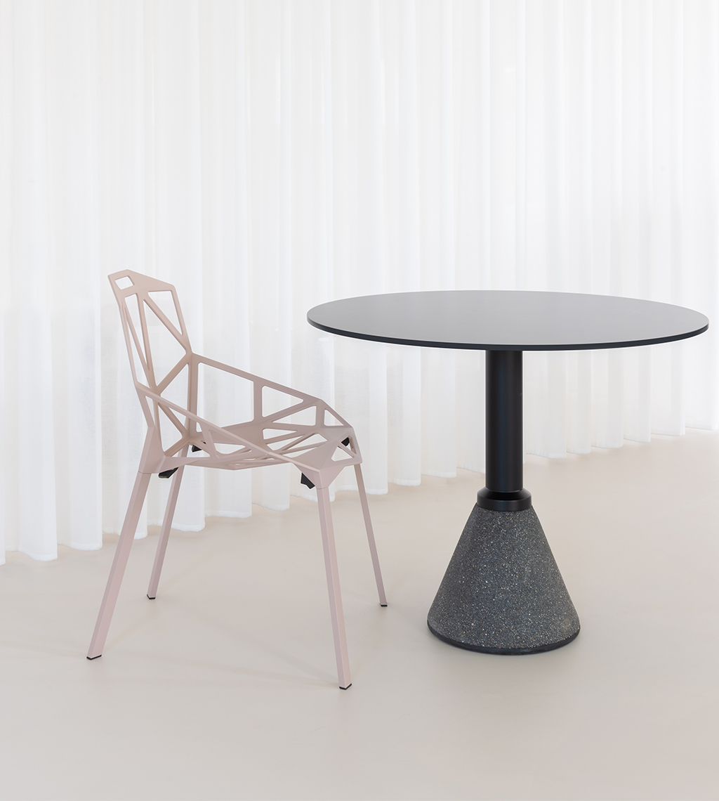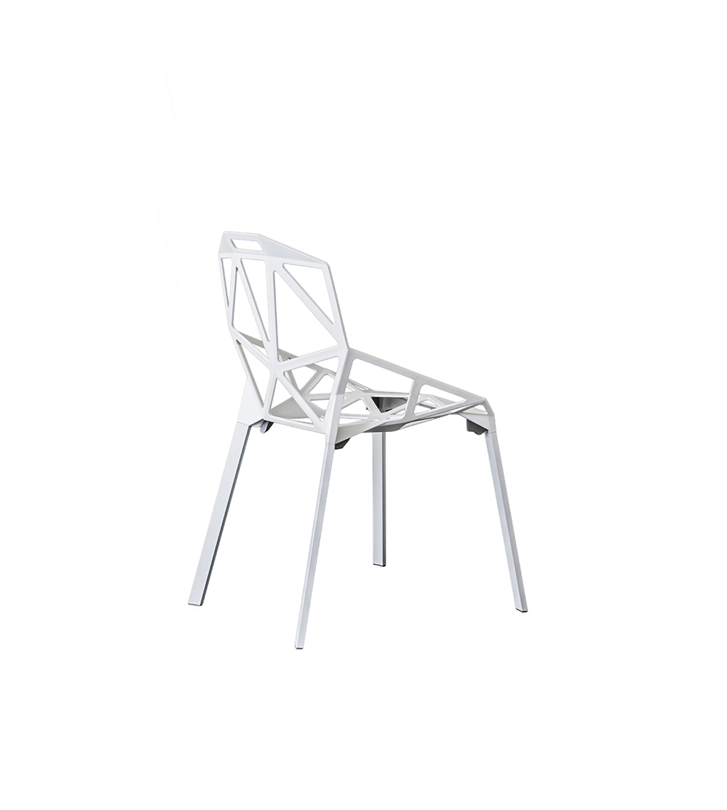 CHAIR_ONE – avangardinė, laikui nepavaldi sėdimųjų baldų kolekcija, puikiai tinkanti tiek namų, tiek viešosioms erdvėms – tiek vidaus, tiek lauko. Kėdės karkasas formuojamas iš plokščių trikampių elementų, sujungtų tarpusavyje kampu tarsi futbolo kamuolio briaunos – taip gimsta erdvinė baldo forma. Vyraujančios ertmės įrėmintos smulkiu rėmo profiliu, kuria išskirtinį grafinį piešinį, kuris tampa kėdės estetiniu parašu ir ryškia kėdės tapatybe.