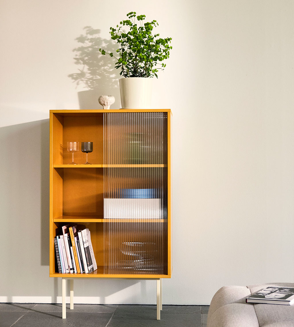 COLOUR CABINET TALL – aukšta serijos komoda su reljefinio stiklo slankiojančiomis durelėmis. Spalvingas akcentas bet kurioje erdvėje.