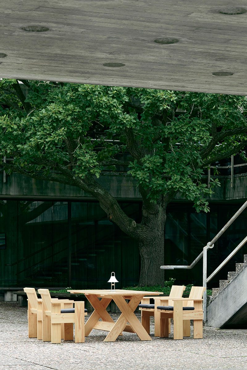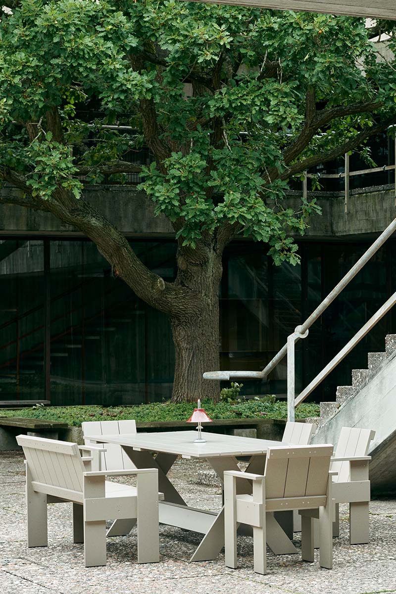 Rietveld Originals x HAY atkurta CRATE serija pasižymi originaliems baldams būdingu išraiškingu charakteriu, tiksliomis proporcijomis bei architektūriškomis formomis. CRATE serijos baldai gaminami iš natūralios pušies medienos, padengtos vandens pagrindo laku, todėl gali būti naudojami tiek viduje, tiek ir lauke. Sukurti kone prieš šimtą metų, CRATE baldai įkūnija ir šiandieną be galo svarbias dizaino vertybes: komfortas, palanki kaina bei dizaino pagalba užkoduota modernios gyvensenos žinutė.