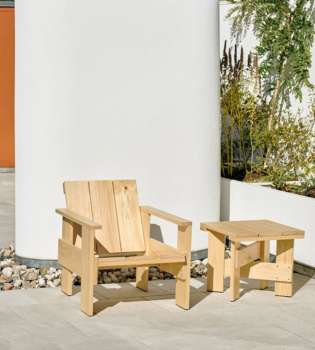CRATE kolekcijos istorija prasidėjo 1934 m., kuomet garsus danų architektas bei dizaineris Gerrit Rietveld užsimojo sukurti patogius, prieinamus ir stilingus baldus iš paprastų medinių dėžių. Rietveld Originals x HAY atkurta CRATE serija pasižymi originaliems baldams būdingu išraiškingu charakteriu, tiksliomis proporcijomis bei architektūriškomis formomis. CRATE serijos baldai gaminami iš natūralios pušies medienos, padengtos vandens pagrindo laku, todėl gali būti naudojami tiek viduje, tiek ir lauke. CRATE kolekciją sudaro patogus krėslas kėdė, kavos bei šoninis staleliai. Sukurti kone prieš šimtą metų, CRATE baldai atspindi ir šiandieną be galo svarbias dizaino vertybes: komfortas, palanki kaina bei dizaino pagalba užkoduota modernios gyvensenos žinutė.