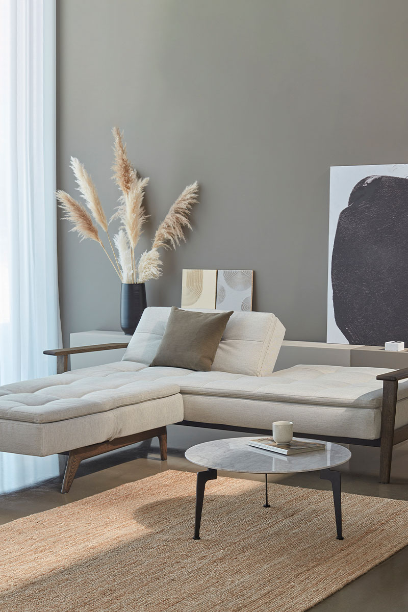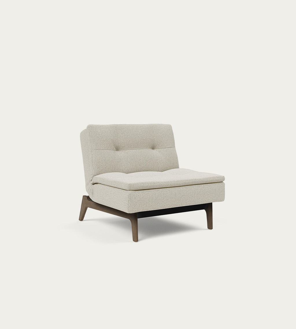 New Nordic stiliaus fotelis, medinėmis kojelėmis. Pilnai išnaudokite gyvenamąją erdvę derindami DUBLEXO sofą su vienu ar keliais foteliais. Fotelį išskleidus ir priglaudus prie sofos suformuosite poilsio zoną su šezlongu, suskleidus – turėsite papildomą vietą atsisėsti, suglaudus du fotelius – suformuosite papildomą miegamą vietą. Trijų skirtingų pozicijų, lengvai reguliuojamas atlošas. Čiužinyje integruotos kišeninės kūginės spyruoklės ir papildomas minkštas sluoksnis sėdimojoje ir atlošo dalyse, leis mėgautis poilsiu. Juodas plieninis rėmas, lakuoto arba tamsinto ąžuolo kojelės.