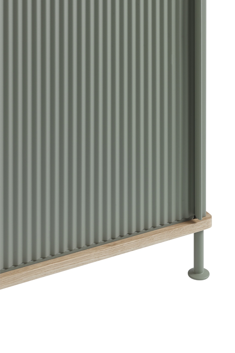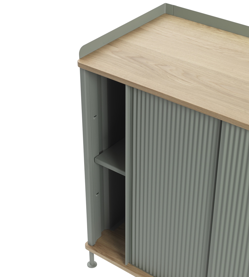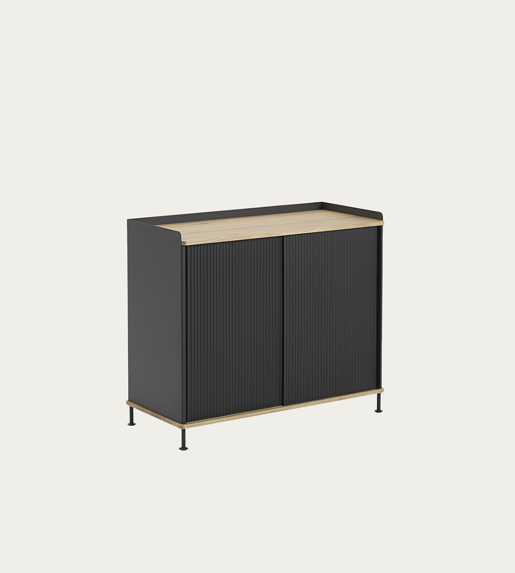 ENFOLD SIDEBOARD koncepcija susiformavo dizaineriui Thomas Bentzen besilankant įvairiose baldų gamyklose ir analizuojant pramoninius elementus bei jų pritaikymą kasdienybėje. ENFOLD ašis – dviejų kontrastingų medžiagų sąveika viename objekte. Šaltas metalas suteikia industrinės estetikos atspalvį, o plastiška natūrali mediena šildo, keičia baldo energetiką. Bangomis gofruotas plieno fasadas bei matinių atspalvių gama laipsniškai sušvelnina medžiagų kontrastą ir ENFOLD SIDEBOARD tampa puikiausiu įrodymu, jog priešingybės ne tik traukia viena kitą, bet kuo puikiausiai ir papildo.