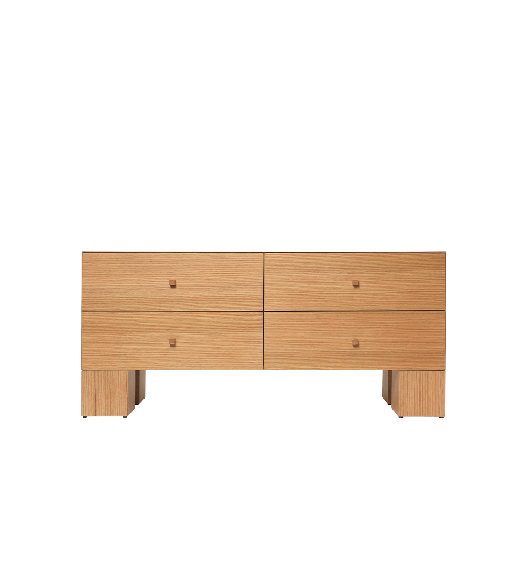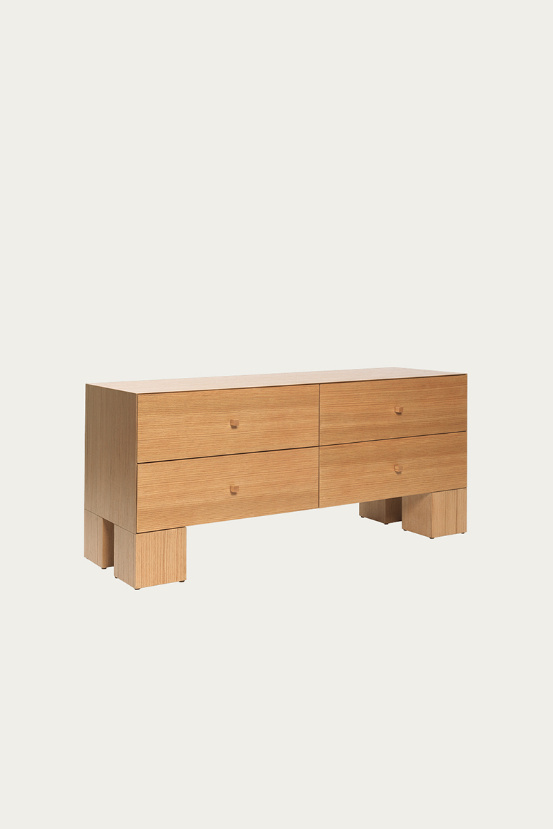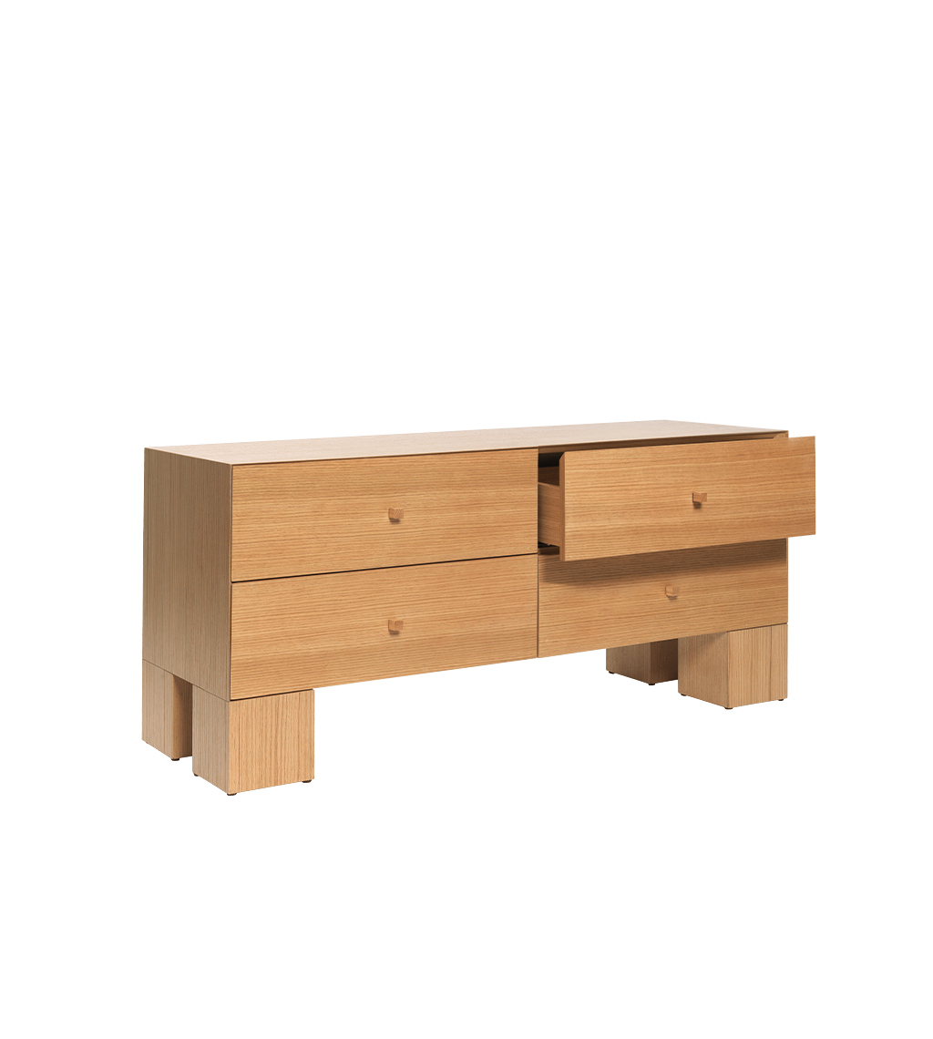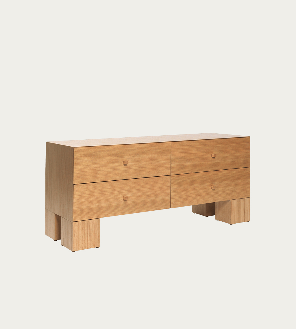 Aštri, kubiška forma ir plonintos rėmo briaunos kuria vientisos dėžės iliuziją, o masyvios, kubo formos kojelės suteikia dizainui išraiškingą charakterį. Kompoziciją papildo rafinuotas, žaismingas akcentas – nedidelės medžio rankenėlės. Derindama funkcionalumą su minimalistine estetika, komoda siūlo talpią erdvę drabužiams ar kitiems daiktams laikyti. Gaminama iš FSC™ sertifikuotos ąžuolo medienos, todėl yra atsakingas pasirinkimas, gamintojo ženklinamas „Responsible“ žyma.
