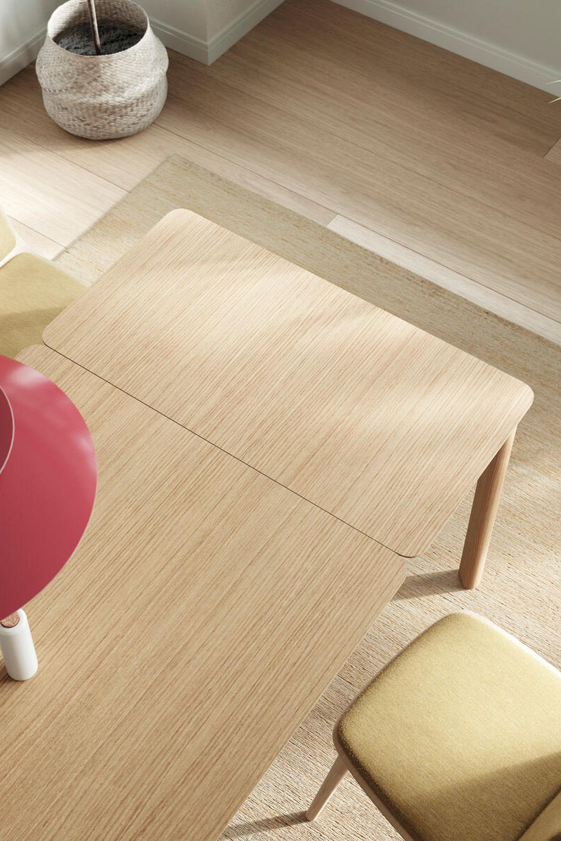 Jūsų pasirinkimui: fiksuoto dydžio šeimyninis pietų stalas arba stalas su prailginimo galimybe, pritaikomas ir didesniems susibūrimams. Kojelių apdailos pasirinkimui – skirtingų spalvų medžio lukštai, o stalviršių spektre – medžio lukštų arba Tmatt dangų pasirinkimas.