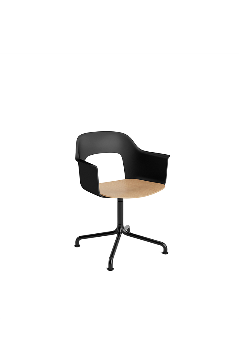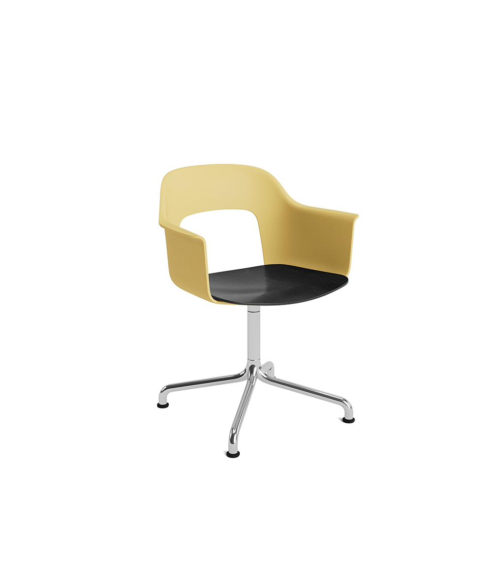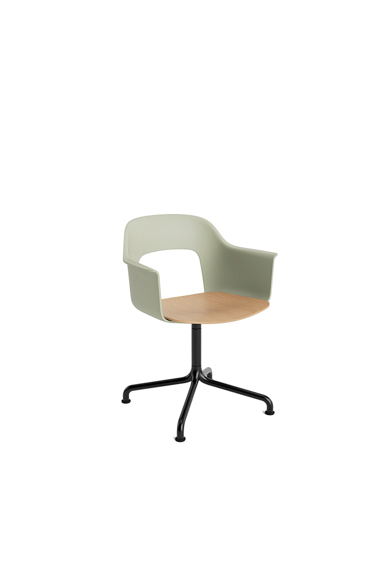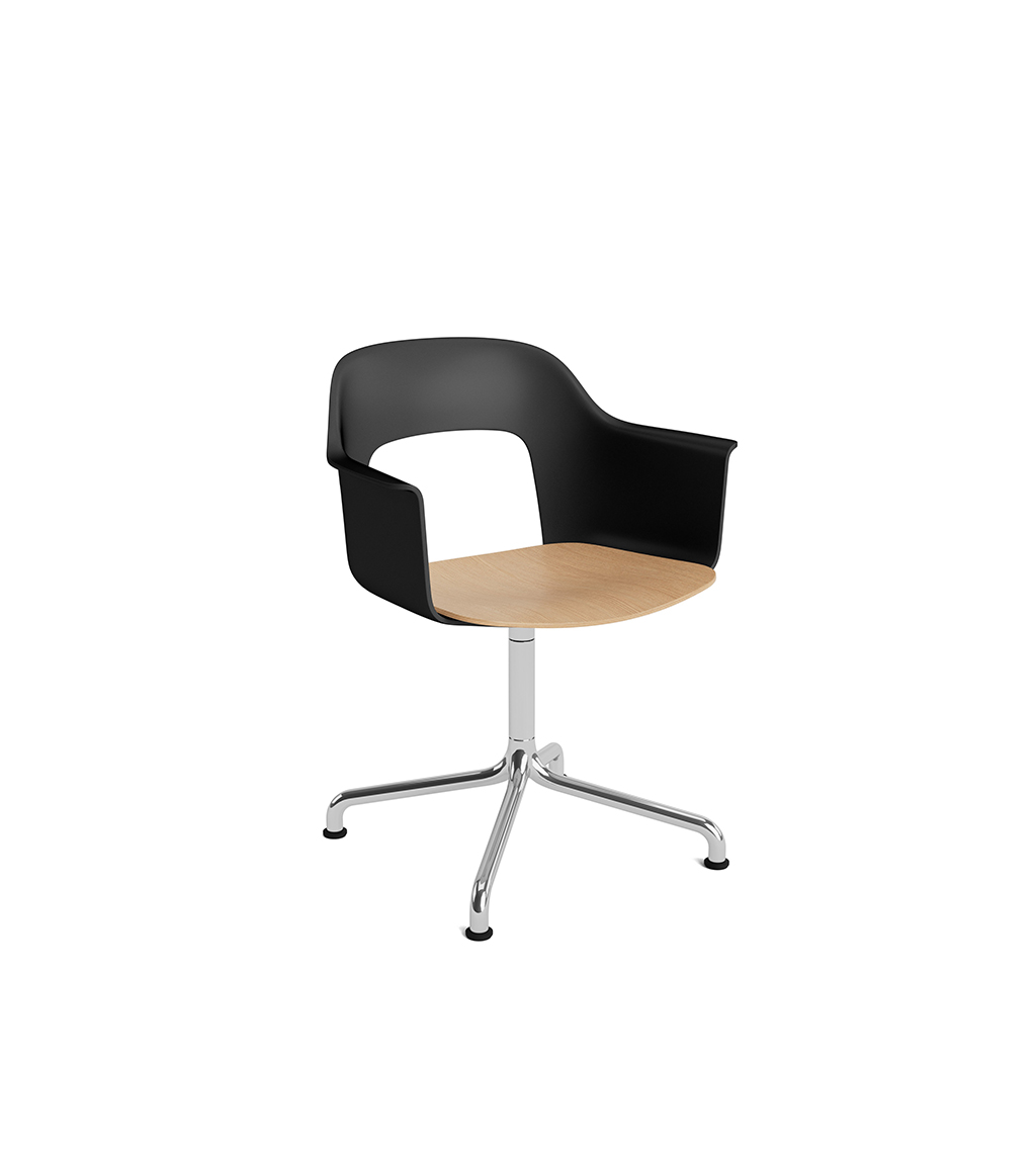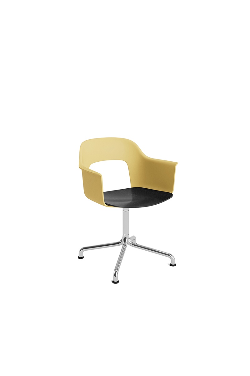 LAYOUT 252 – kėdė su porankiais, plastiko atlošu, medžio lukšto sėdimąja dalimi bei sukama aliuminio baze.