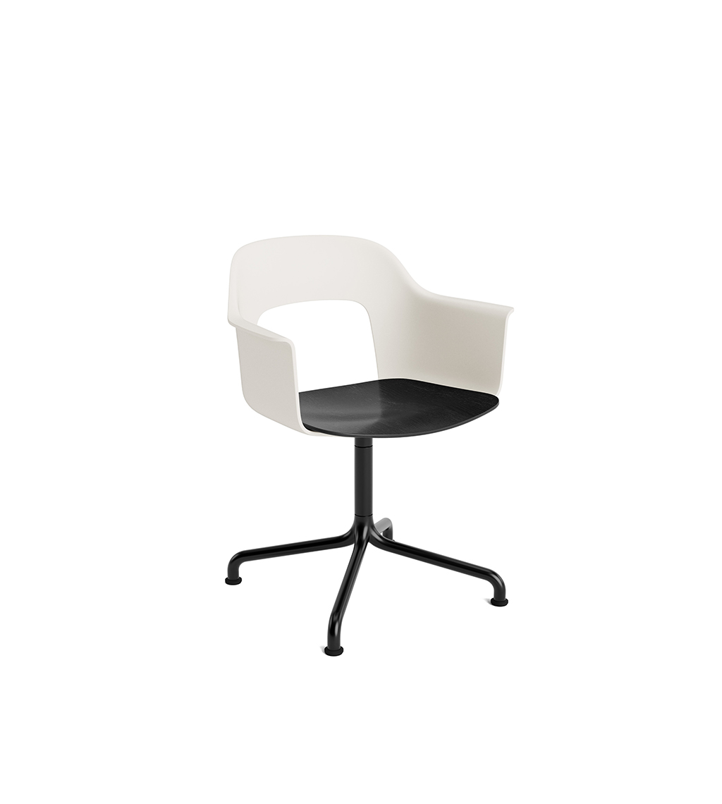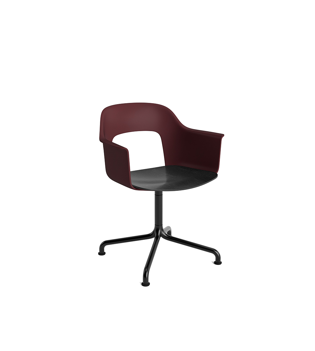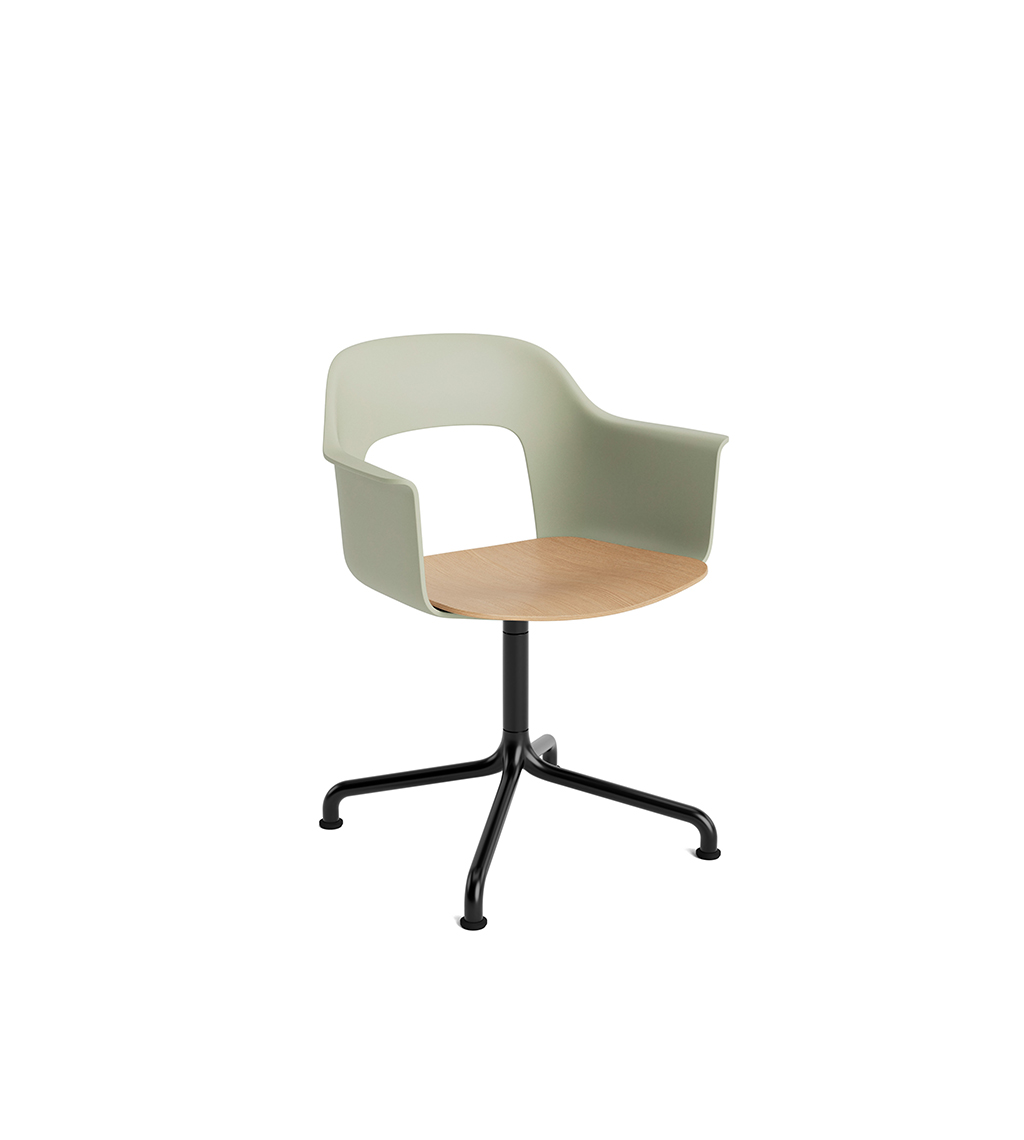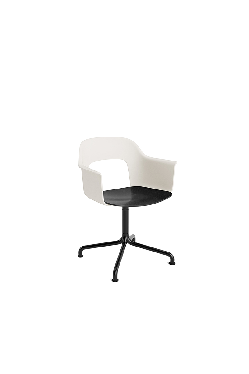 LAYOUT 252 – kėdė su porankiais, plastiko atlošu, medžio lukšto sėdimąja dalimi bei sukama aliuminio baze.