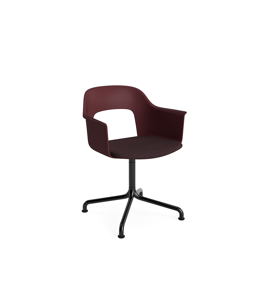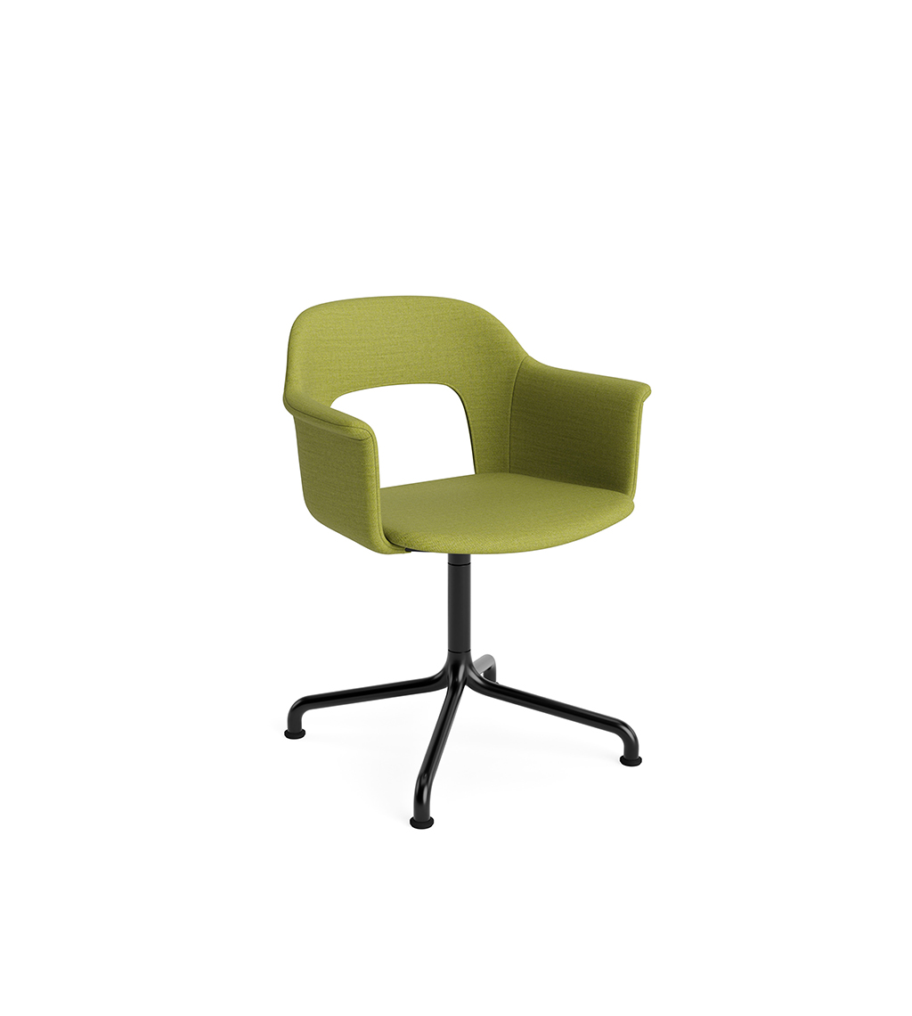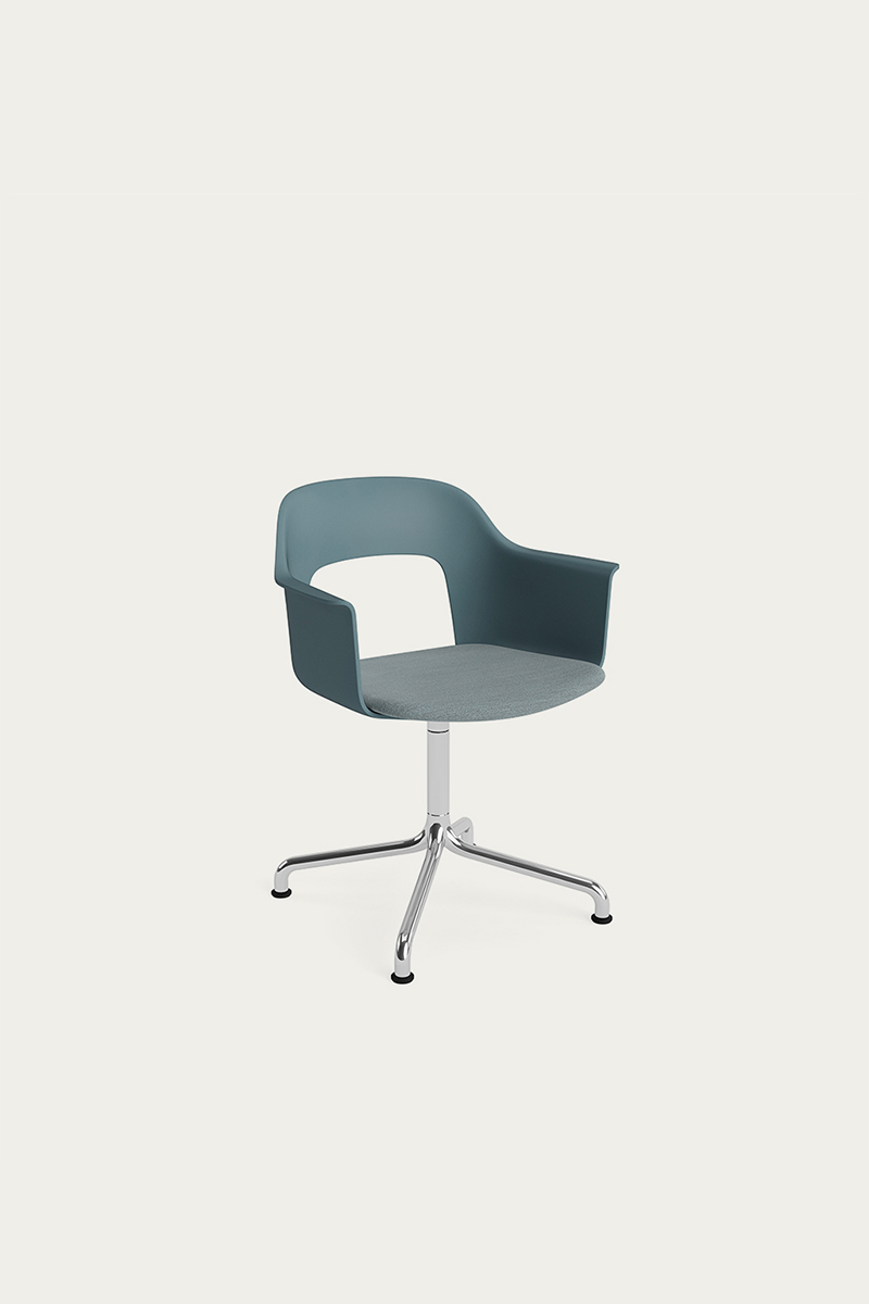 LAYOUT 253 – kėdė su porankiais, plastiko atlošu, audiniu arba oda vilkta sėdimąja dalimi bei sukama aliuminio baze.