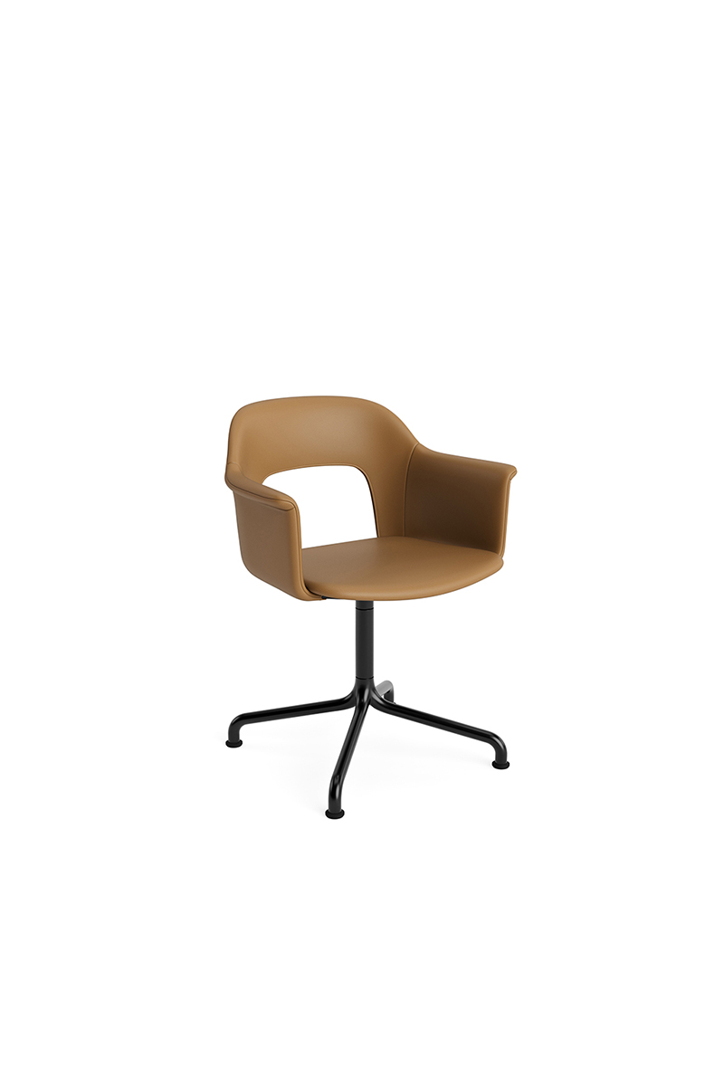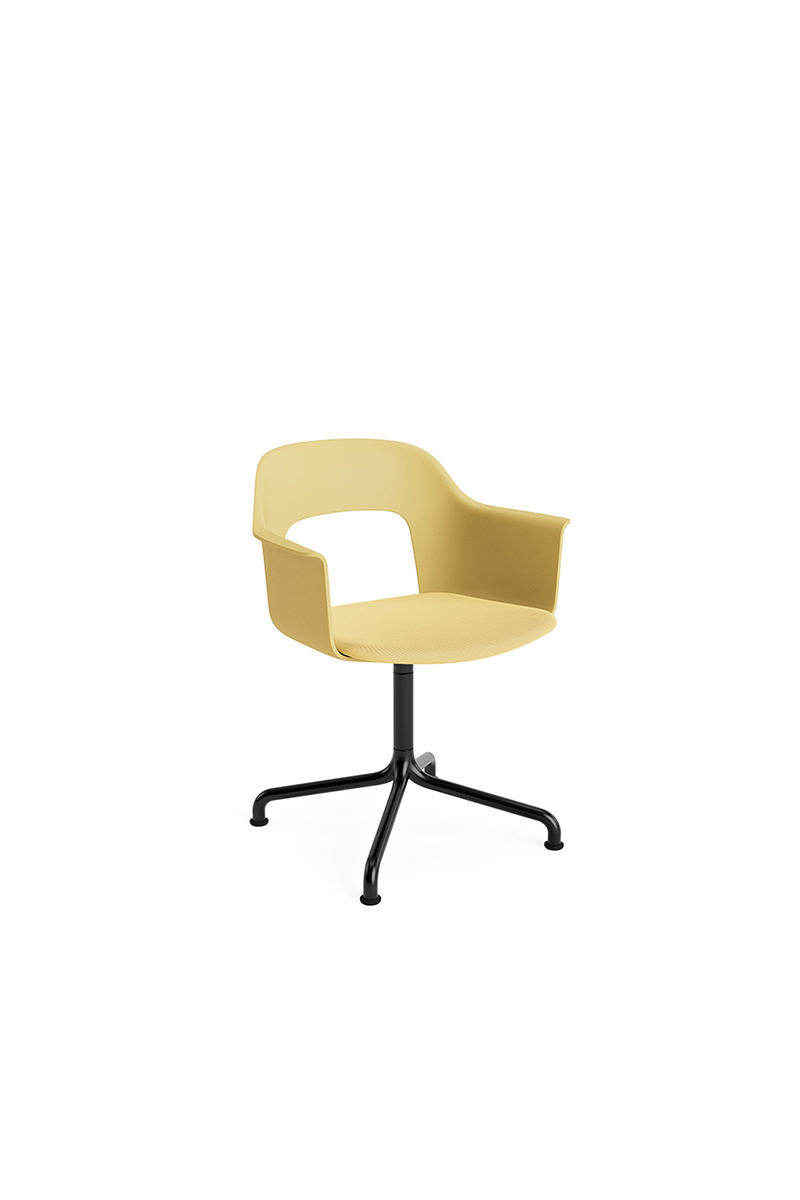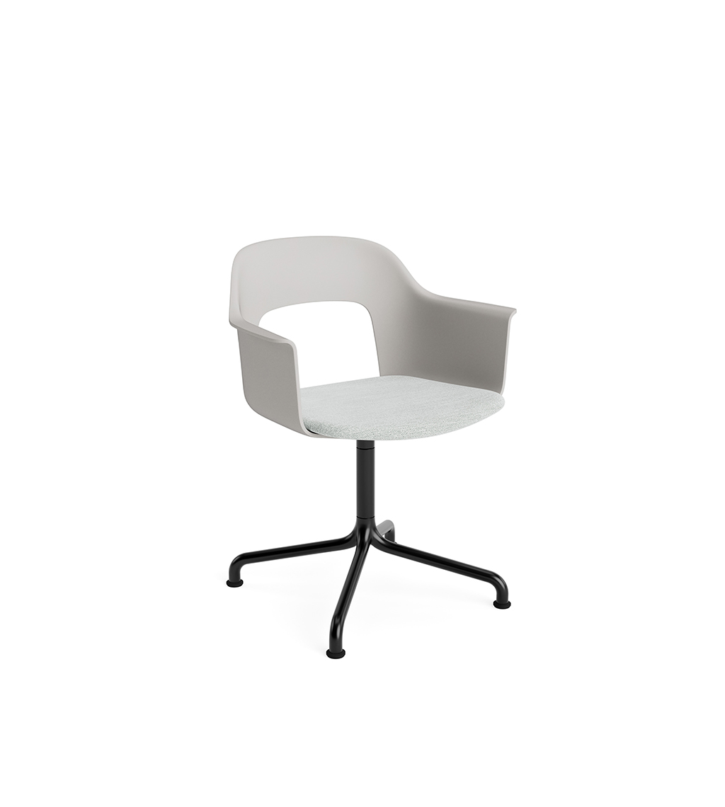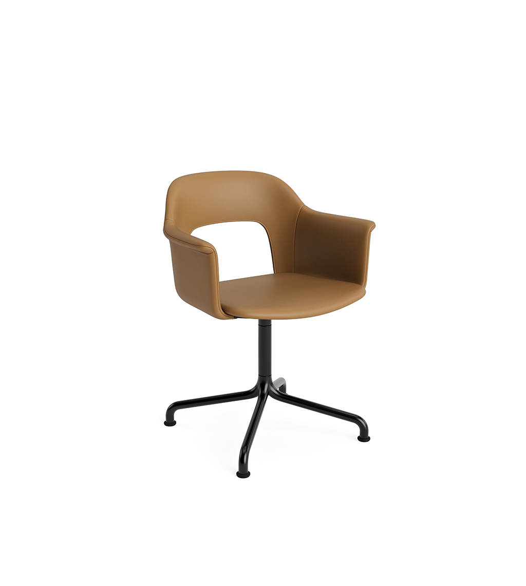 LAYOUT 253 – kėdė su porankiais, plastiko atlošu, audiniu arba oda vilkta sėdimąja dalimi bei sukama aliuminio baze.