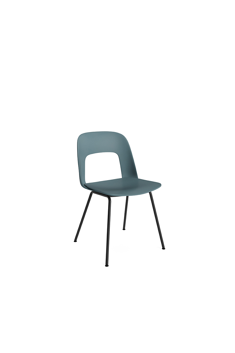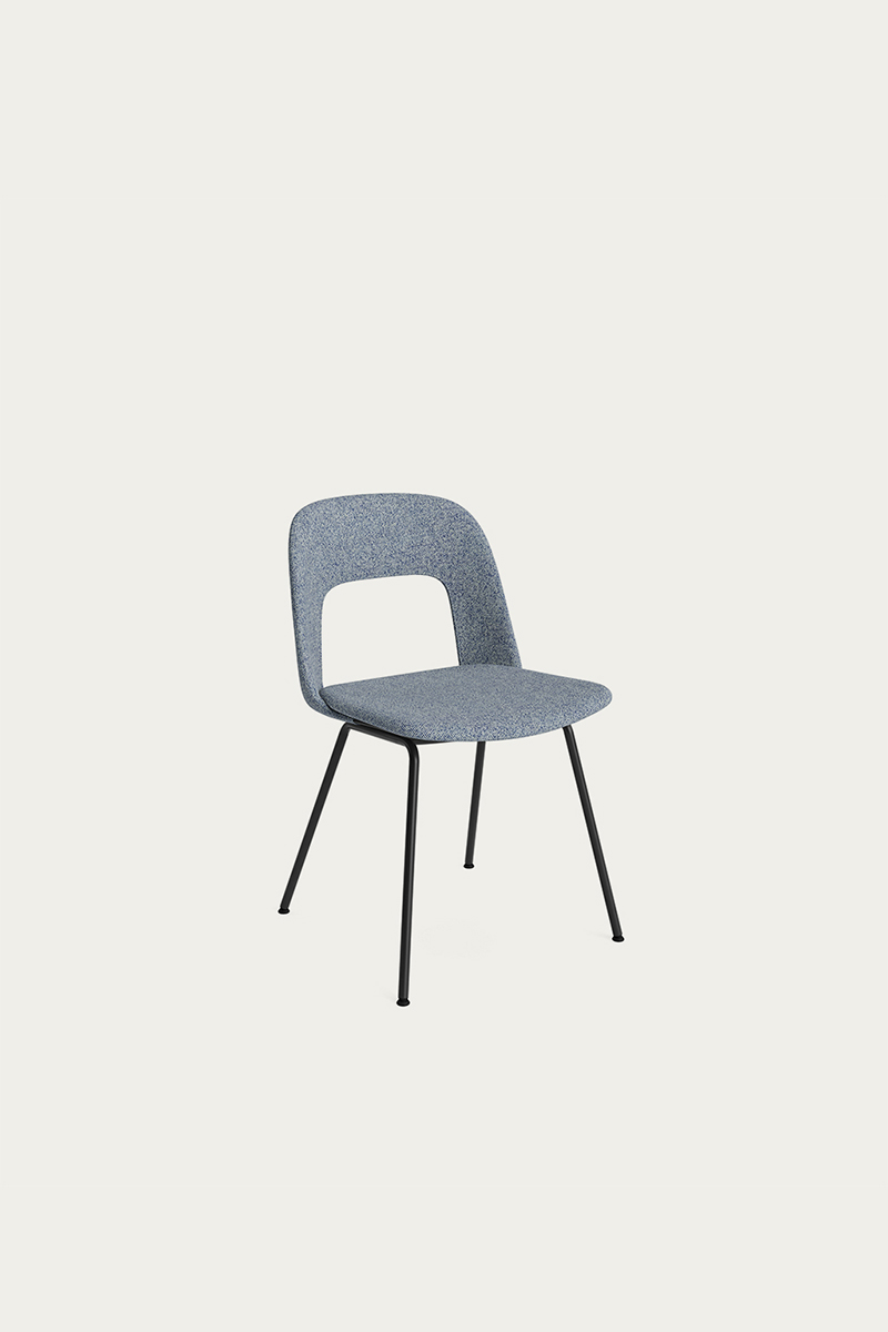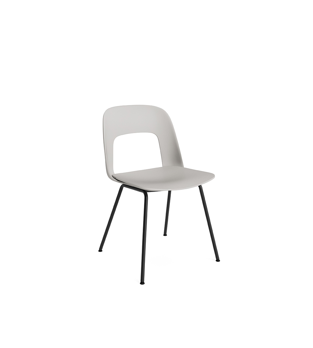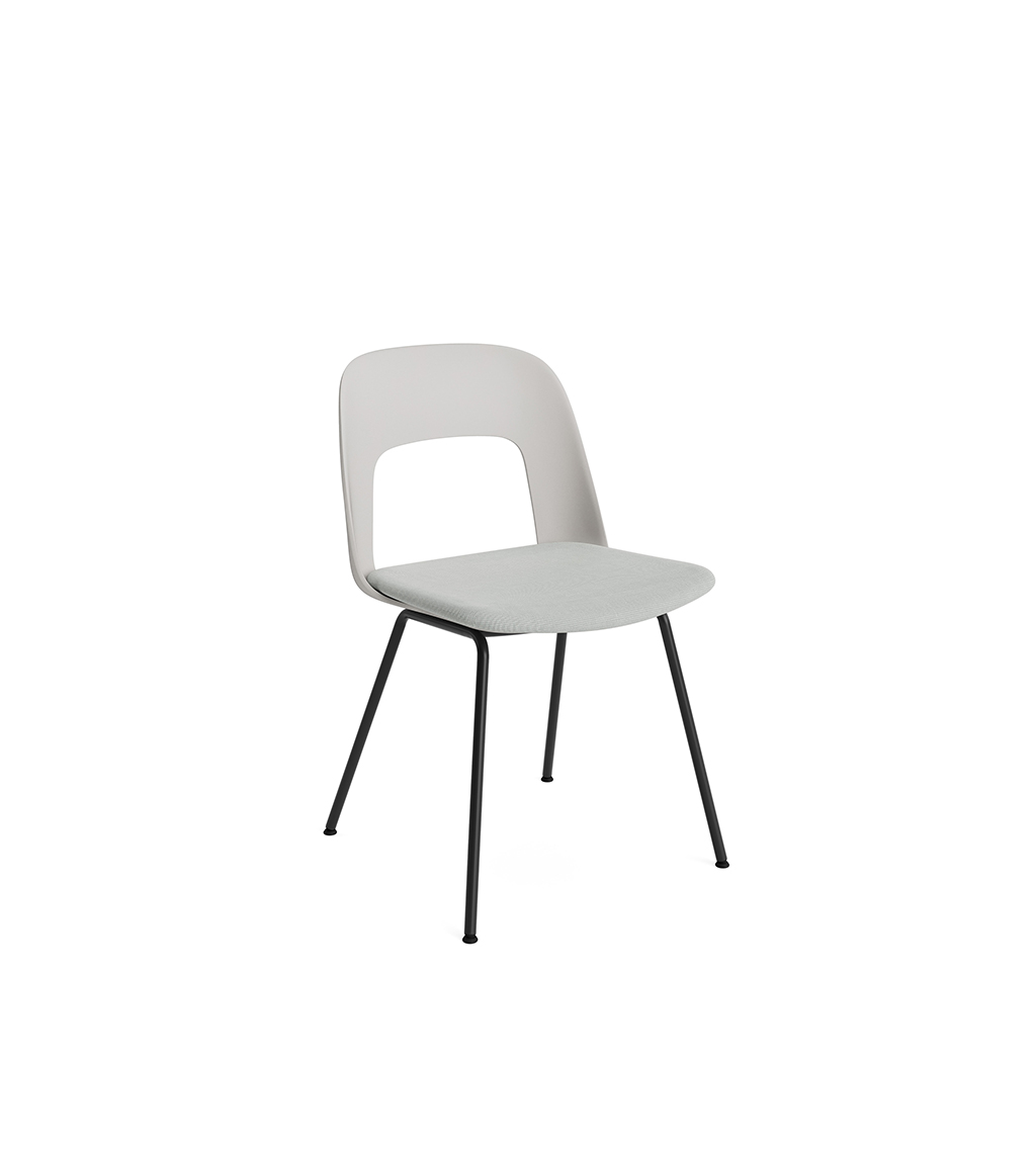 LAYOUT 113 – kėdės versija plastiko atlošu, audiniu arba oda vilkta sėdimąja dalimi bei plieno kojelėmis.
