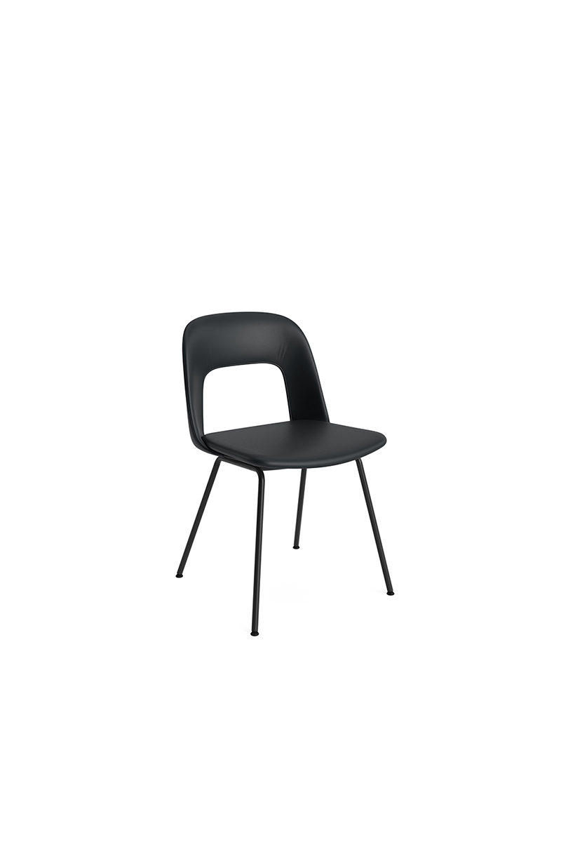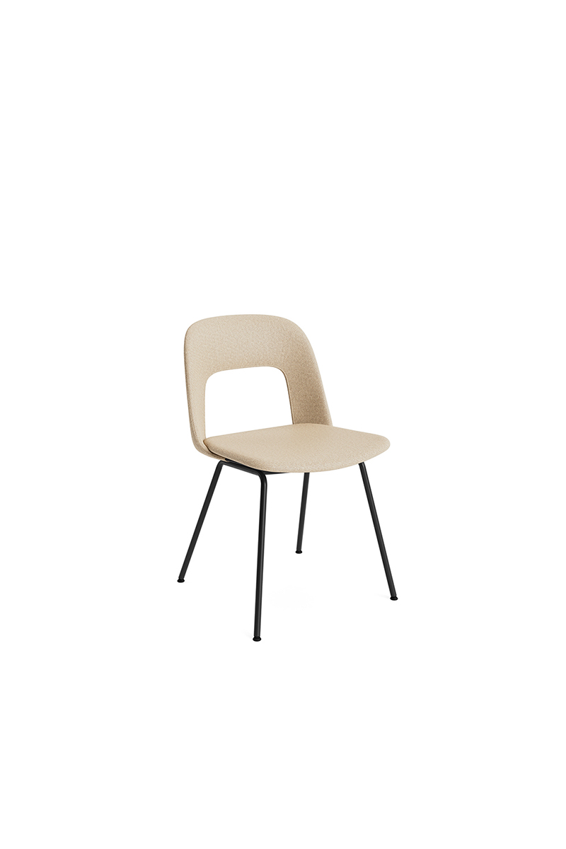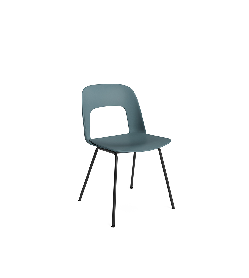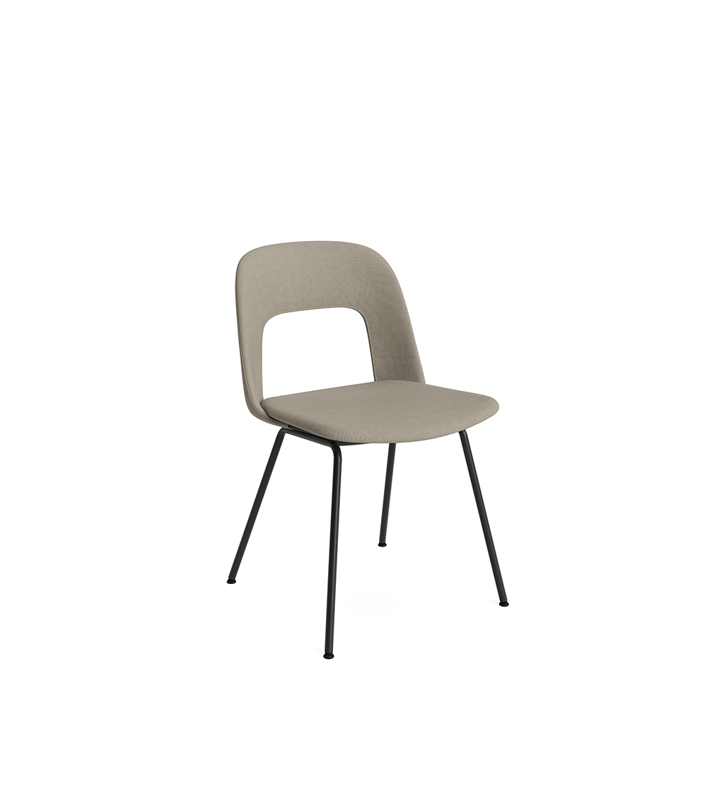 LAYOUT 113 – kėdės versija plastiko atlošu, audiniu arba oda vilkta sėdimąja dalimi bei plieno kojelėmis.