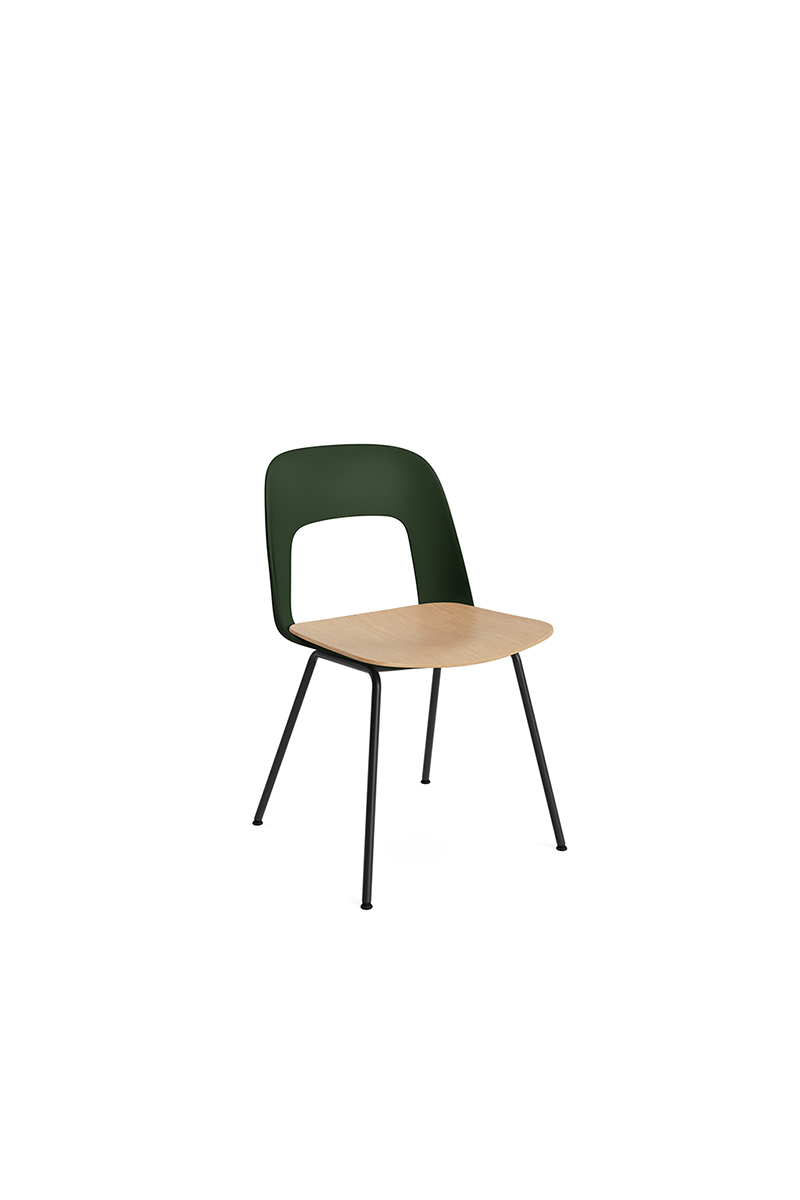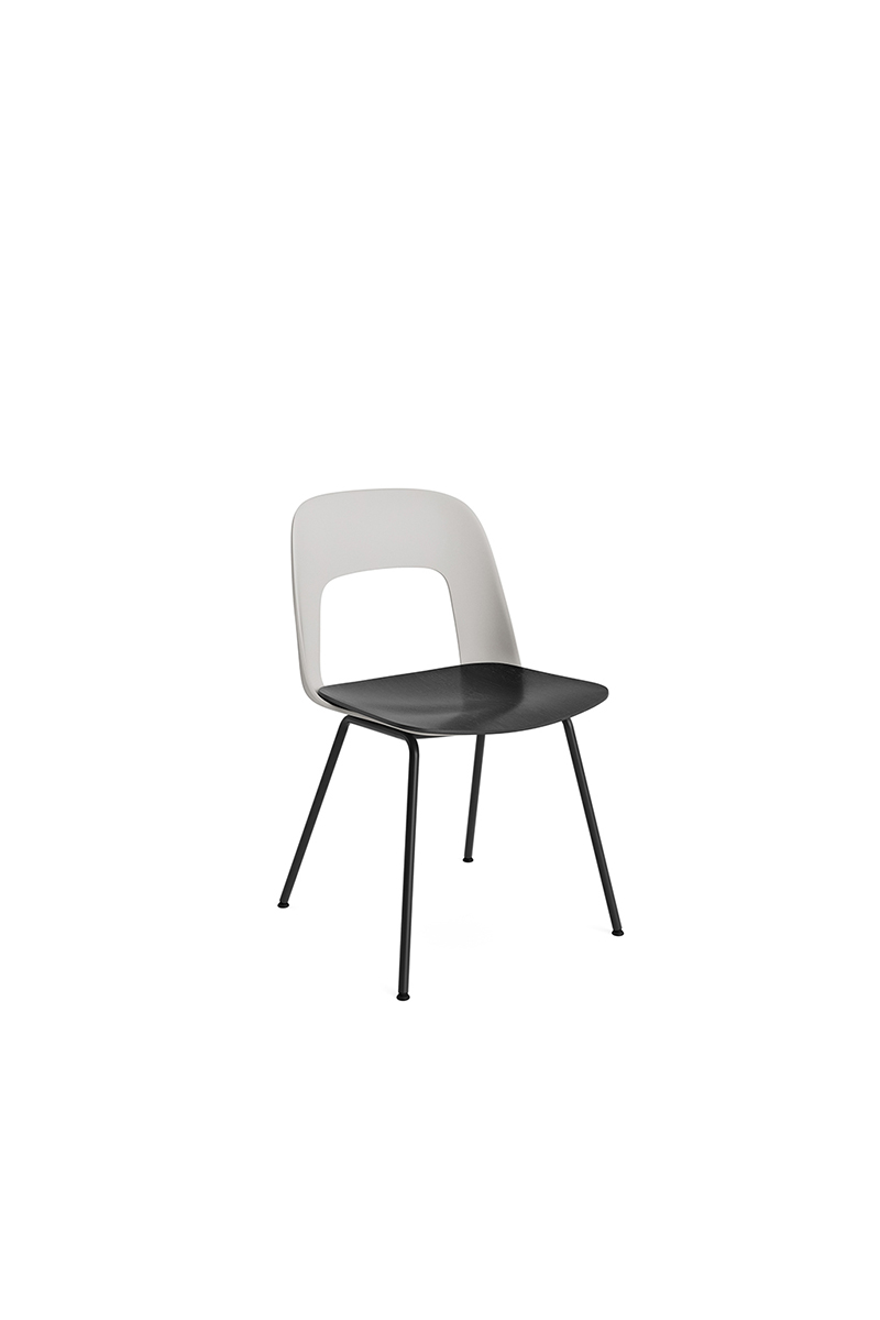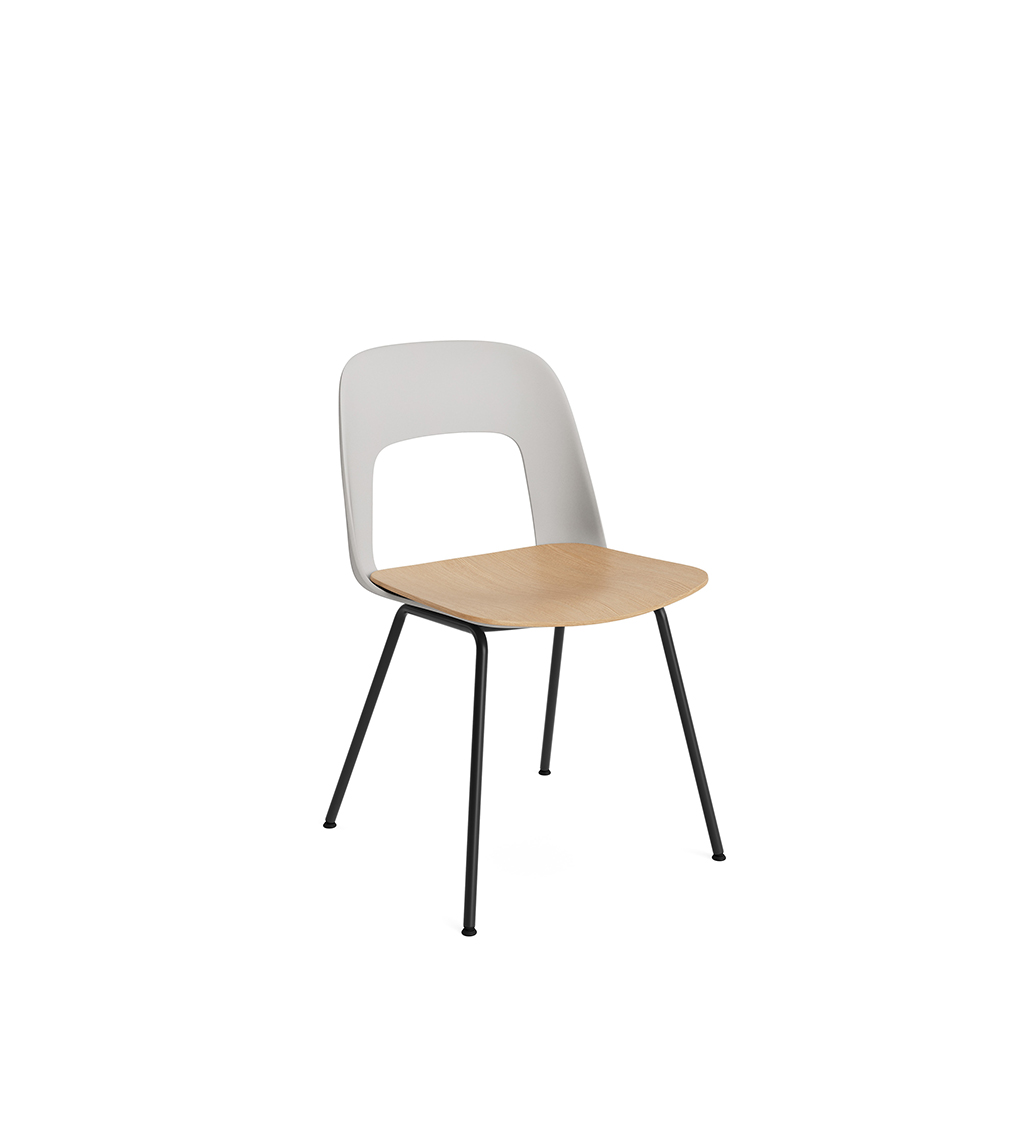 LAYOUT 112 – kėdės versija plastiko atlošu, medžio lukšto sėdimąja dalimi bei plieno kojelėmis.