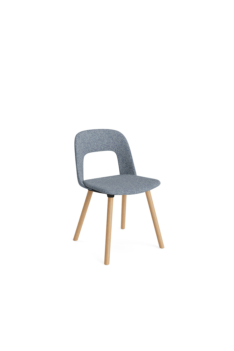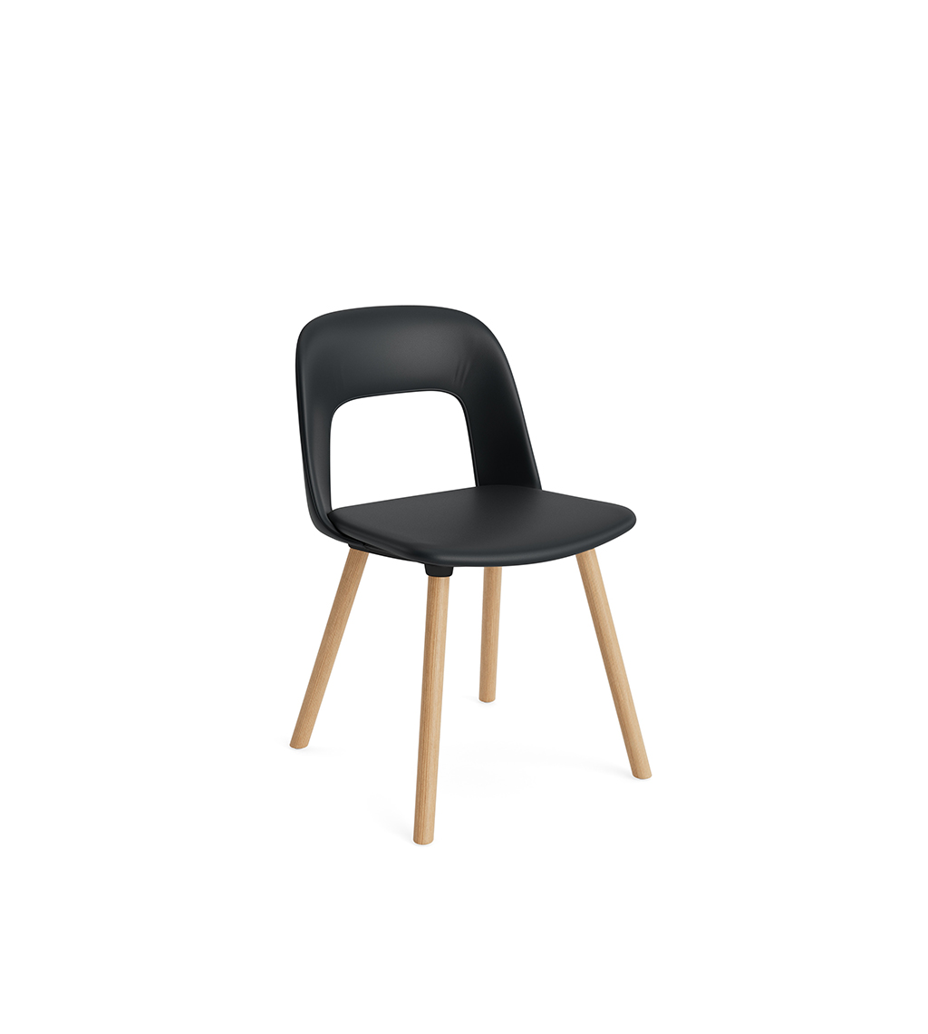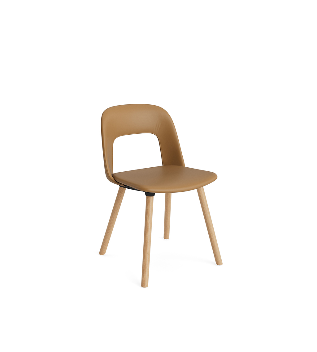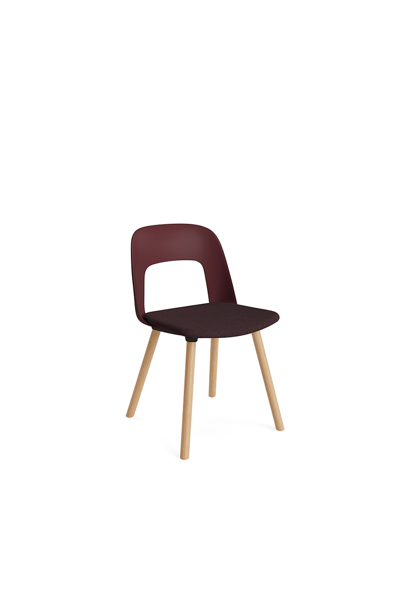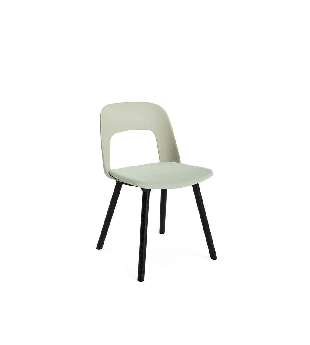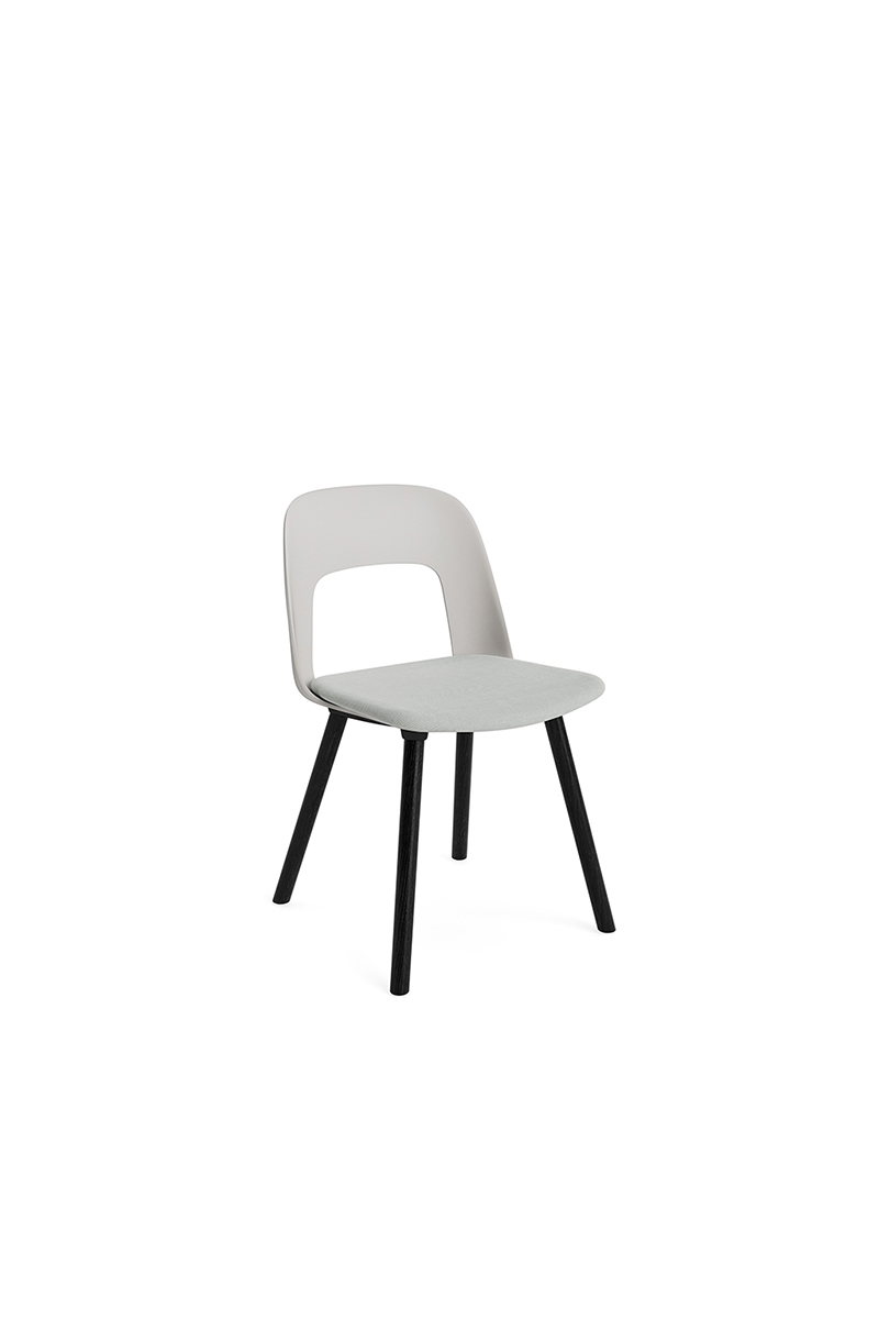 LAYOUT 123 – kėdės versija plastiko atlošu, audiniu arba oda vilkta sėdimąja dalimi bei medžio kojelėmis.
