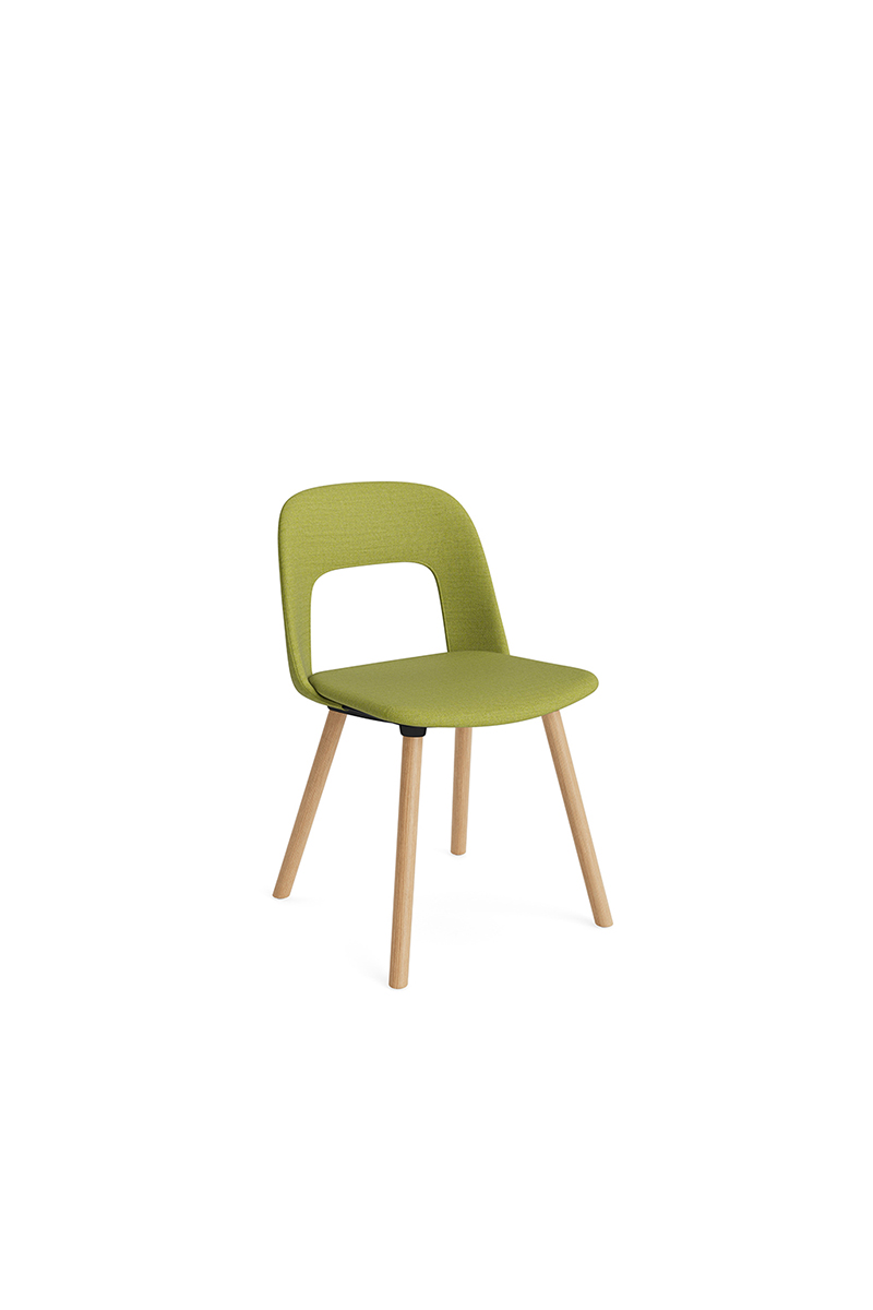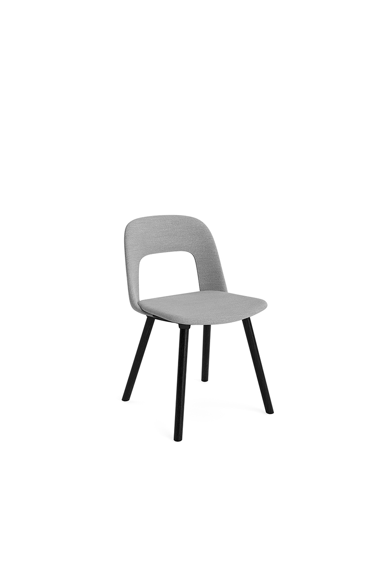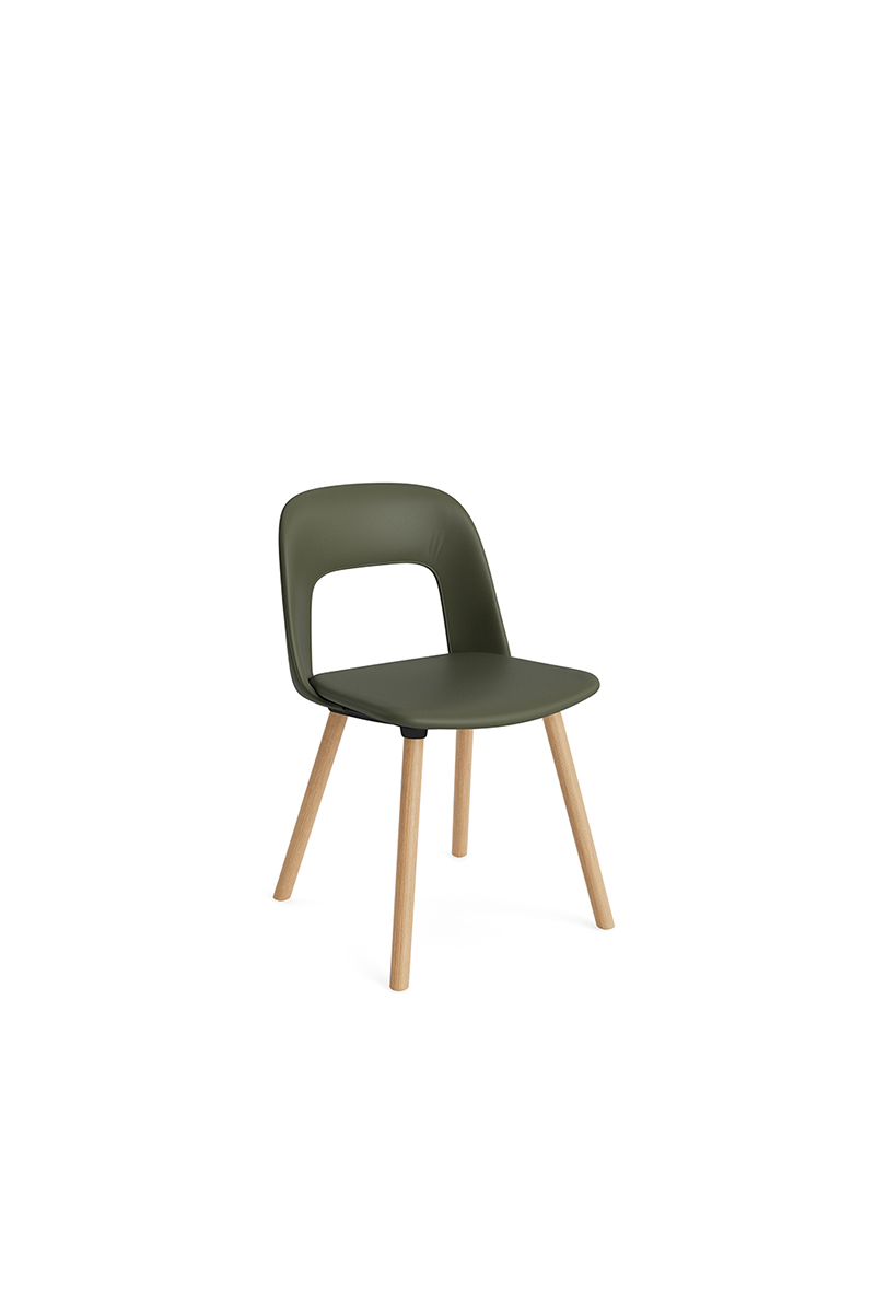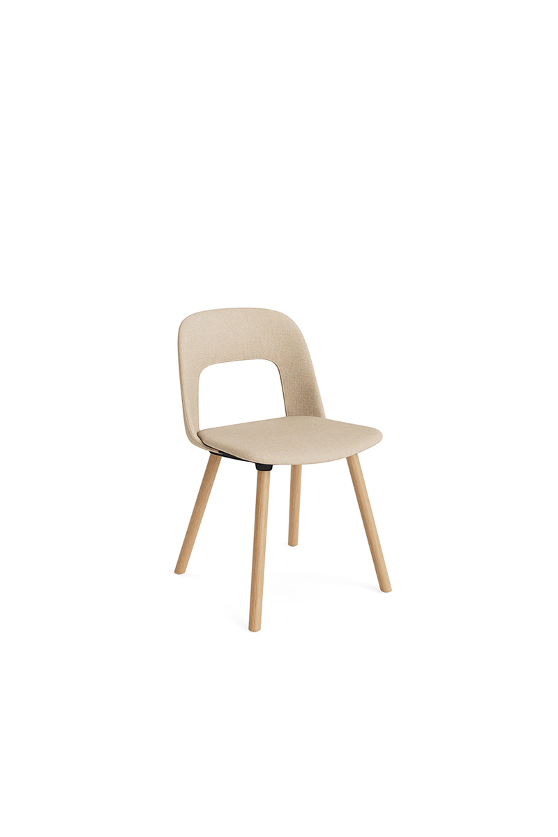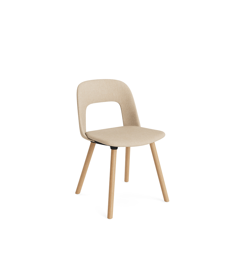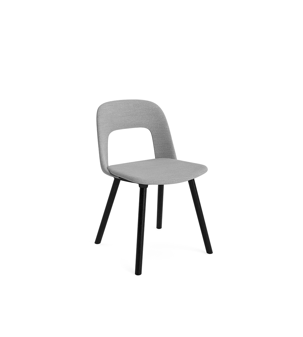 LAYOUT 123 – kėdės versija plastiko atlošu, audiniu arba oda vilkta sėdimąja dalimi bei medžio kojelėmis.