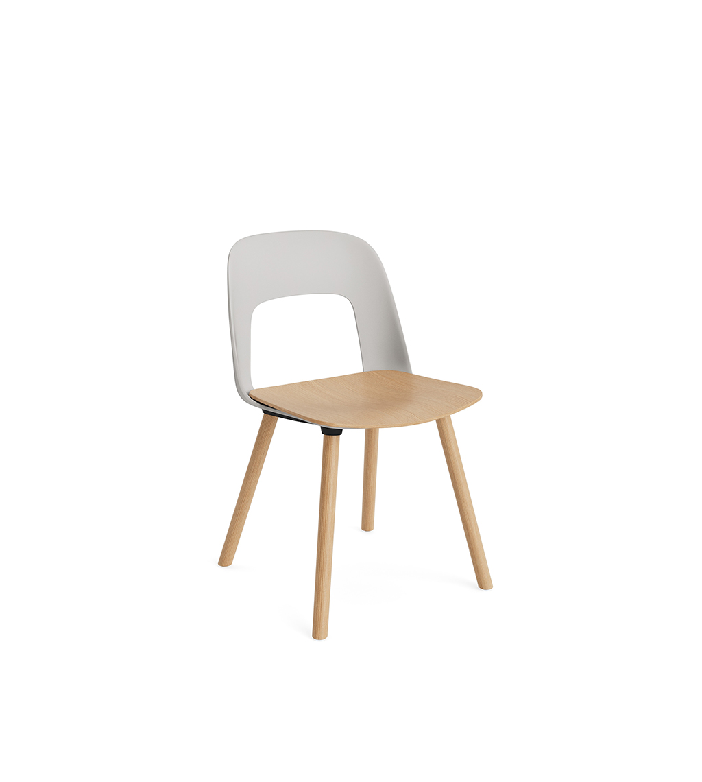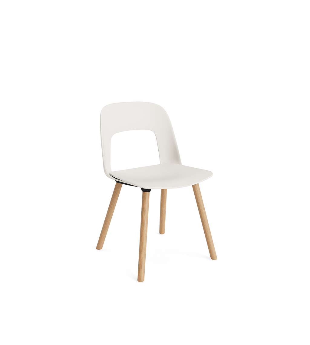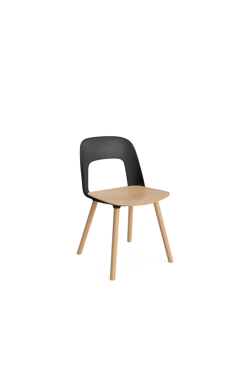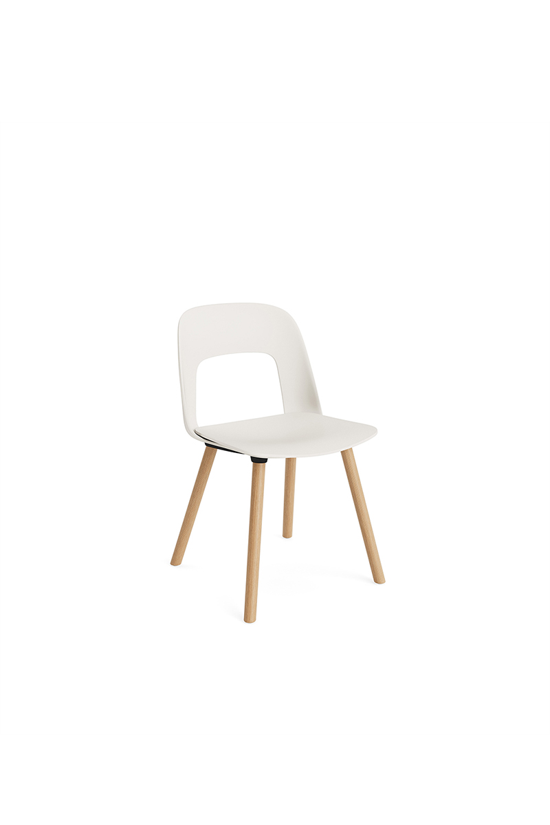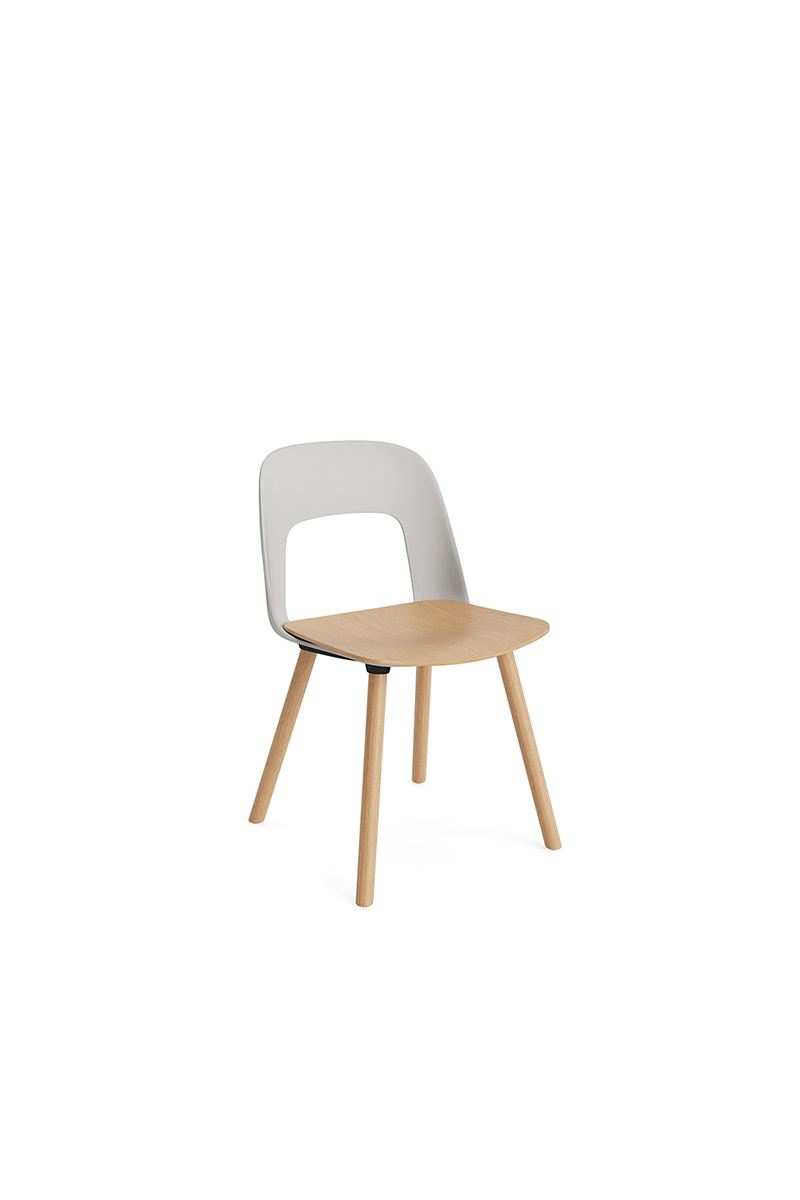 LAYOUT 112 – kėdės versija plastiko atlošu, medžio lukšto sėdimąja dalimi bei medžio kojelėmis.