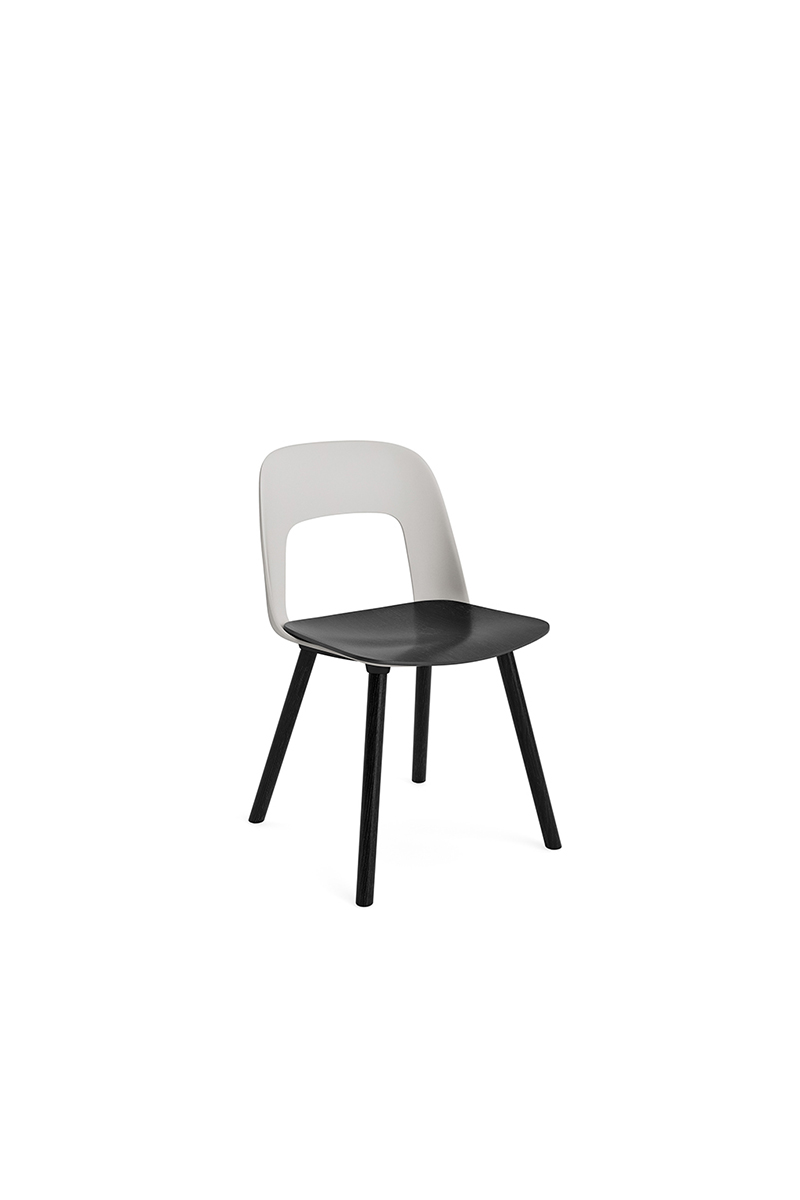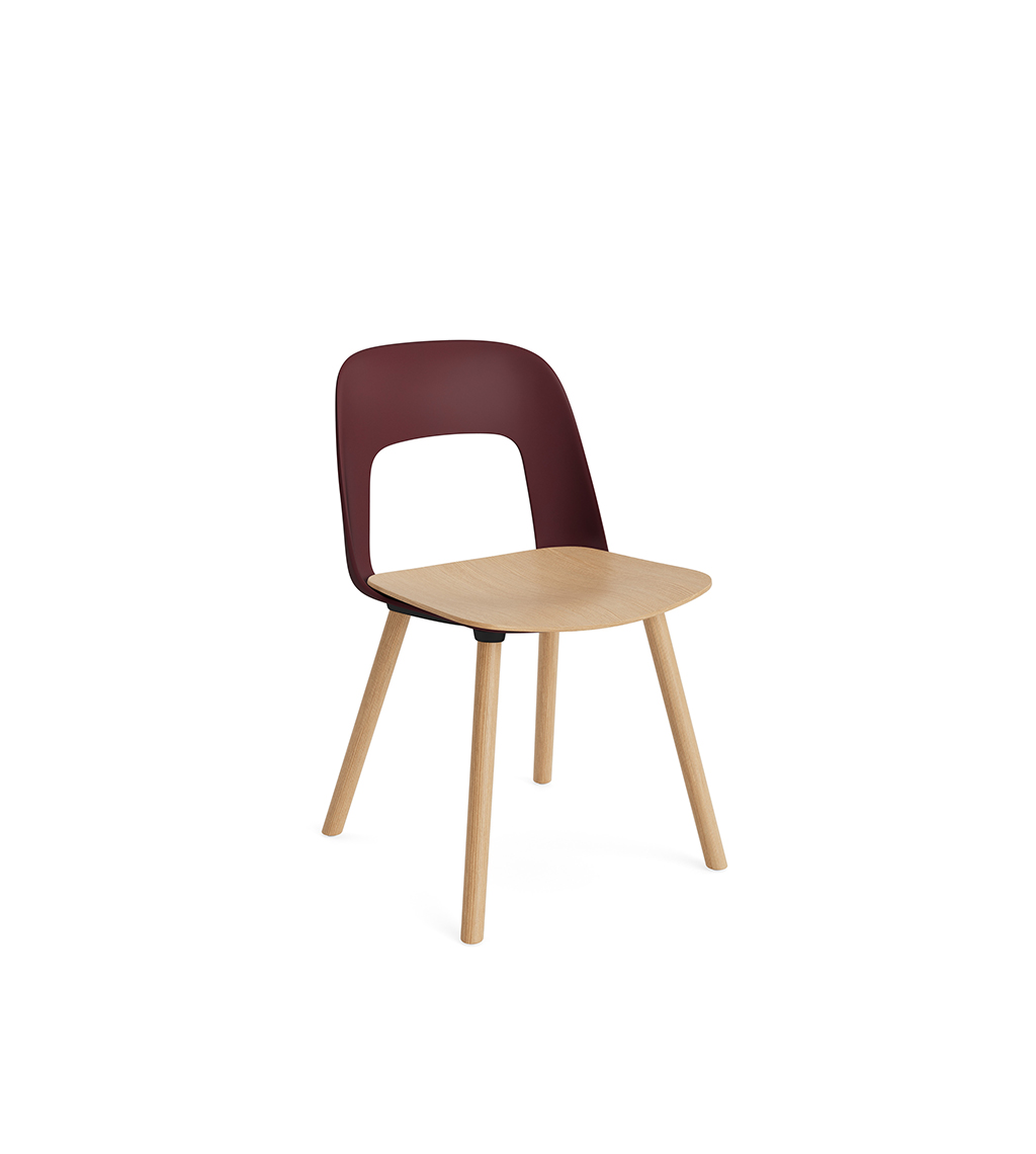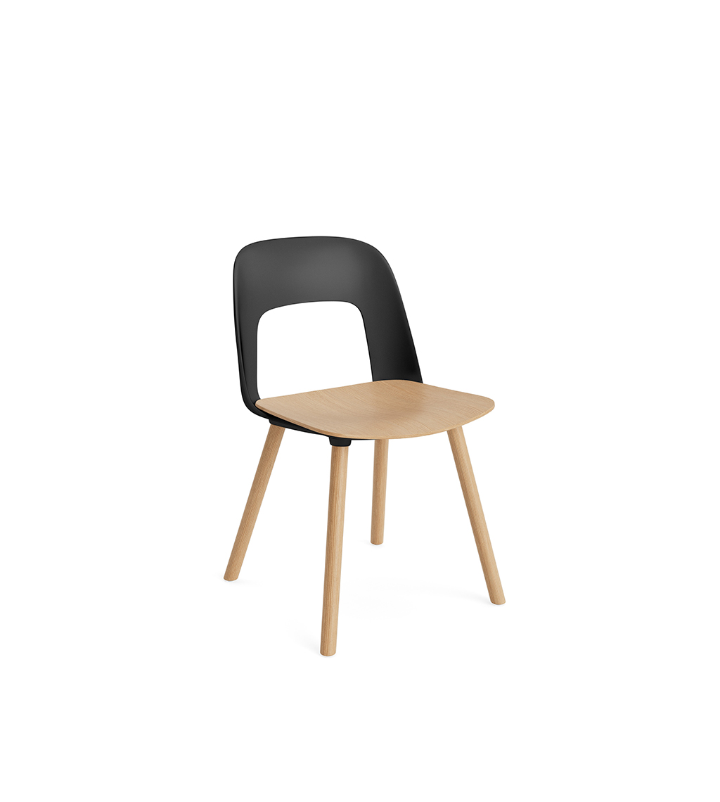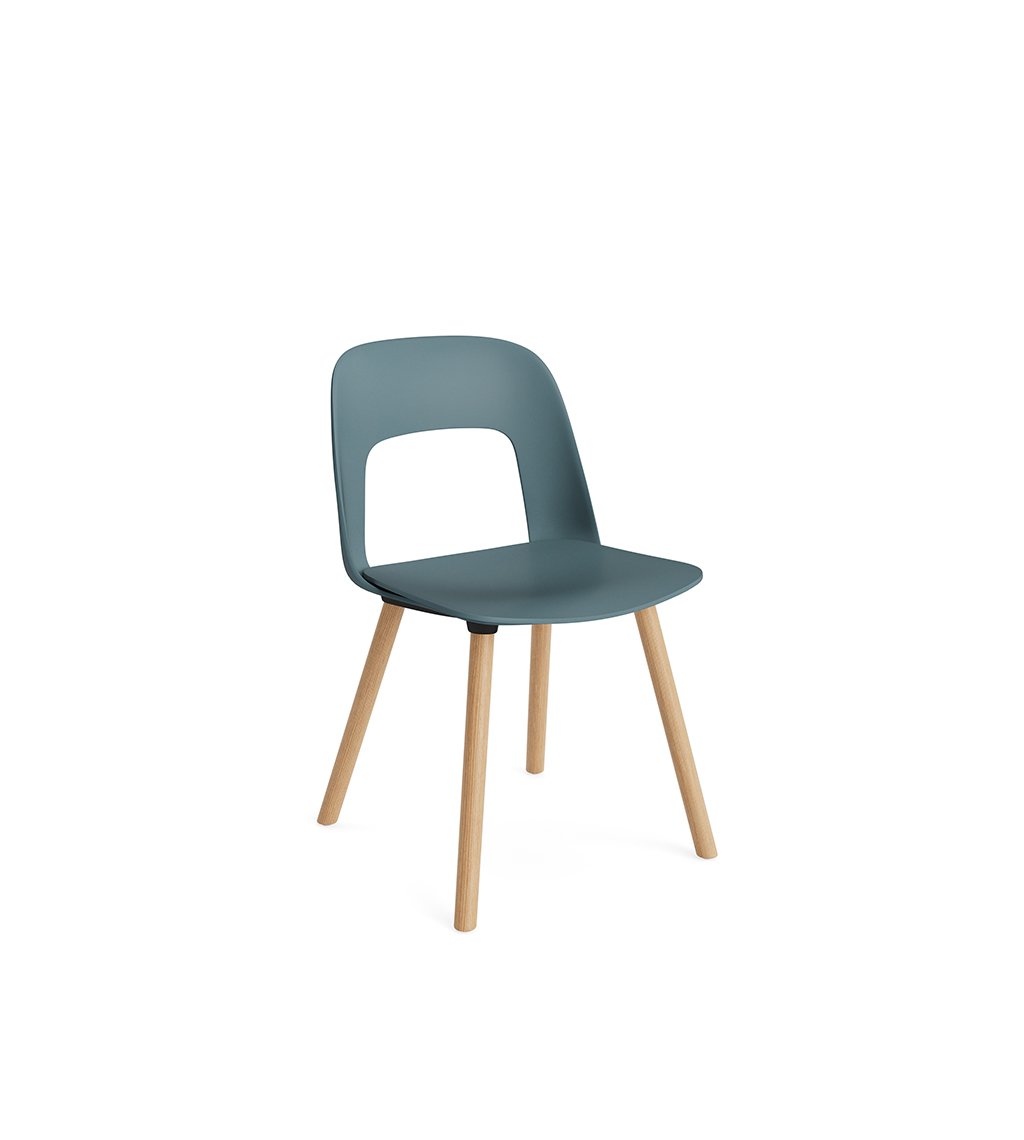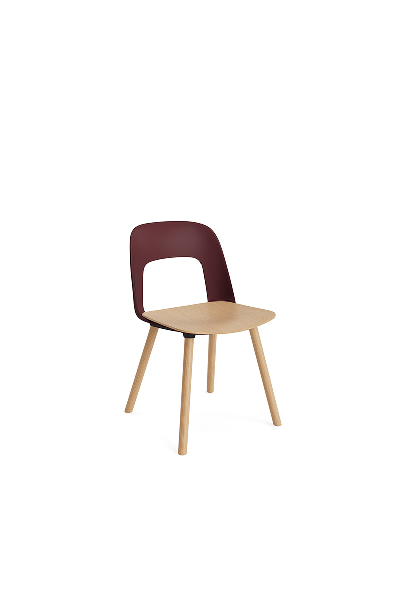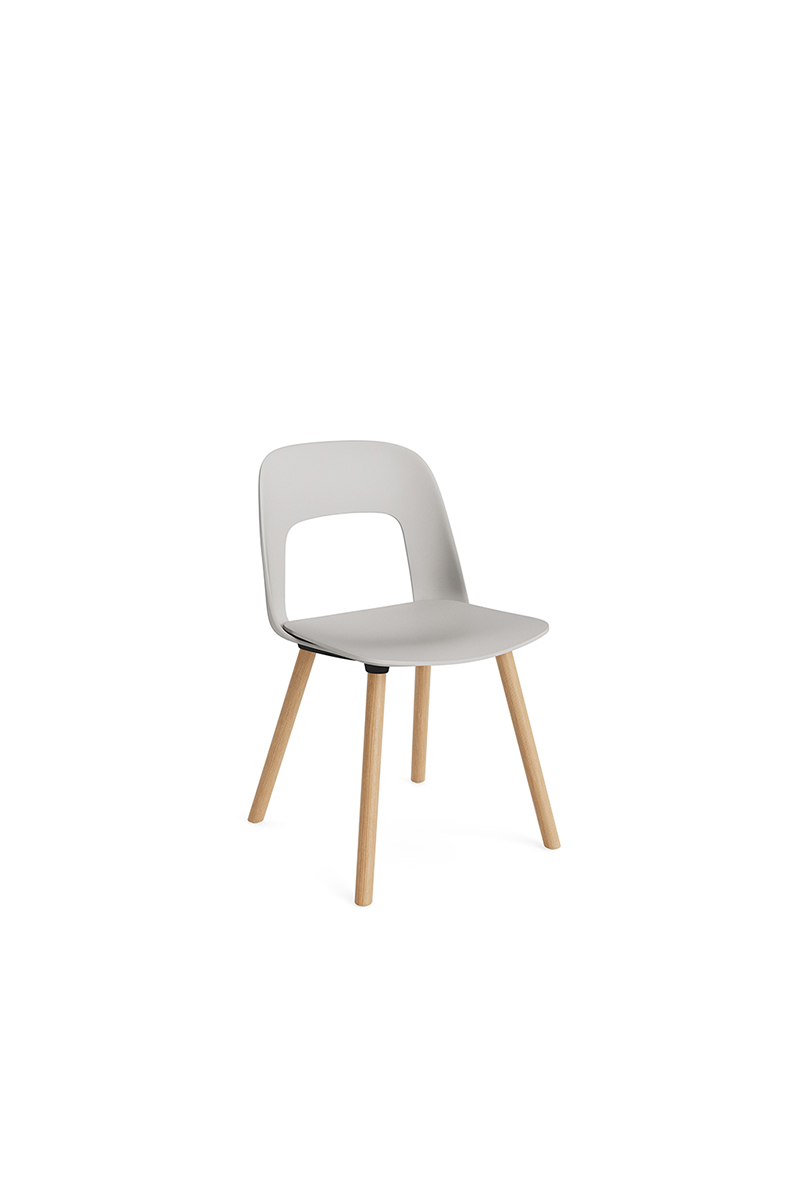 LAYOUT 112 – kėdės versija plastiko atlošu, medžio lukšto sėdimąja dalimi bei medžio kojelėmis.