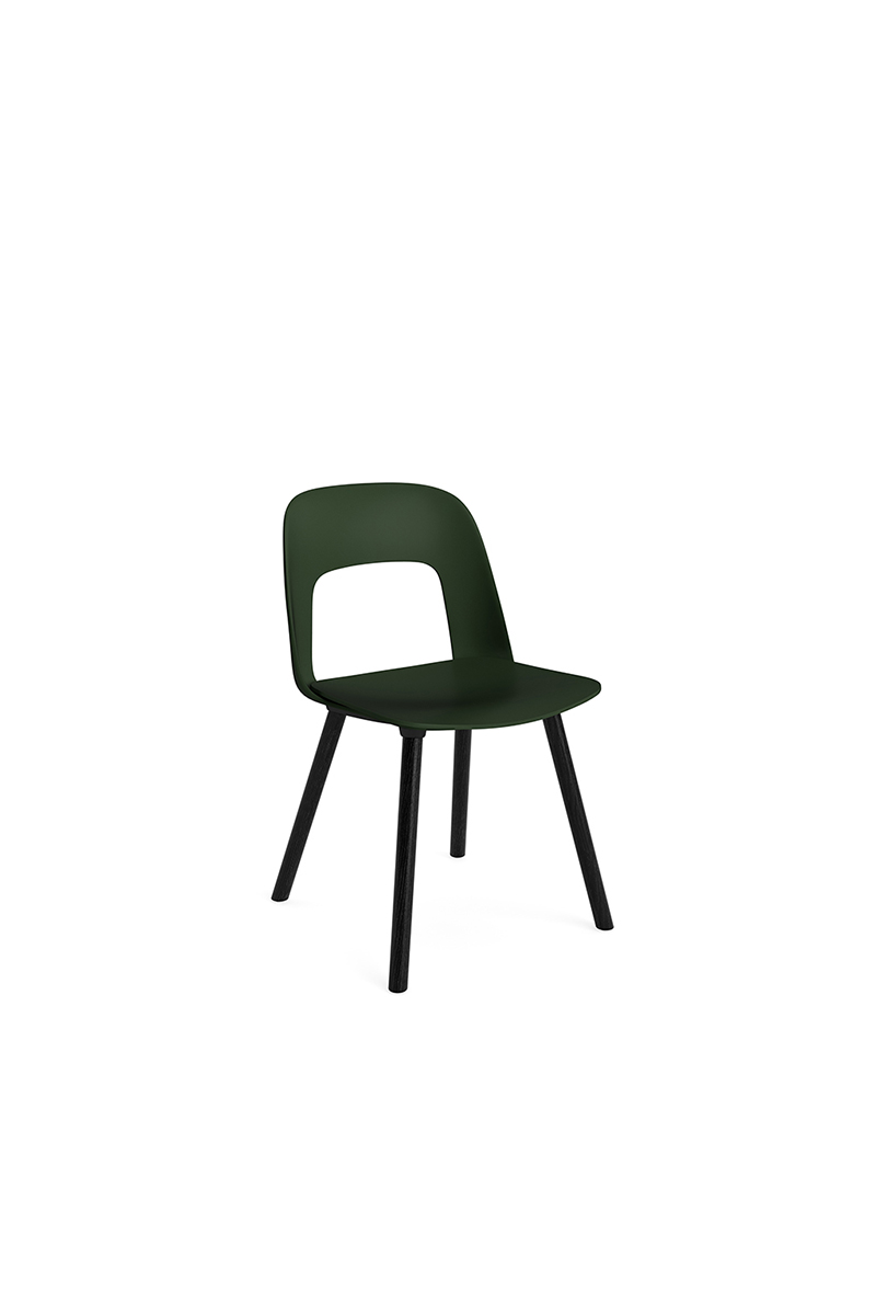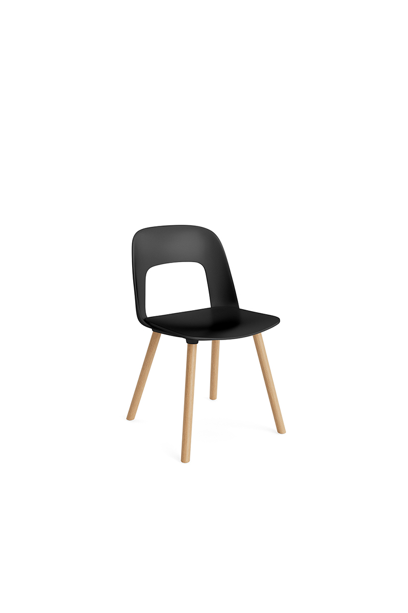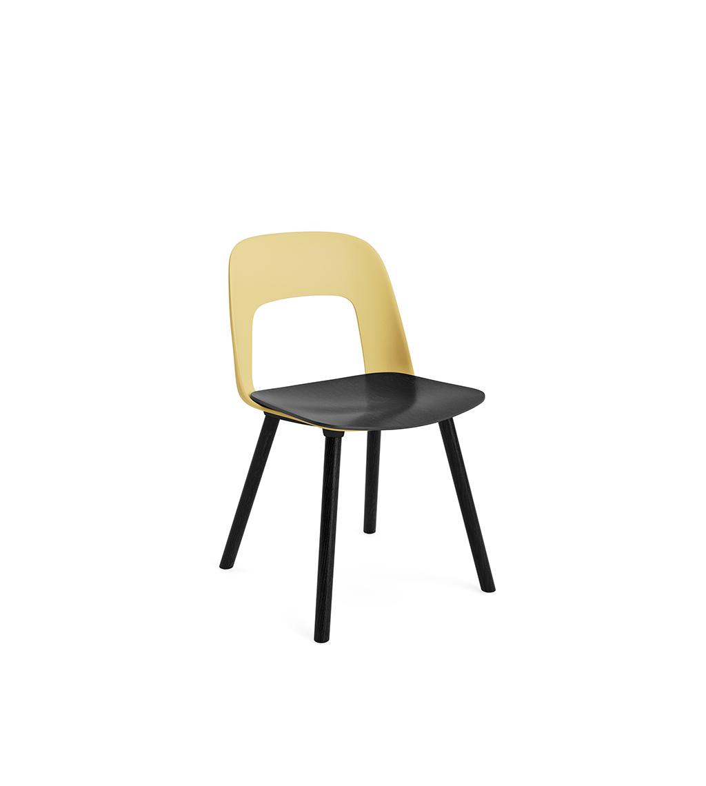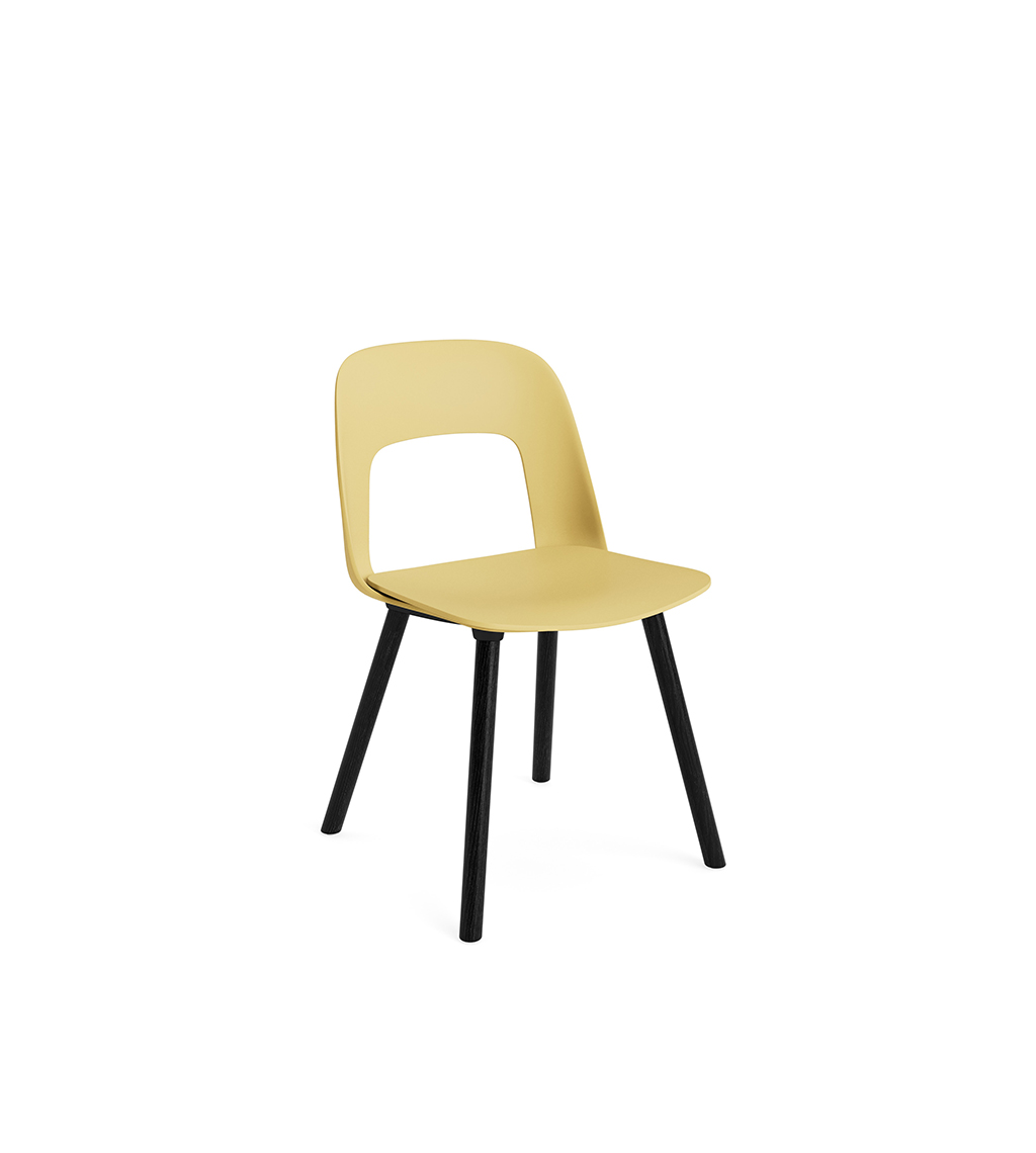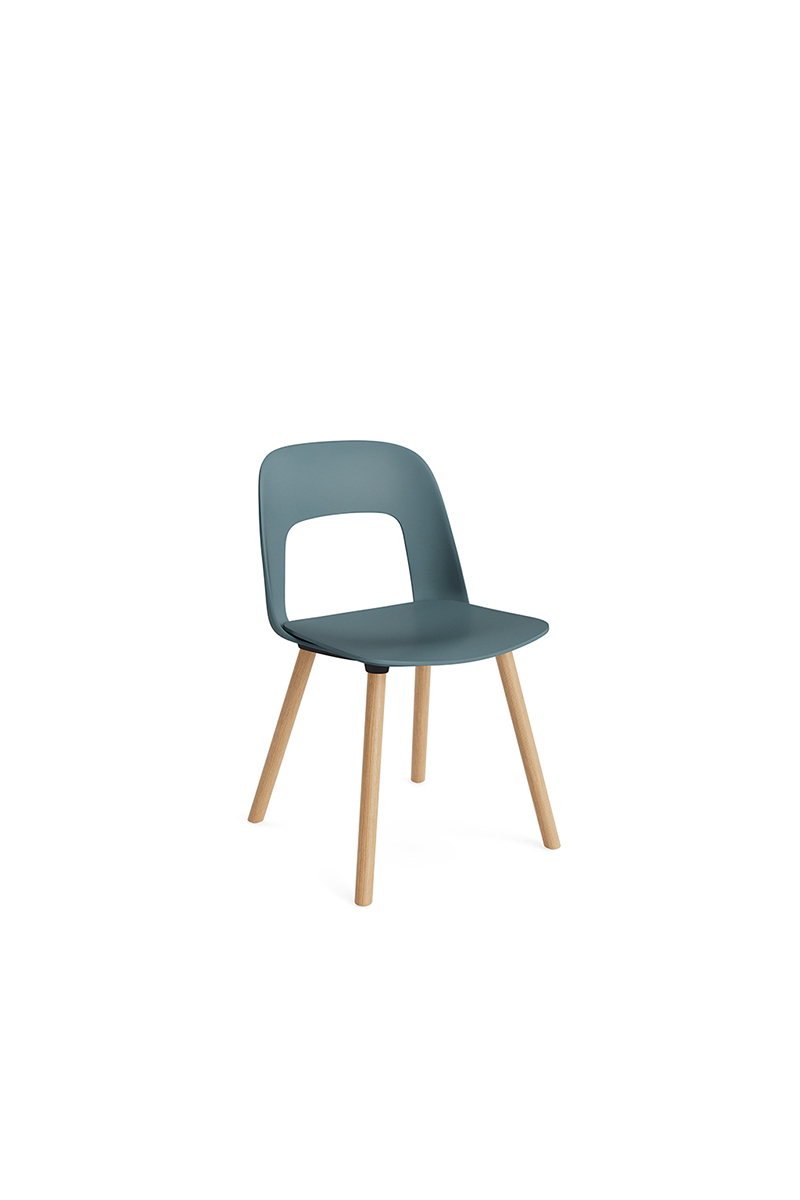 LAYOUT 112 – kėdės versija plastiko atlošu, medžio lukšto sėdimąja dalimi bei medžio kojelėmis.