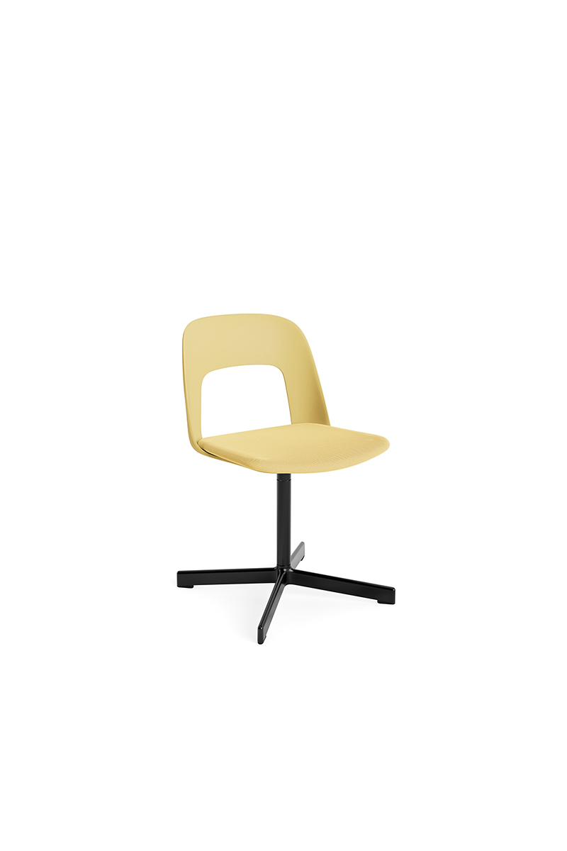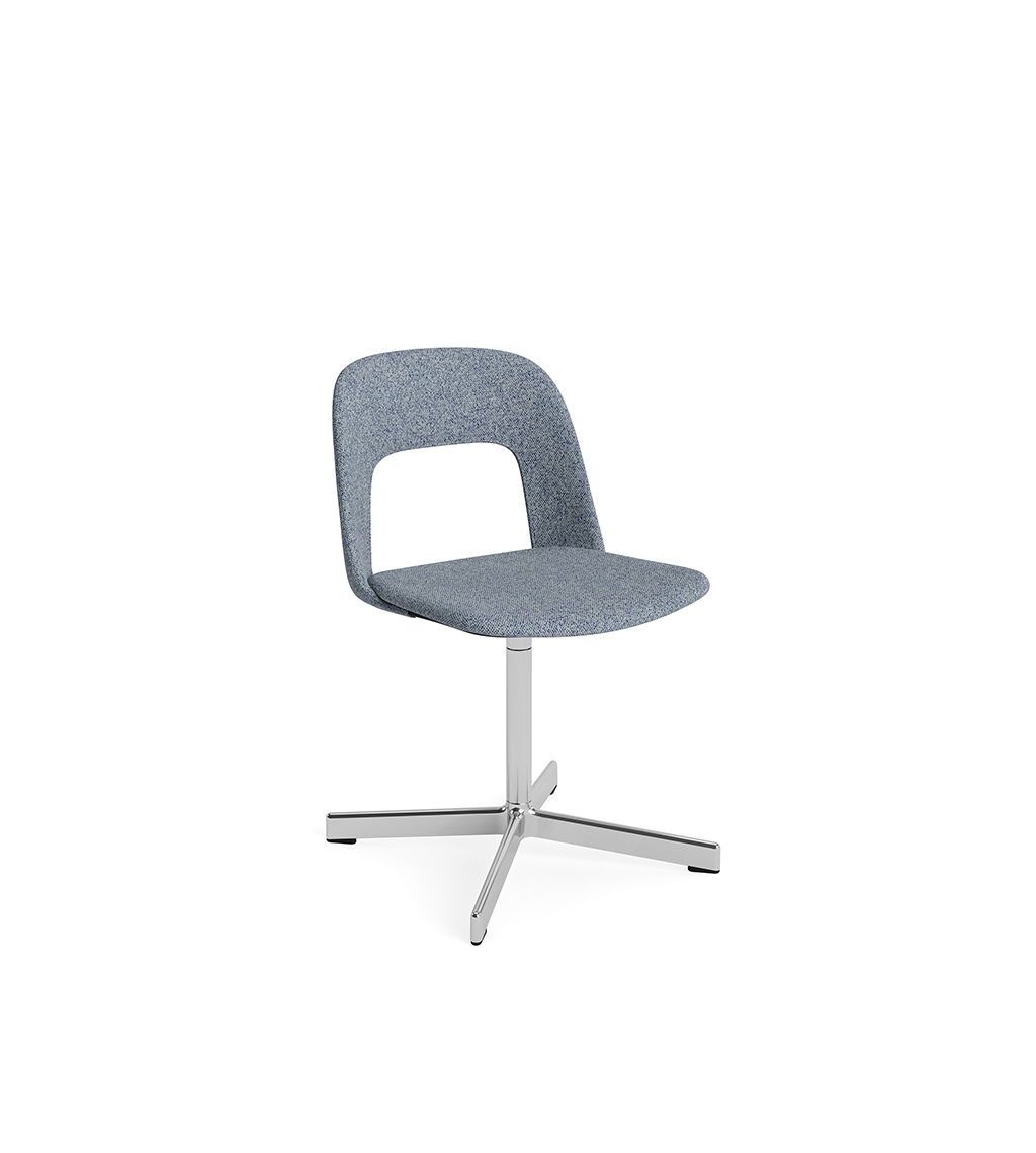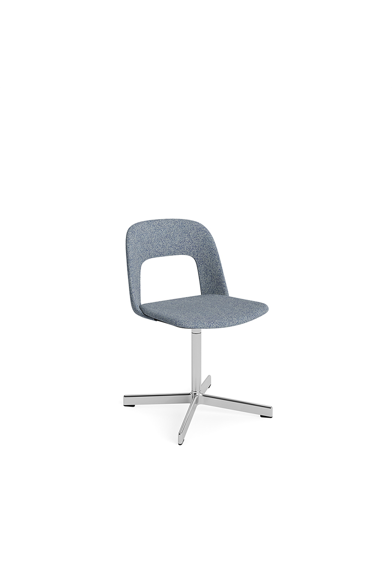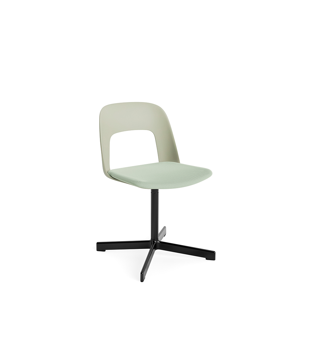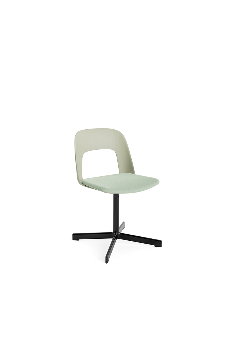 LAYOUT 133 – kėdės versija plastiko atlošu, audiniu arba oda vilkta sėdimąja dalimi bei sukama aliuminio baze.