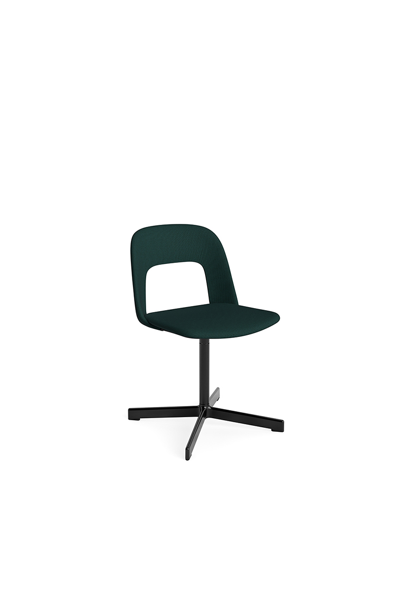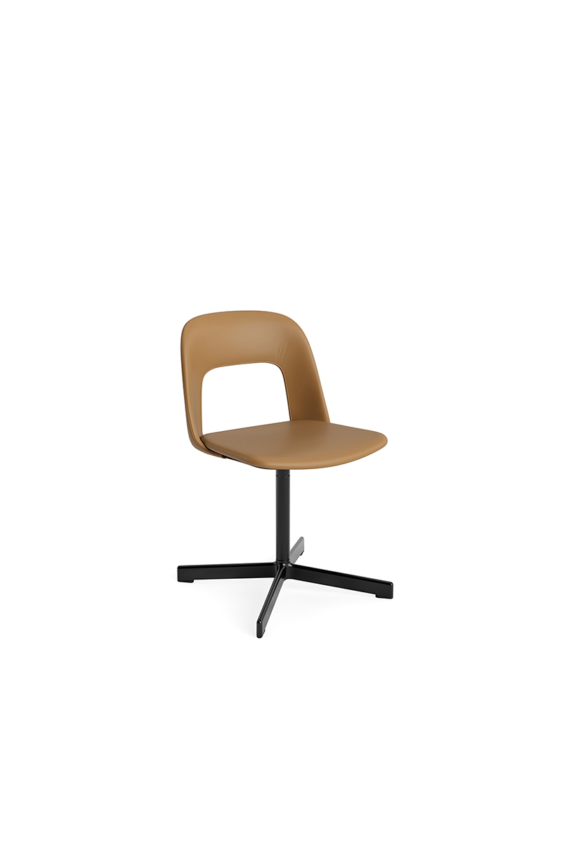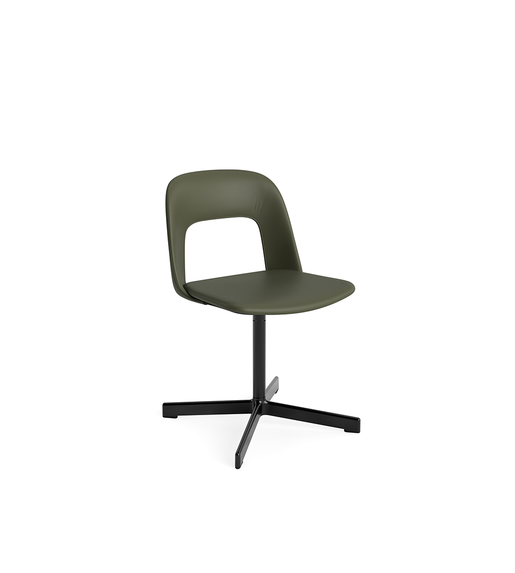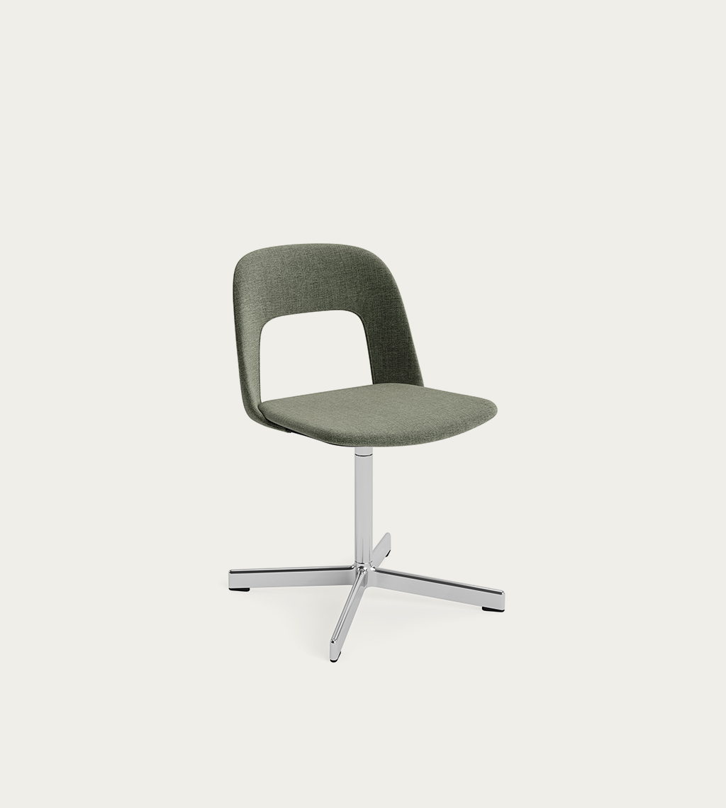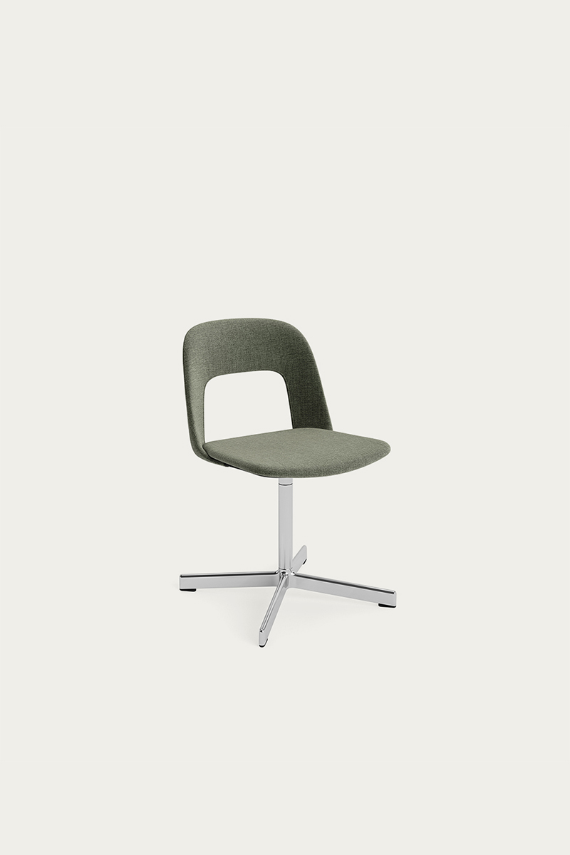 LAYOUT 133 – kėdės versija plastiko atlošu, audiniu arba oda vilkta sėdimąja dalimi bei sukama aliuminio baze.