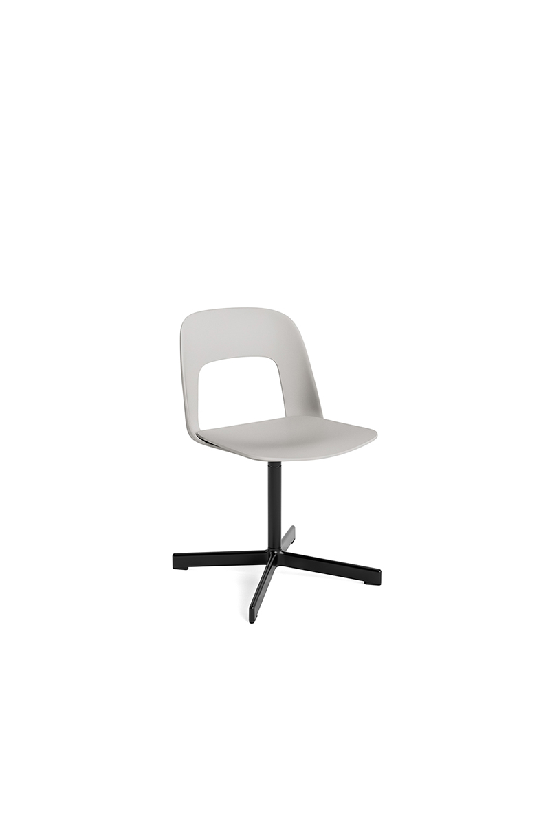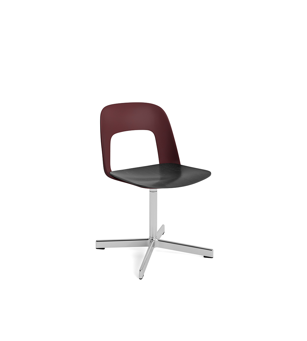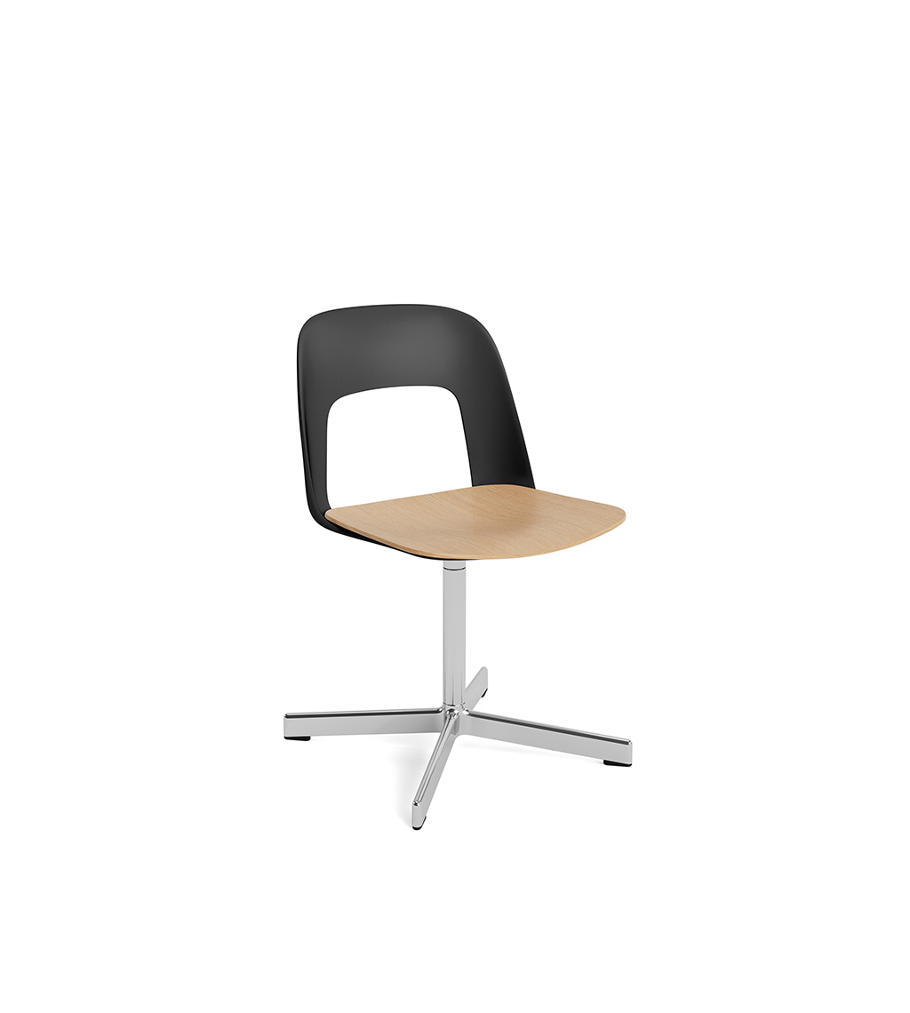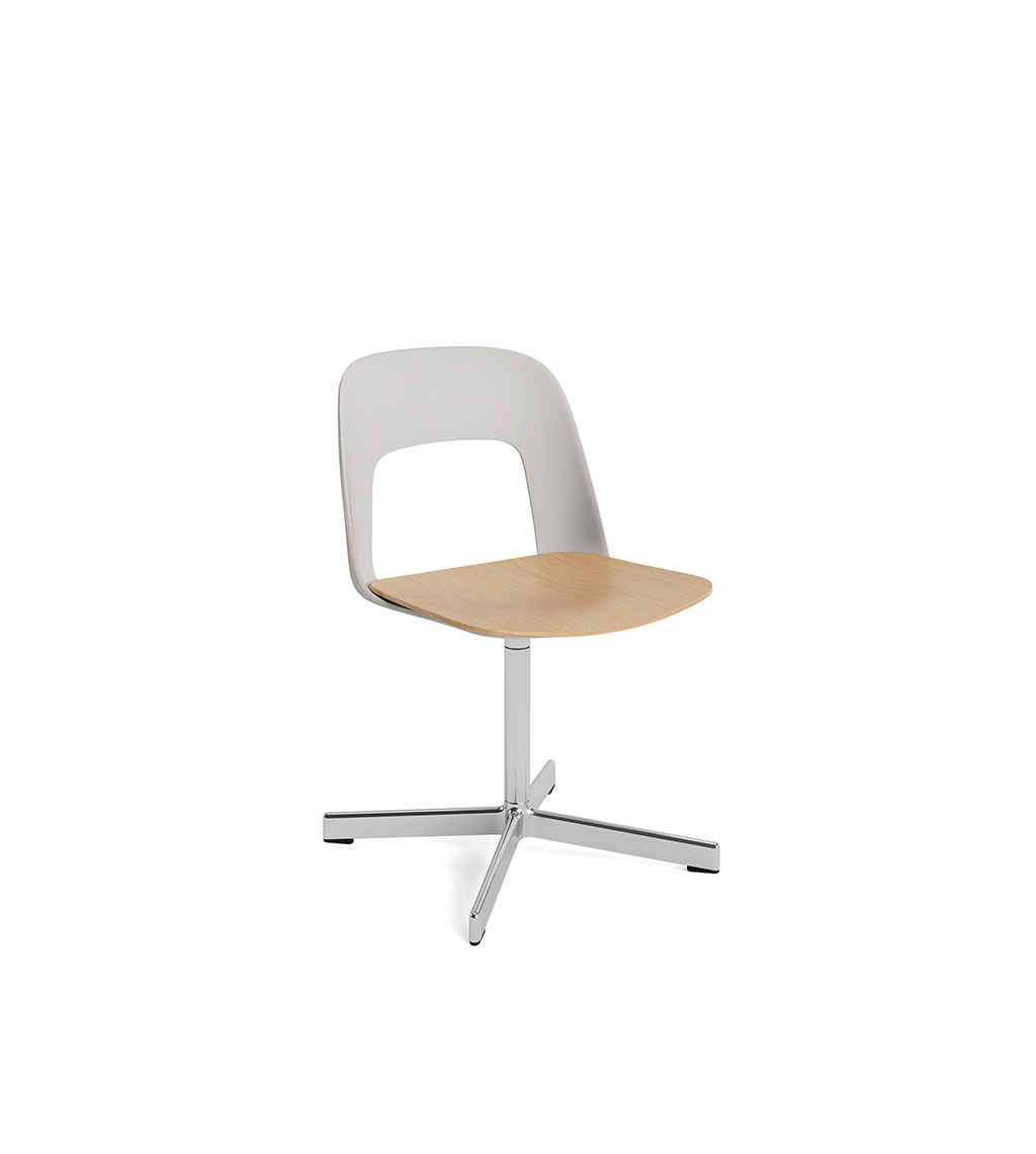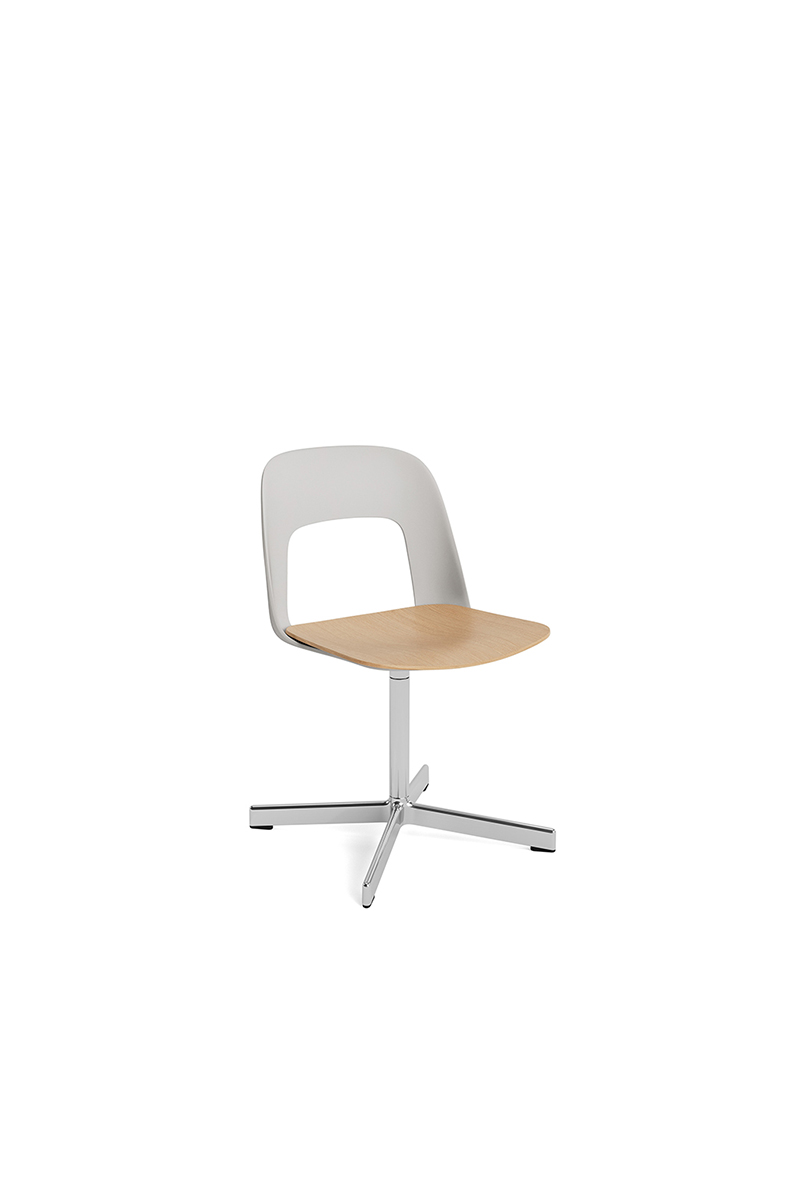 LAYOUT 132 – kėdės versija plastiko atlošu, medžio lukšto sėdimąja dalimi bei sukama aliuminio baze.