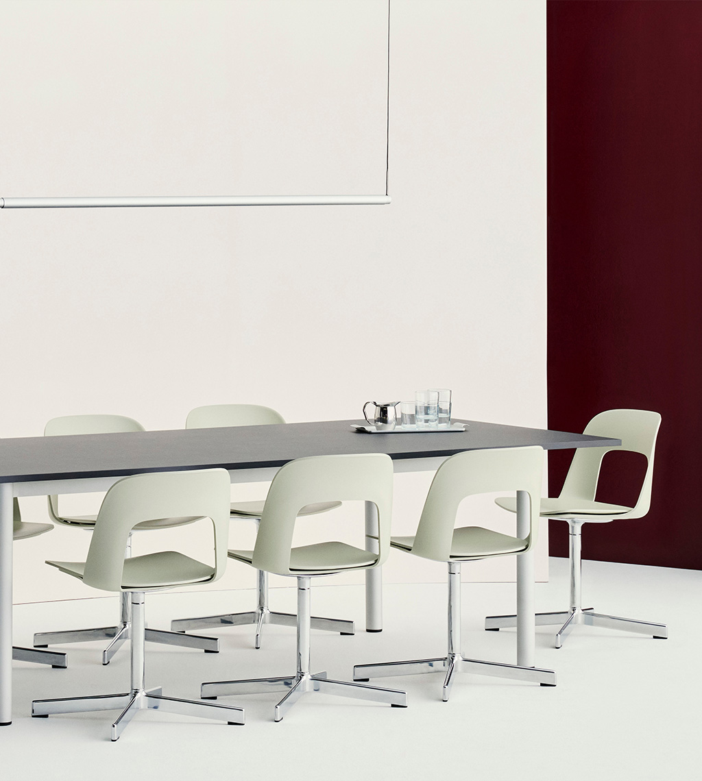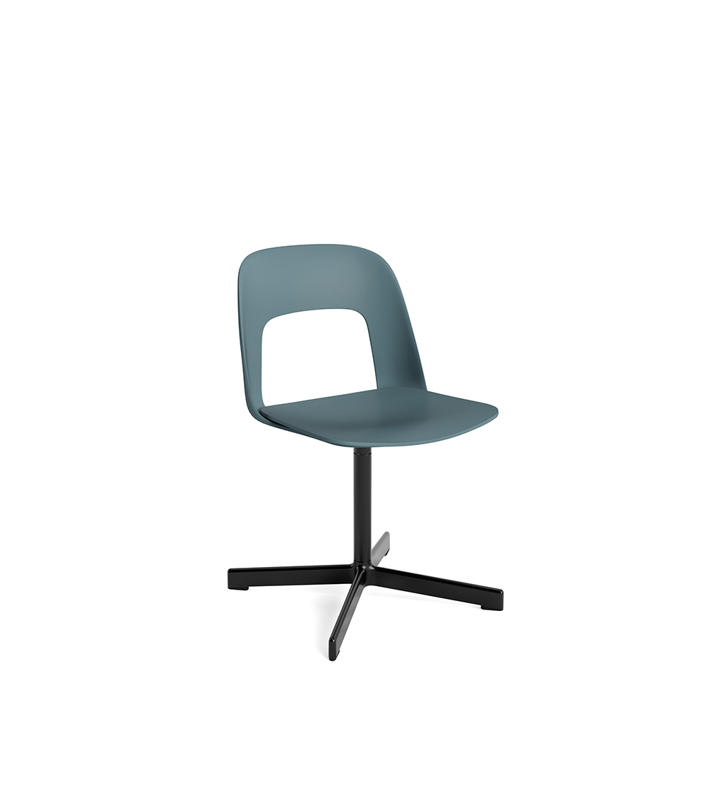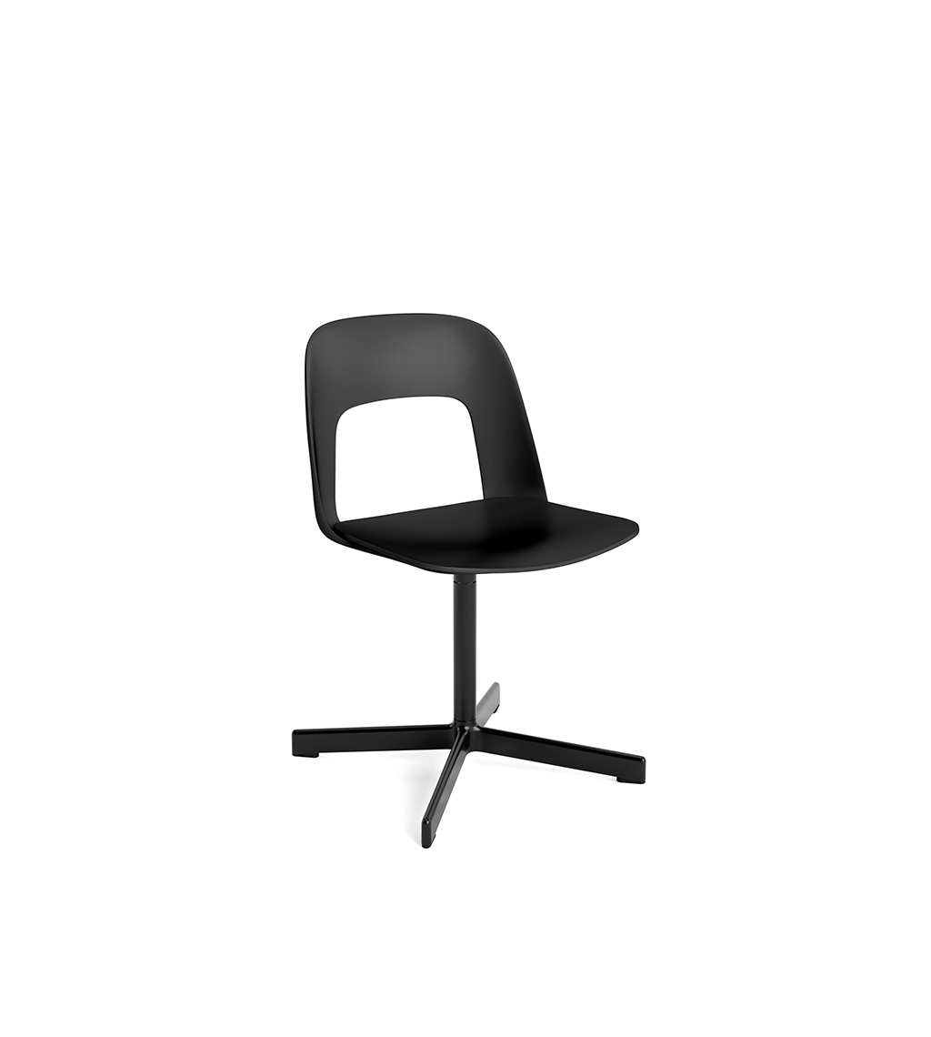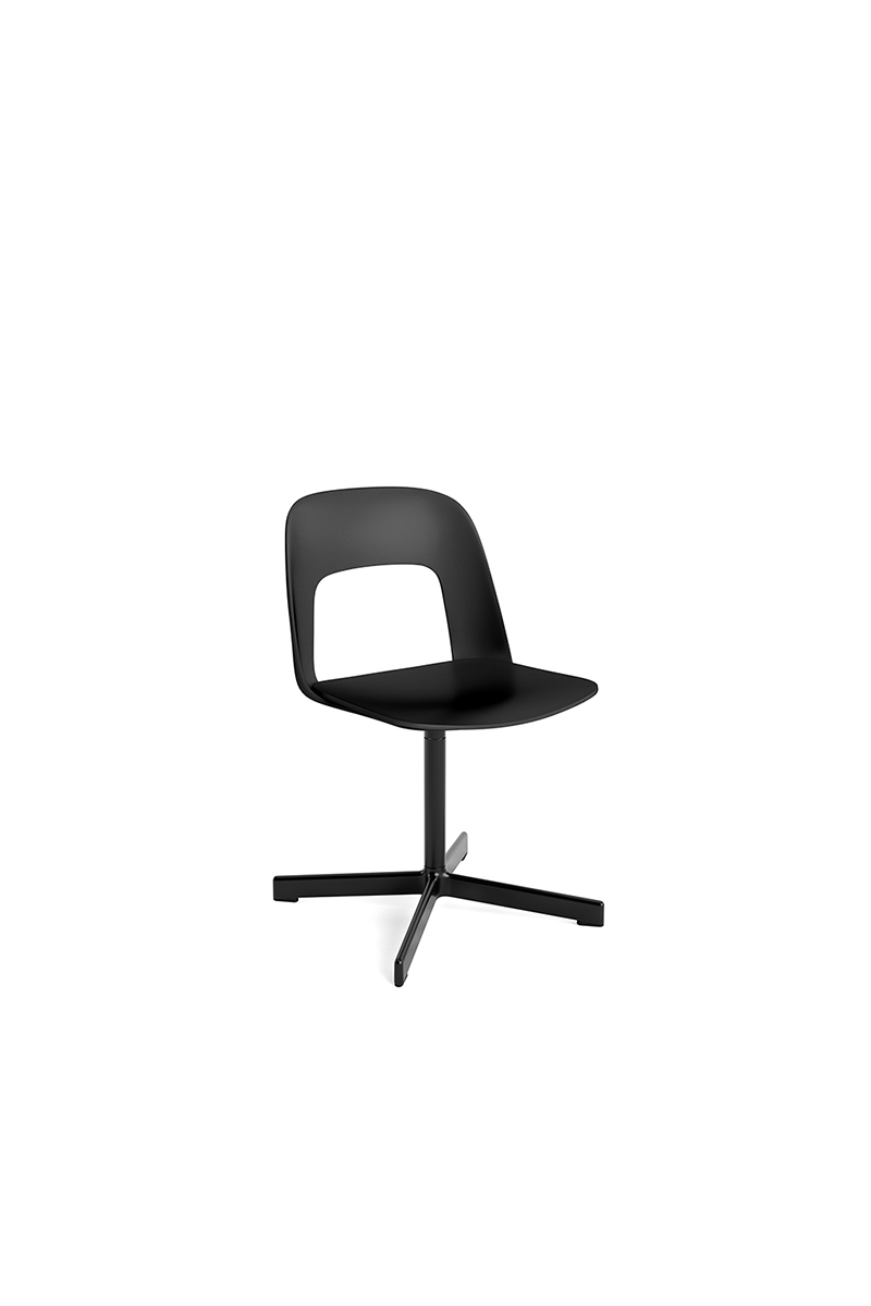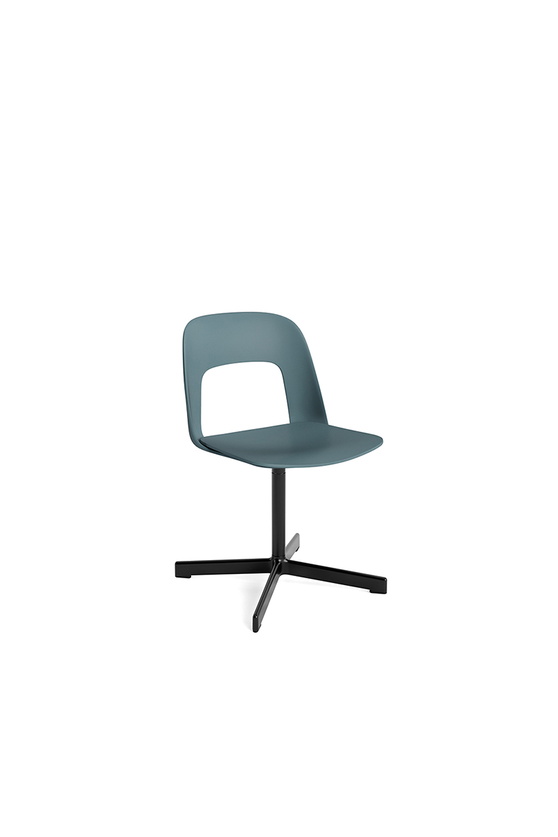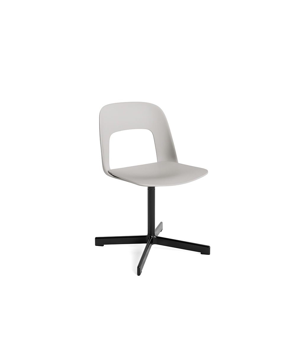 LAYOUT 132 – kėdės versija plastiko atlošu, medžio lukšto sėdimąja dalimi bei sukama aliuminio baze.