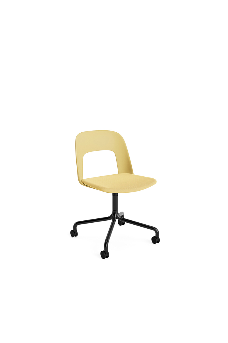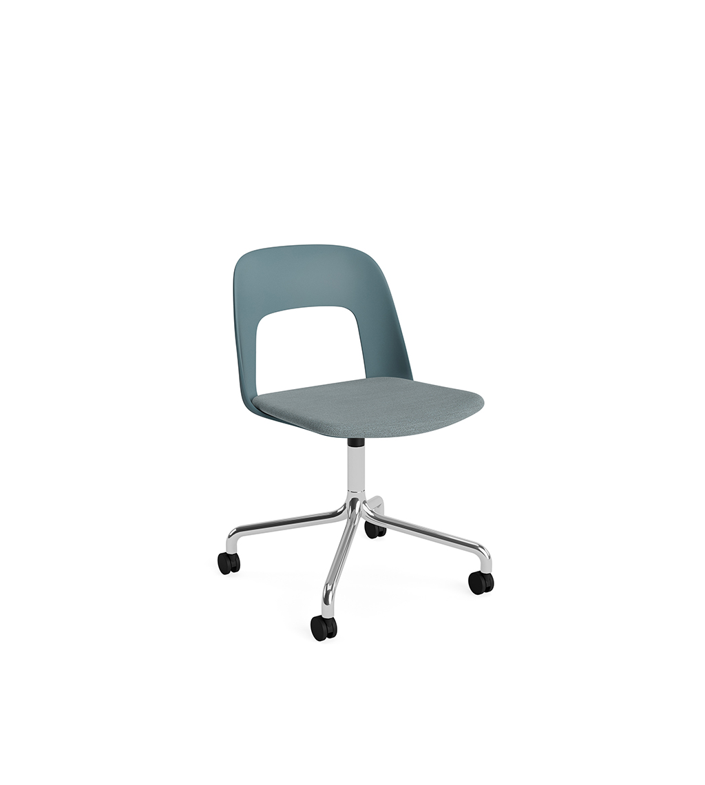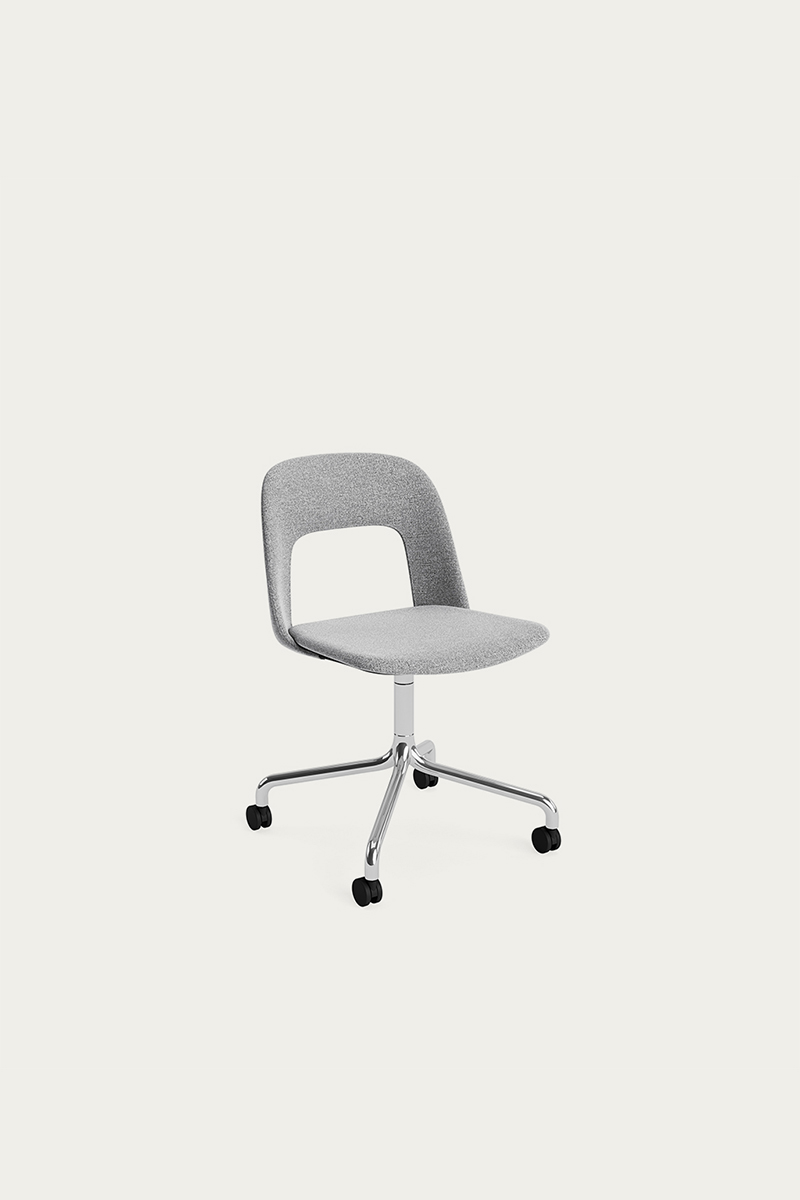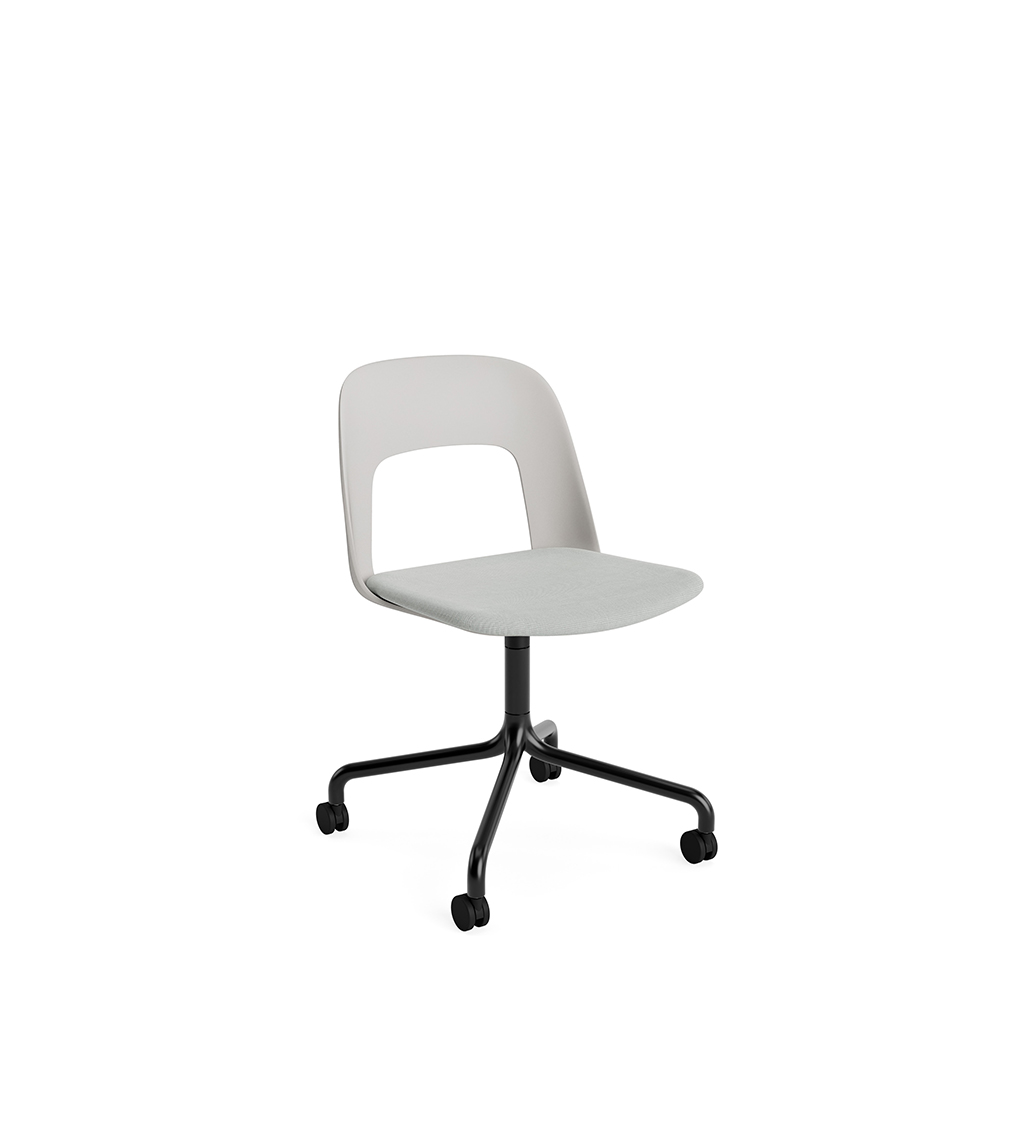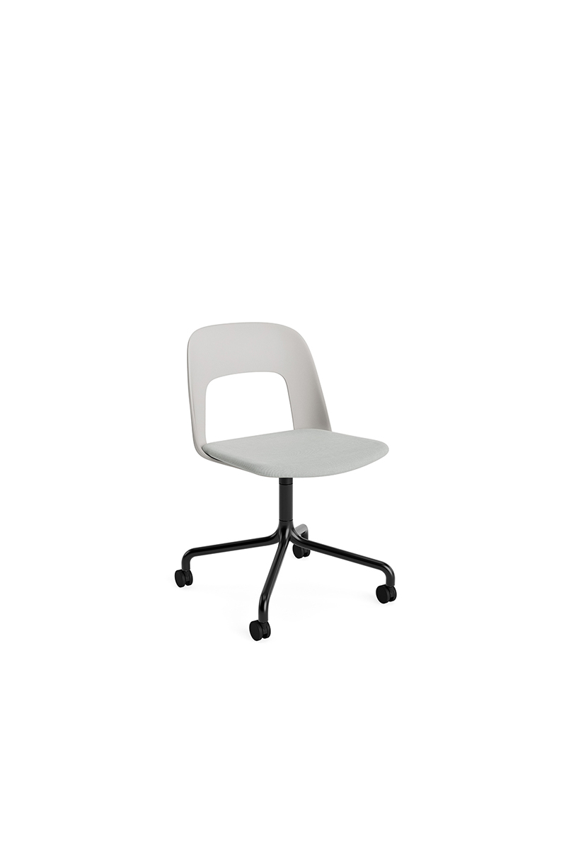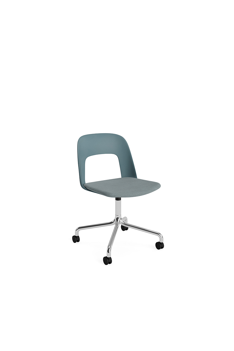 LAYOUT 163 – kėdės versija plastiko atlošu, audiniu arba oda vilkta sėdimąja dalimi bei sukama aliuminio baze.