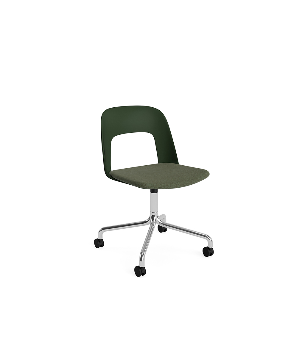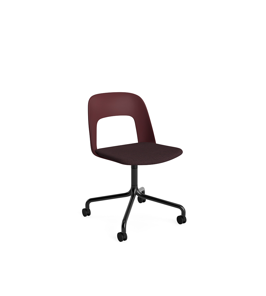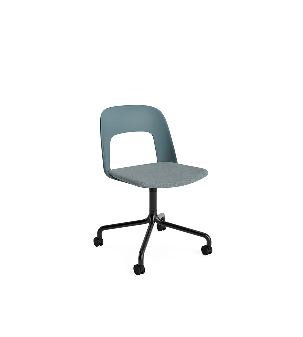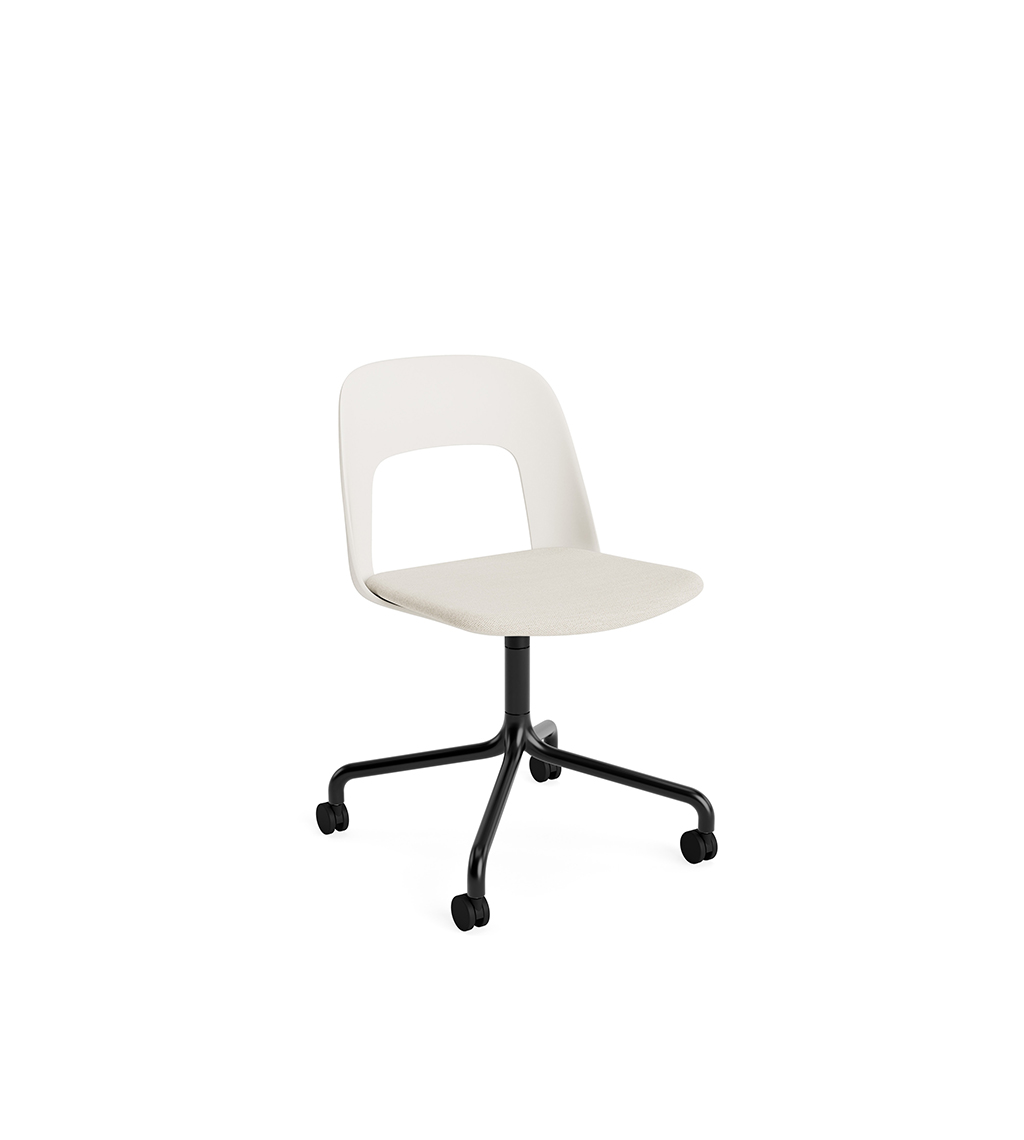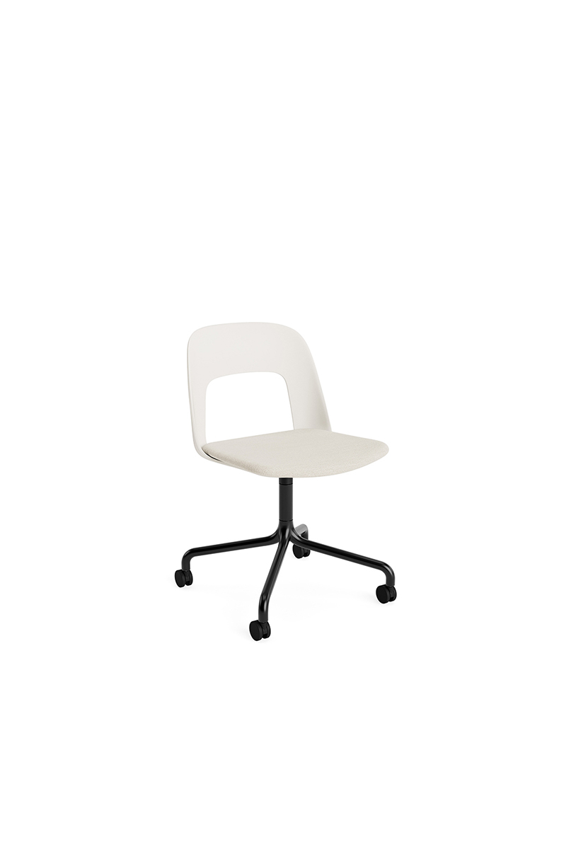 LAYOUT 163 – kėdės versija plastiko atlošu, audiniu arba oda vilkta sėdimąja dalimi bei sukama aliuminio baze.