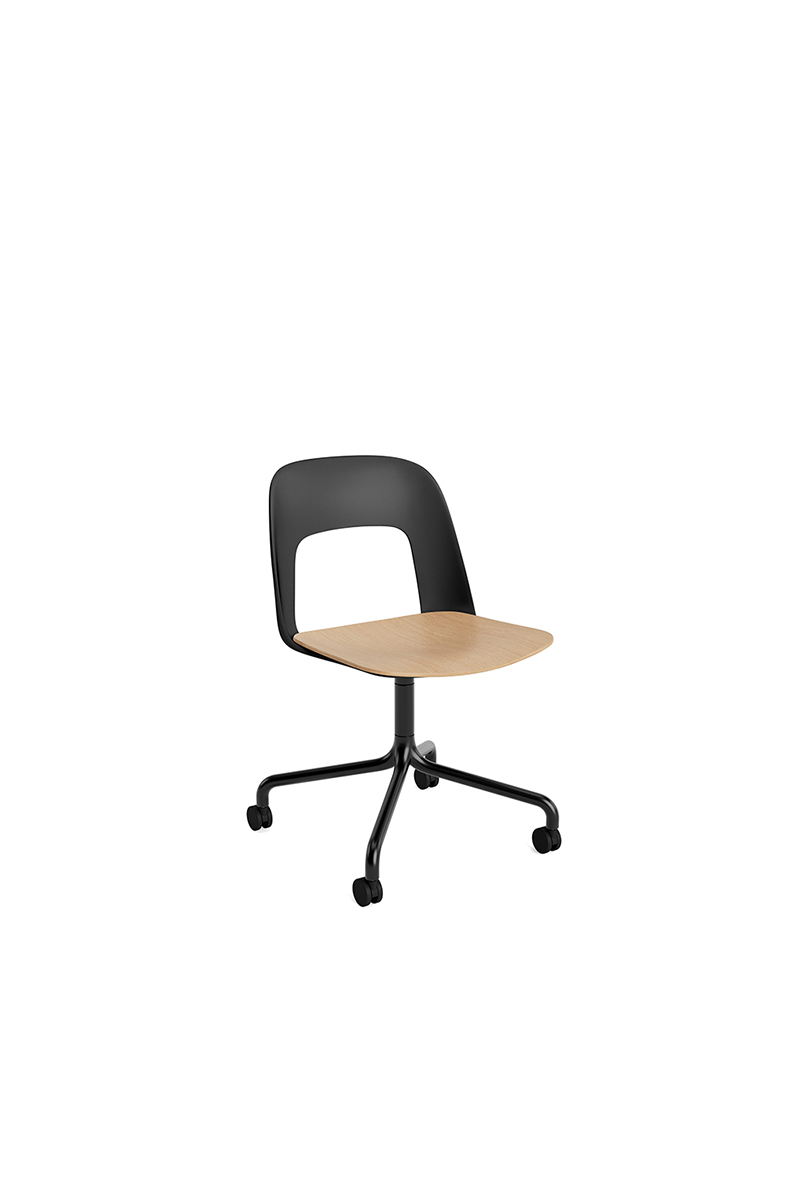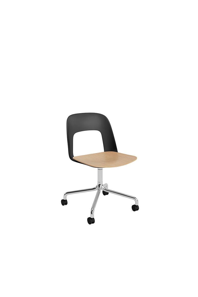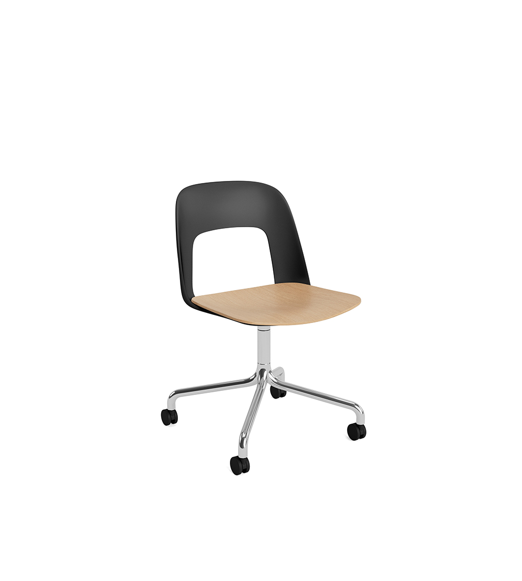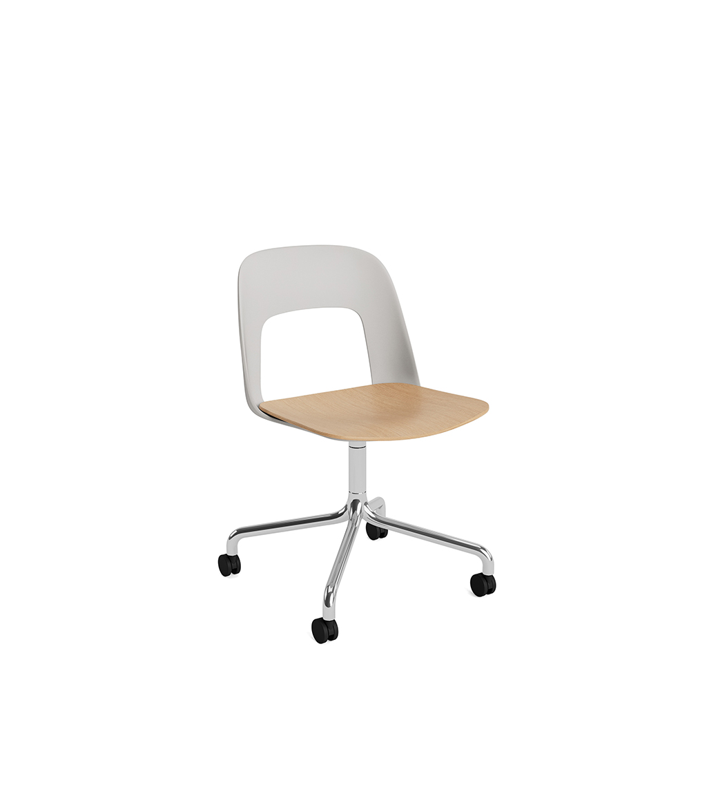 LAYOUT 162 – kėdės versija plastiko atlošu, medžio lukšto sėdimąja dalimi bei sukama aliuminio baze.