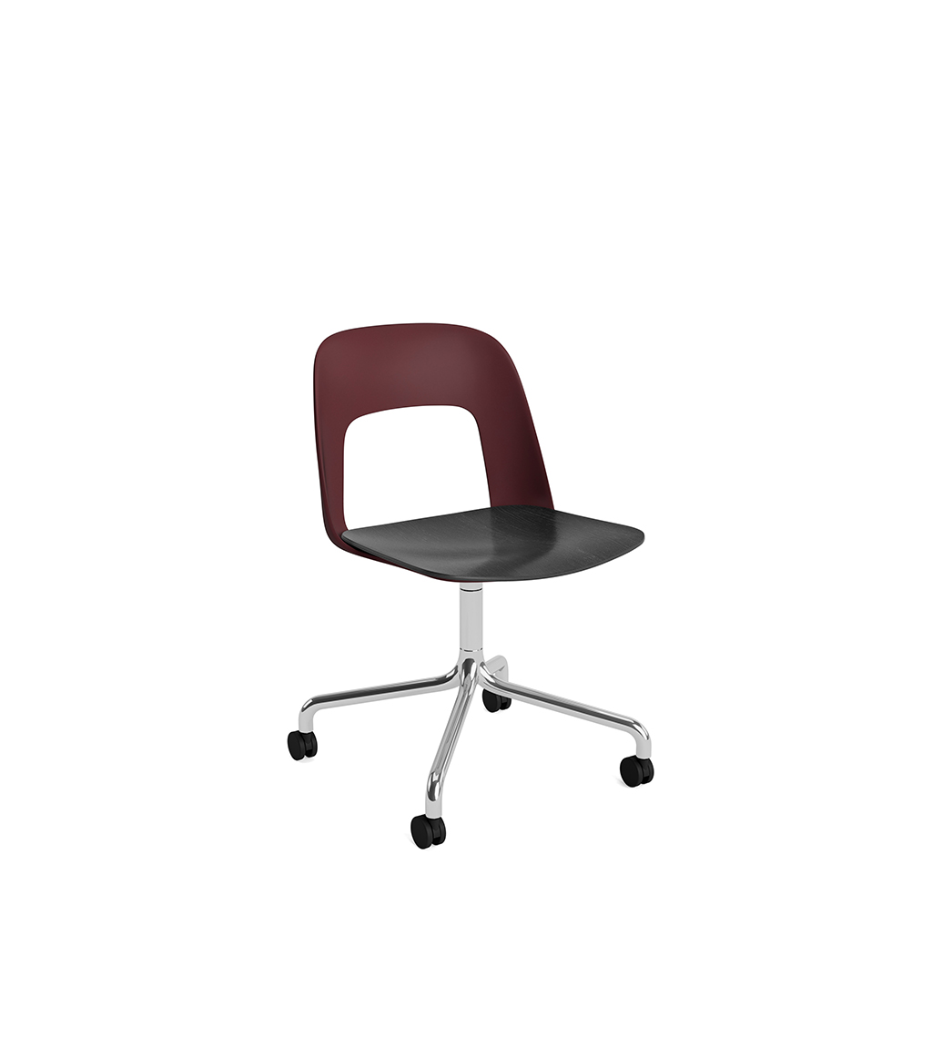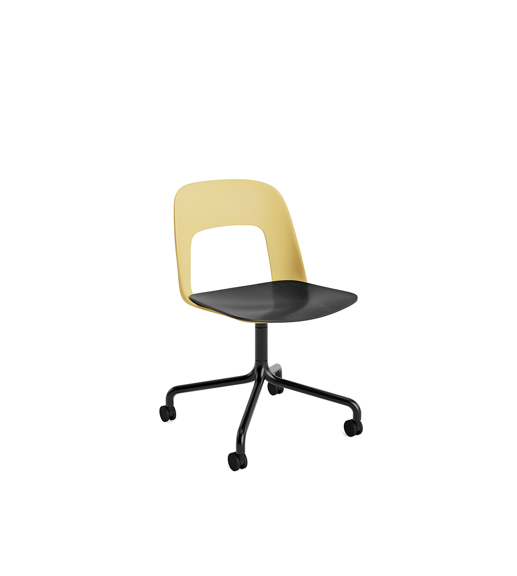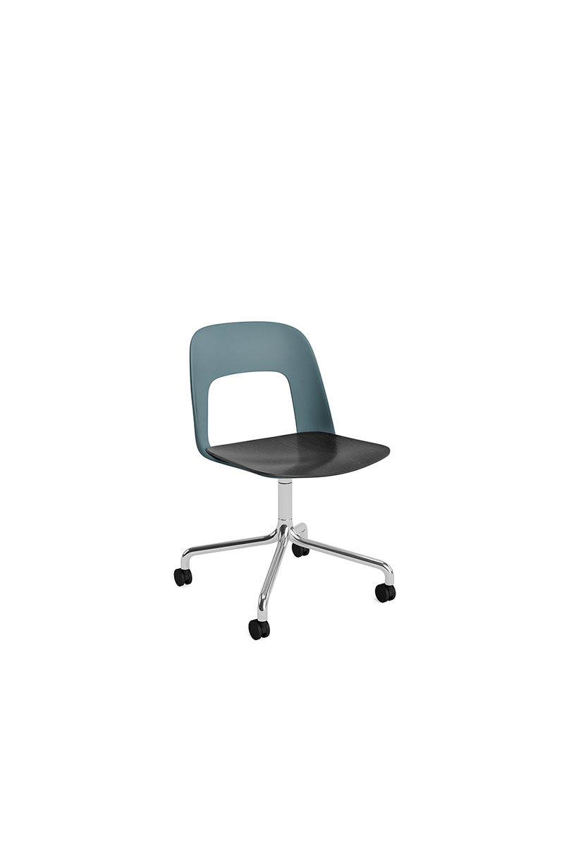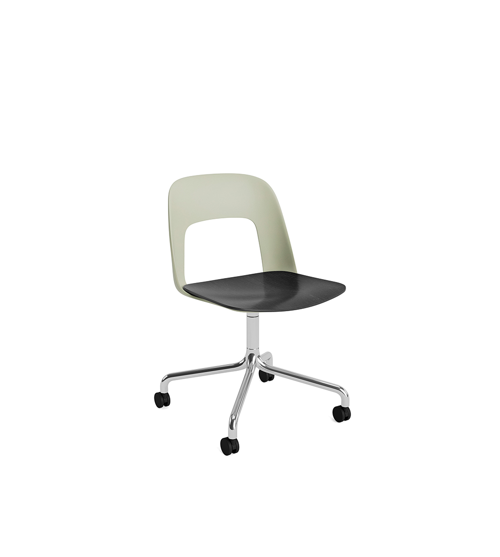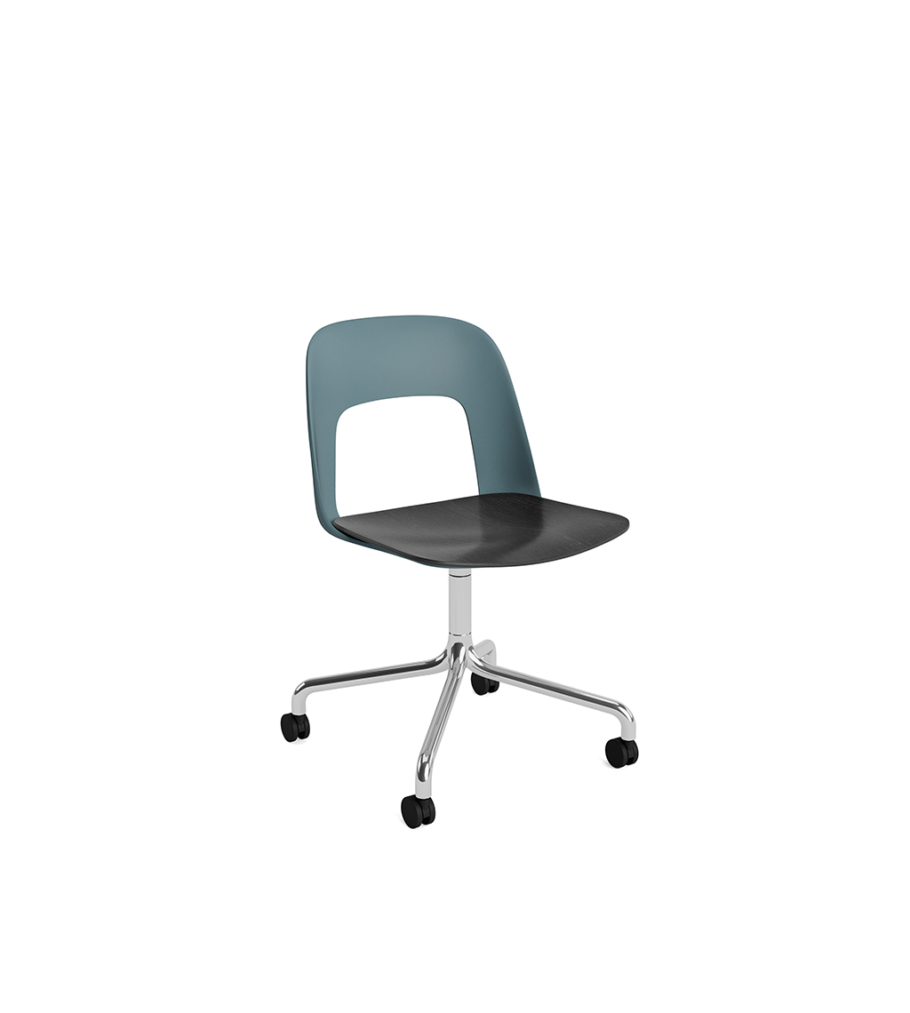 LAYOUT 162 – kėdės versija plastiko atlošu, medžio lukšto sėdimąja dalimi bei sukama aliuminio baze.