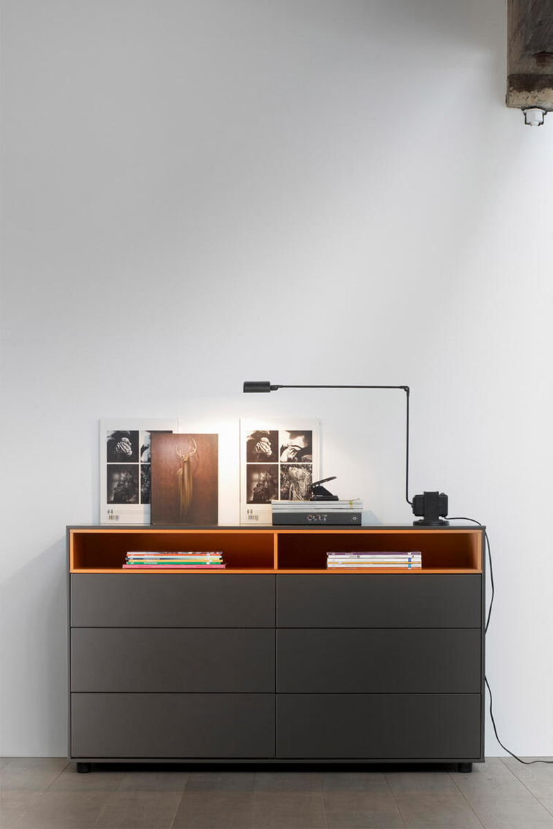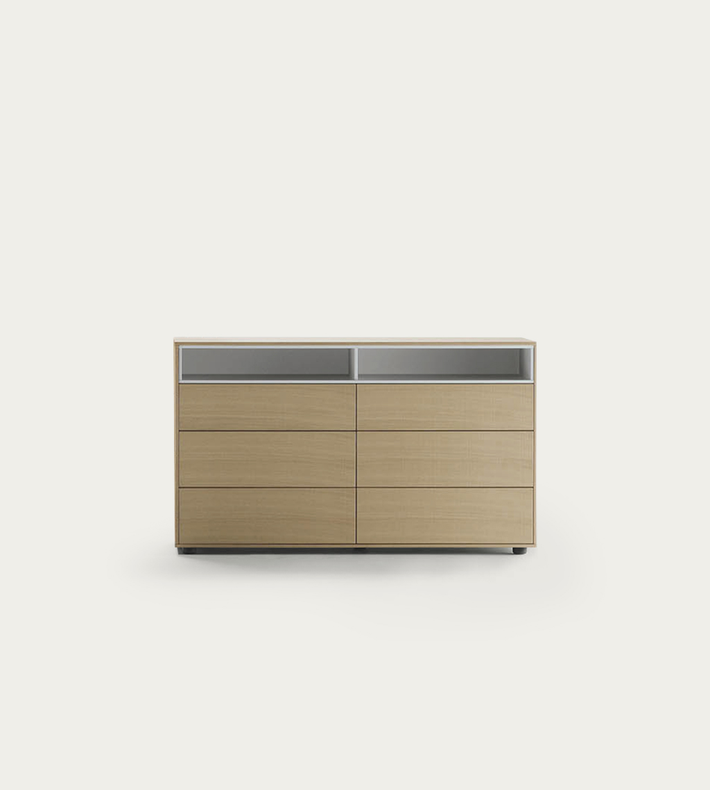 Komodų ir spintelių serija, siūlanti platų matmenų ir apdailų pasirinkimą. Serijos išskirtinumas - integruotas atviras modulis, kuris gali būti pasirenkamas kitos apdailos nei visas baldas.