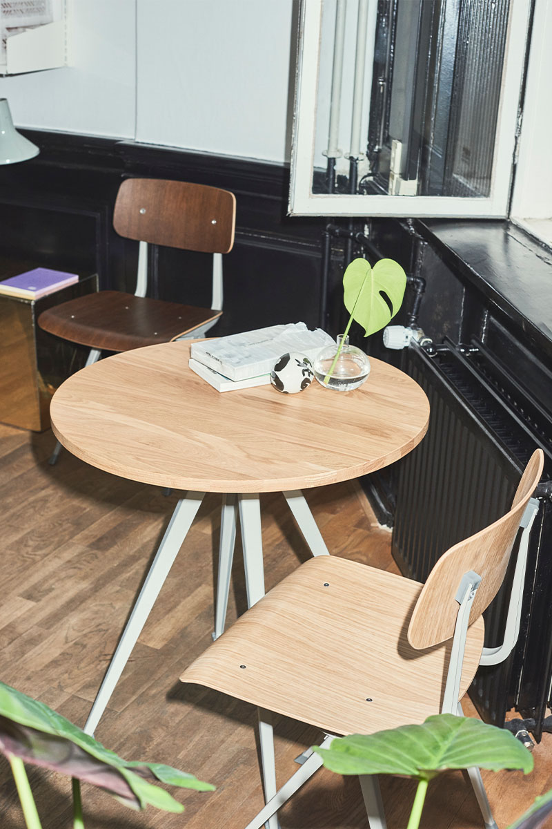 PYRAMID CAFÉ TABLE 21 – kompaktiško dydžio pietų stalas apvaliu arba kvadratiniu stalviršiu.