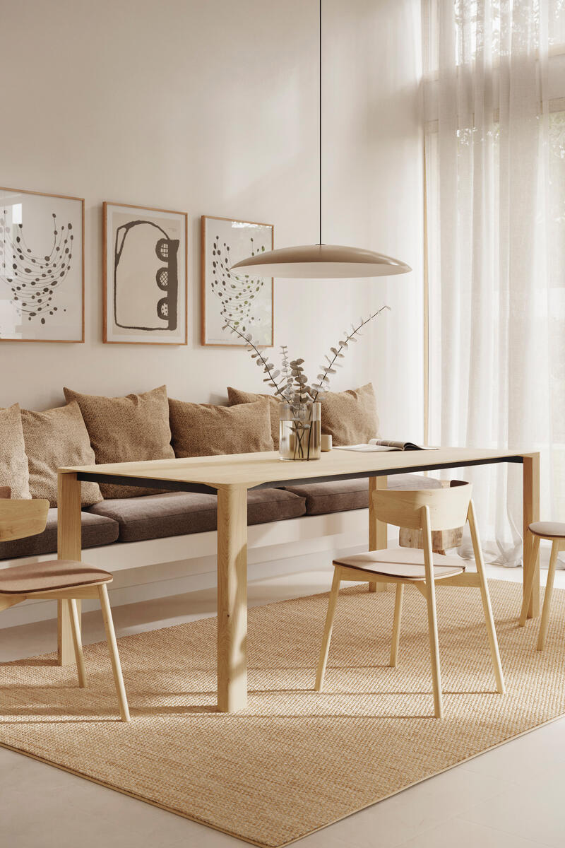 Jūsų pasirinkimui: fiksuoto dydžio šeimyninis pietų stalas arba stalas su prailginimo galimybe, pritaikomas ir didesniems susibūrimams. Kojelių apdailos pasirinkimui – skirtingų spalvų medžio lukštai, o stalviršių spektre – medžio lukštų arba Tmatt dangų pasirinkimas.