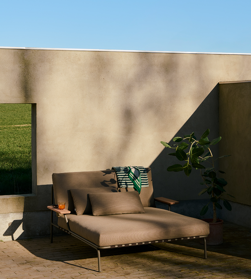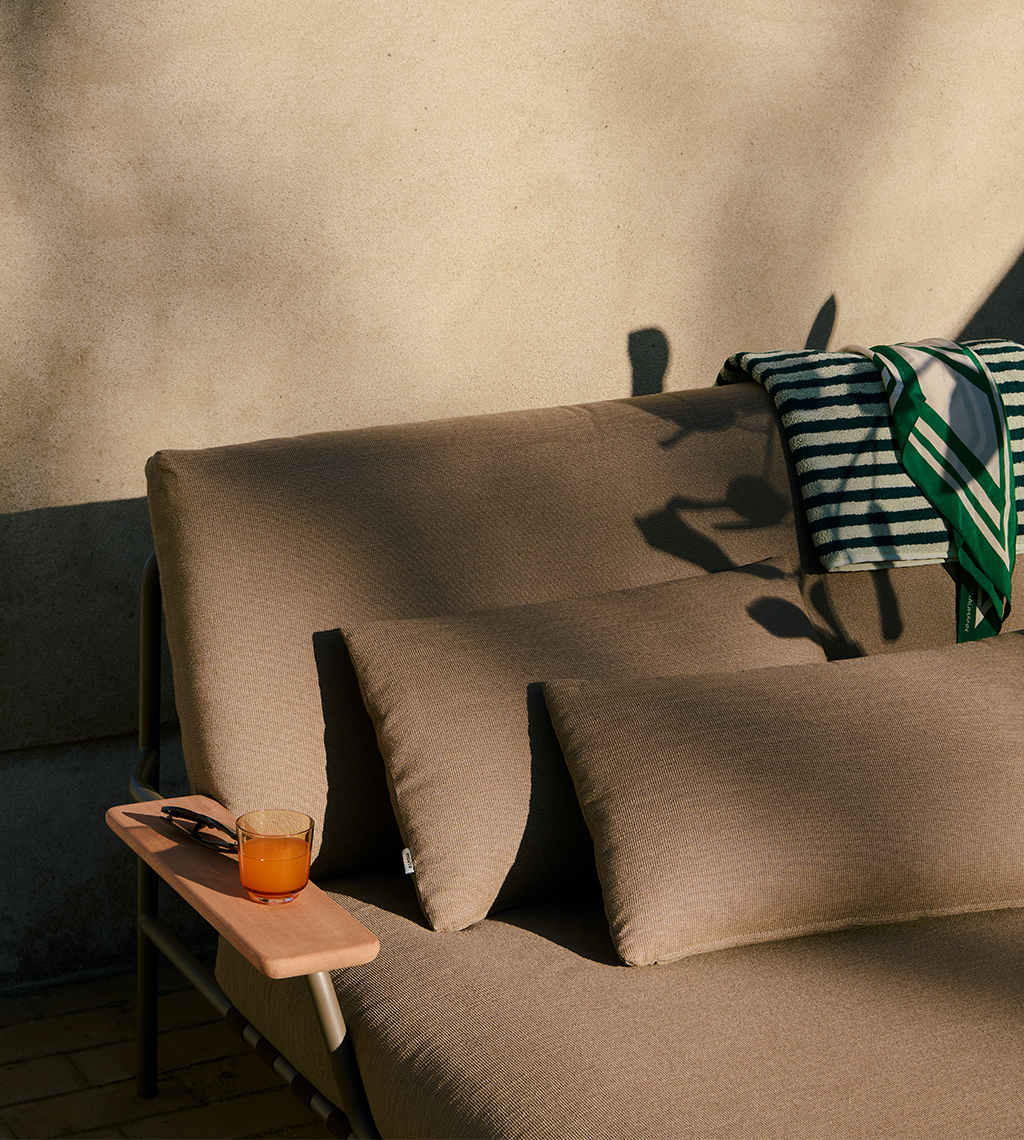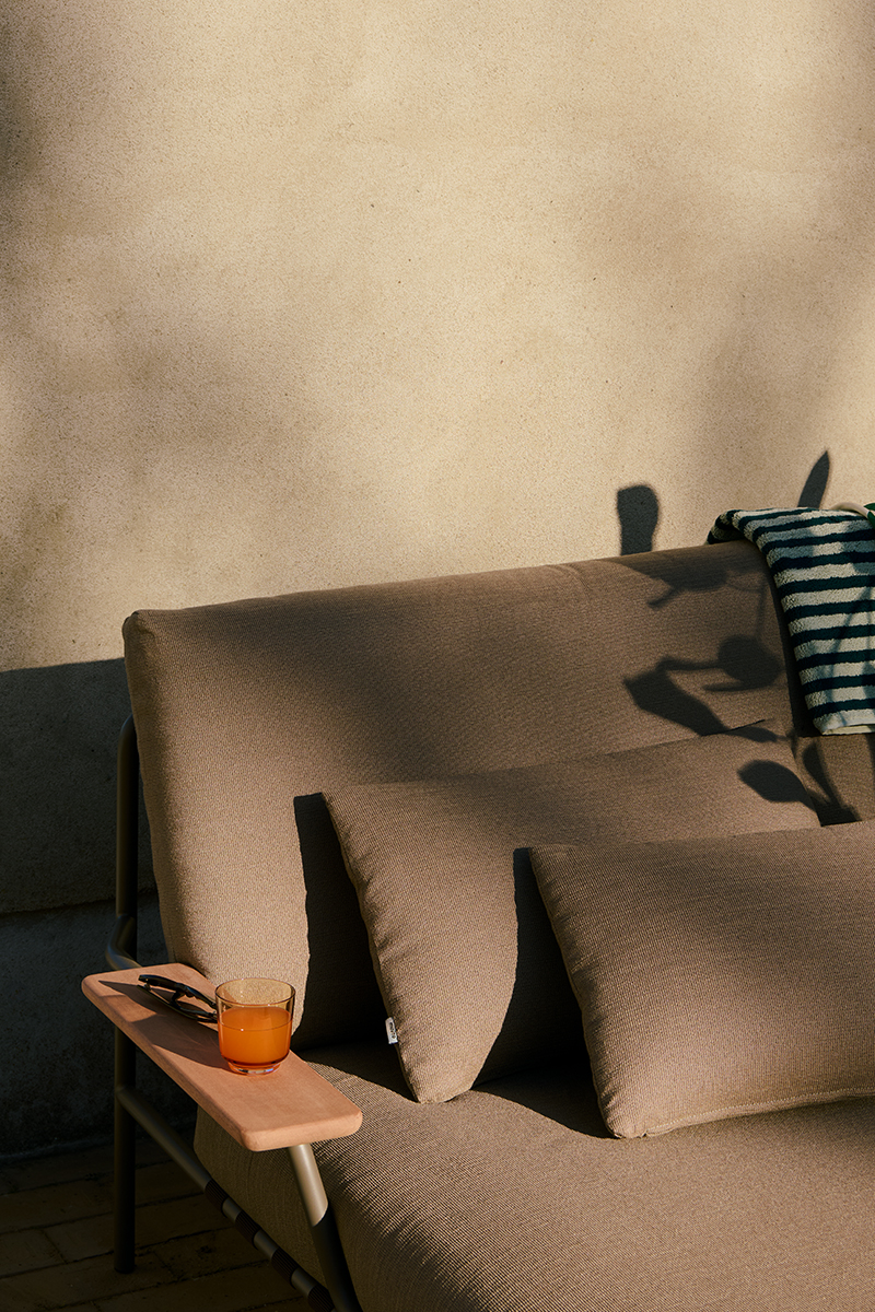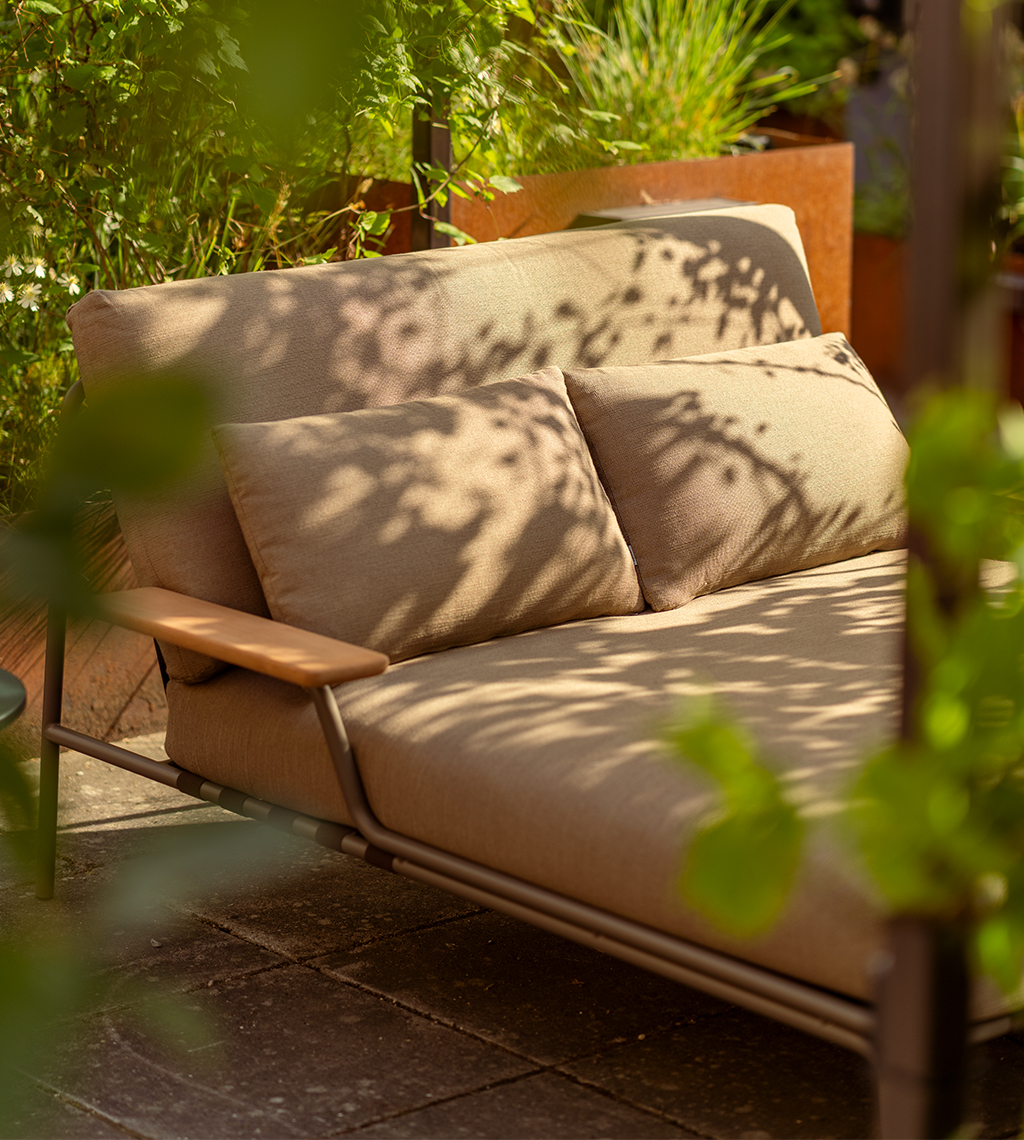 SETTLE lauko baldų serija – ideali poilsio platforma, kviečianti mėgautis komfortu ir džiaugtis geru oru įvairiose lauko erdvėse. Vizualiai lengvas plieno rėmas, ritmiškai apjuostas laikančiųjų diržų, ir subtilūs akcentai leidžia žavėtis baldu iš visų rakursų. Porankiai, gaminami iš patvarios FSC™ sertifikuotos ritininės tiamos medienos – ne tik jaukus vizualinis akcentas, bet ir maloni prisiliesti rankų atrama. Galvanizuotas, milteliniu būdu dažomas plieno rėmas užtikrina atsparumą korozijai ir ilgaamžį baldo naudojimą. Minkštos sėdimosios pagalvės, gaminamos iš specialaus, greitai džiūstančio porolono, vilktos patvariais, lauko sąlygoms skirtais ir lietui atspariais audiniais, todėl minkštaisiais lauko baldais mėgausitės ne vieną sezoną. Papildomai galima užsisakyti apsauginį uždangalą, kuris padės apsaugoti baldus nuo oro sąlygų, kai jie nenaudojami.