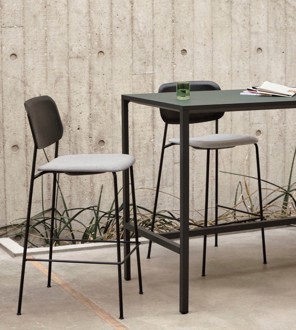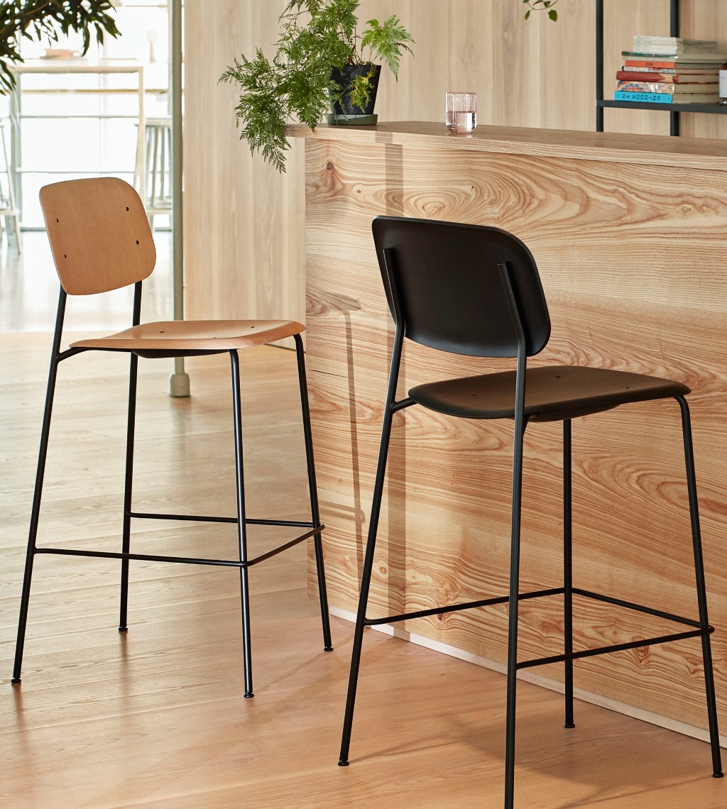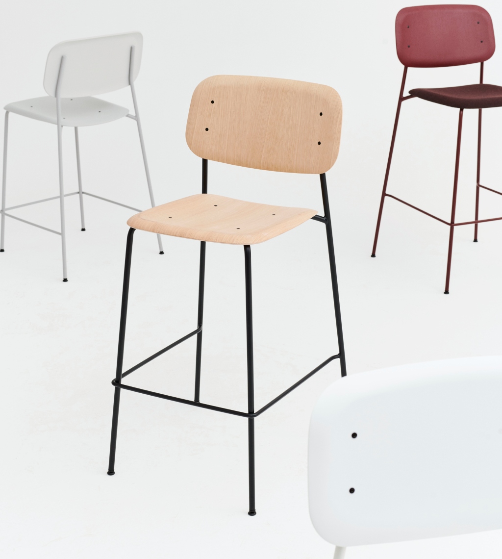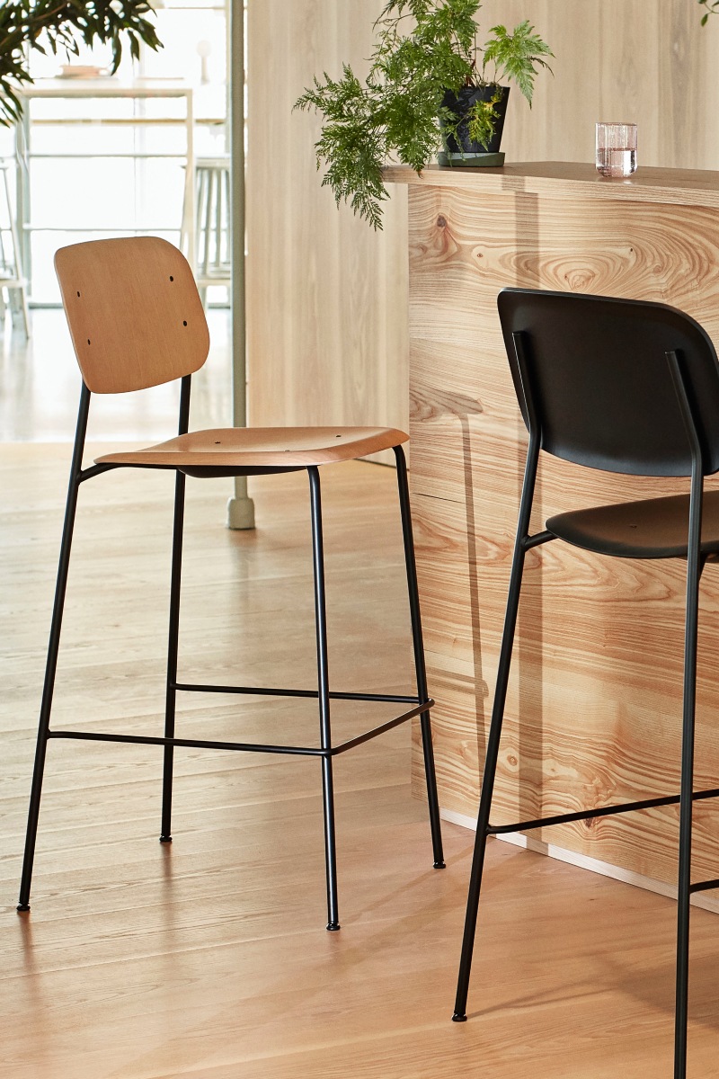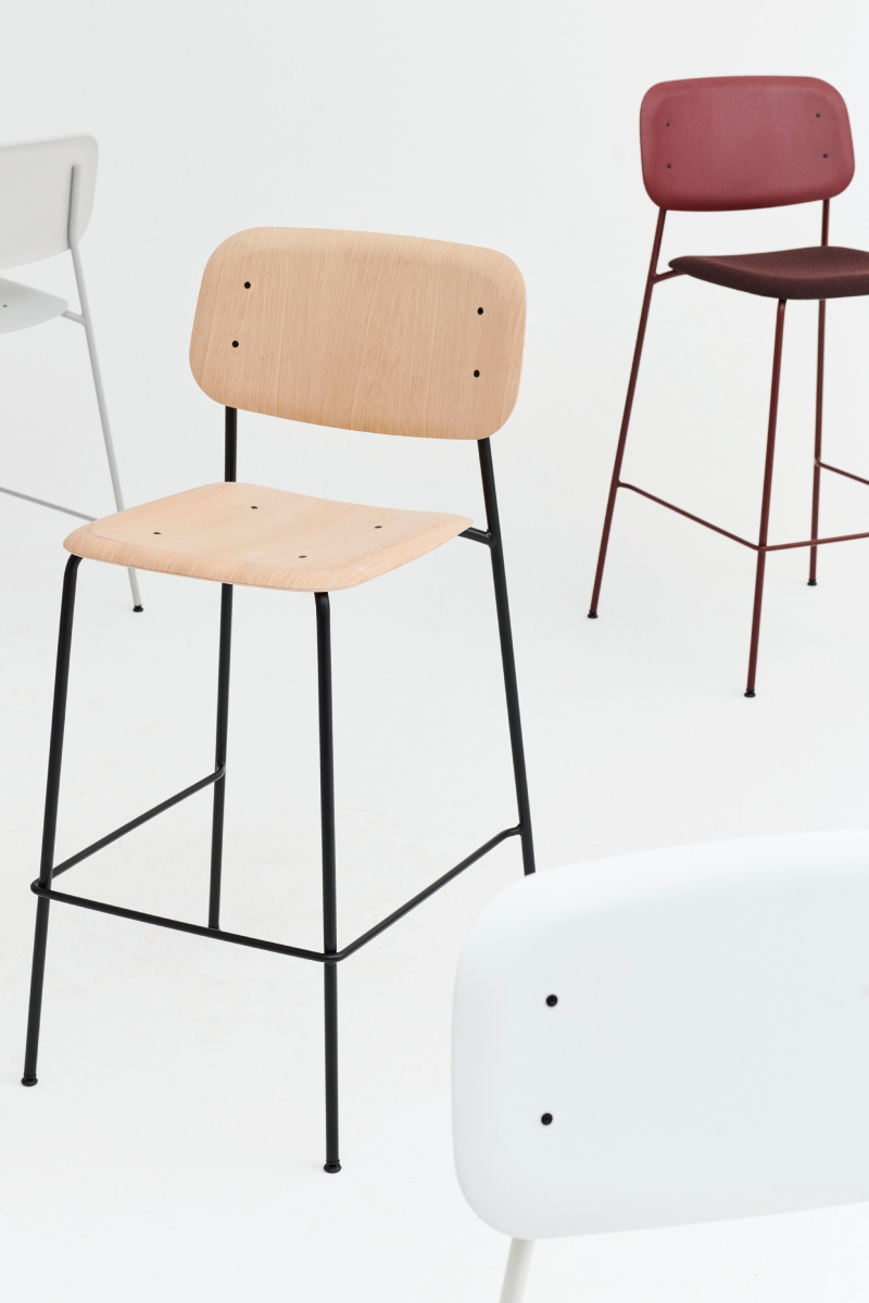 Galimi du SOFT EDGE 90 BAR STOOL sėdynės variantai: kietoji (ąžuolo fanera) arba minkštoji (vilkta pasirinktu audiniu arba oda). SOFT EDGE šeimos kėdės gali būti sudedamos viena ant kitos.