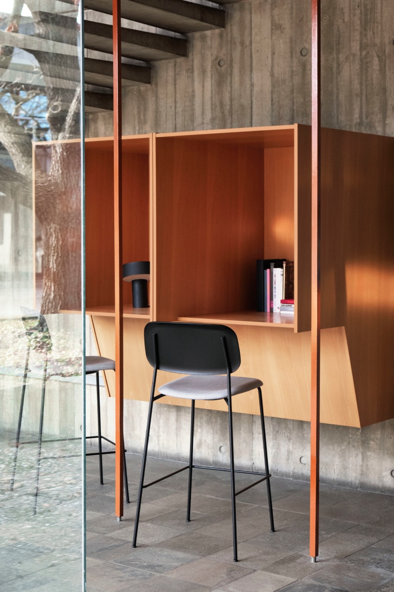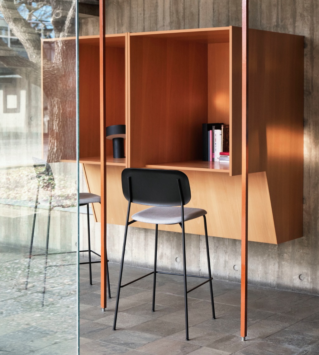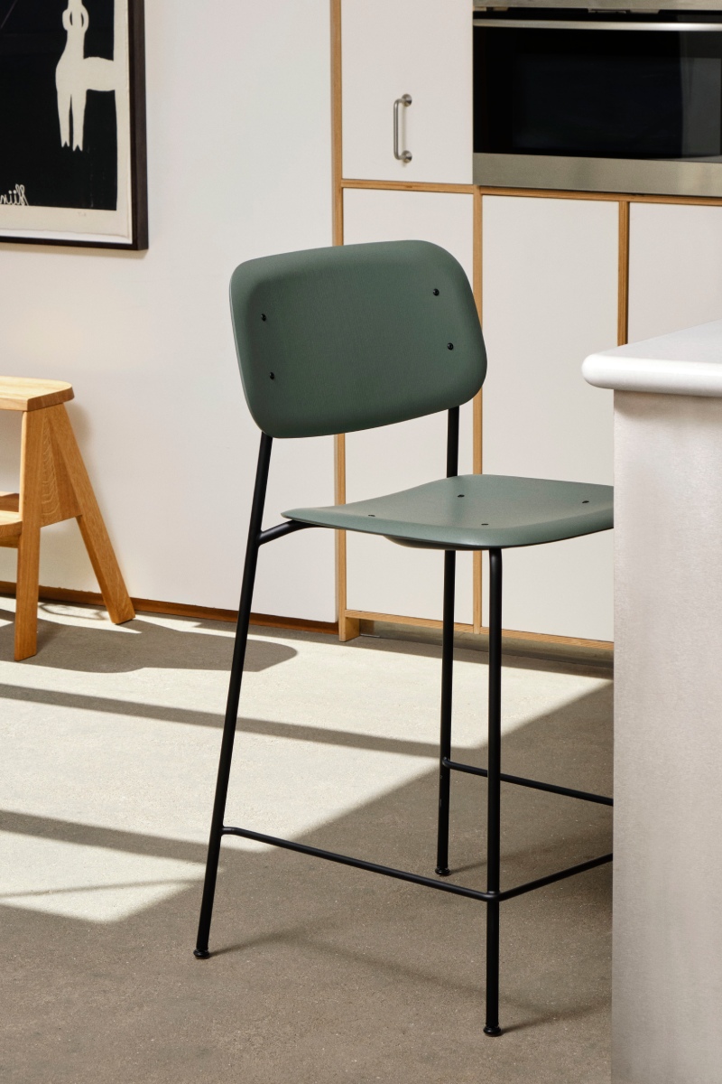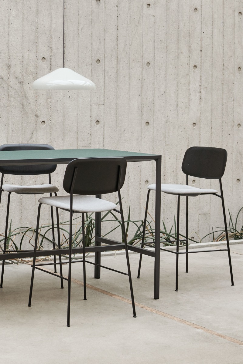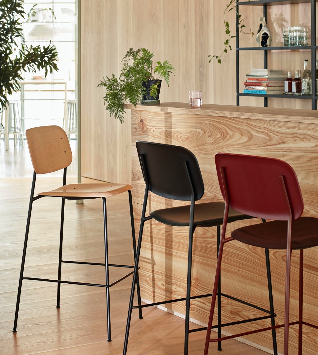 Galimi du SOFT EDGE 90 BAR STOOL sėdynės variantai: kietoji (ąžuolo fanera) arba minkštoji (vilkta pasirinktu audiniu arba oda). SOFT EDGE šeimos kėdės gali būti sudedamos viena ant kitos.
