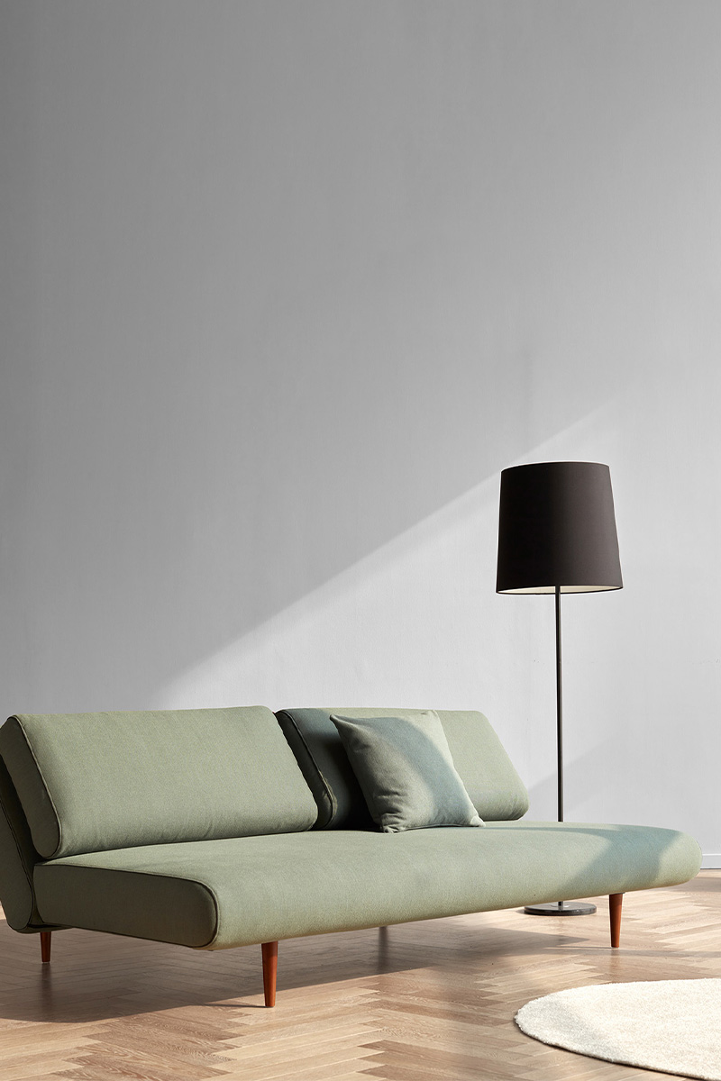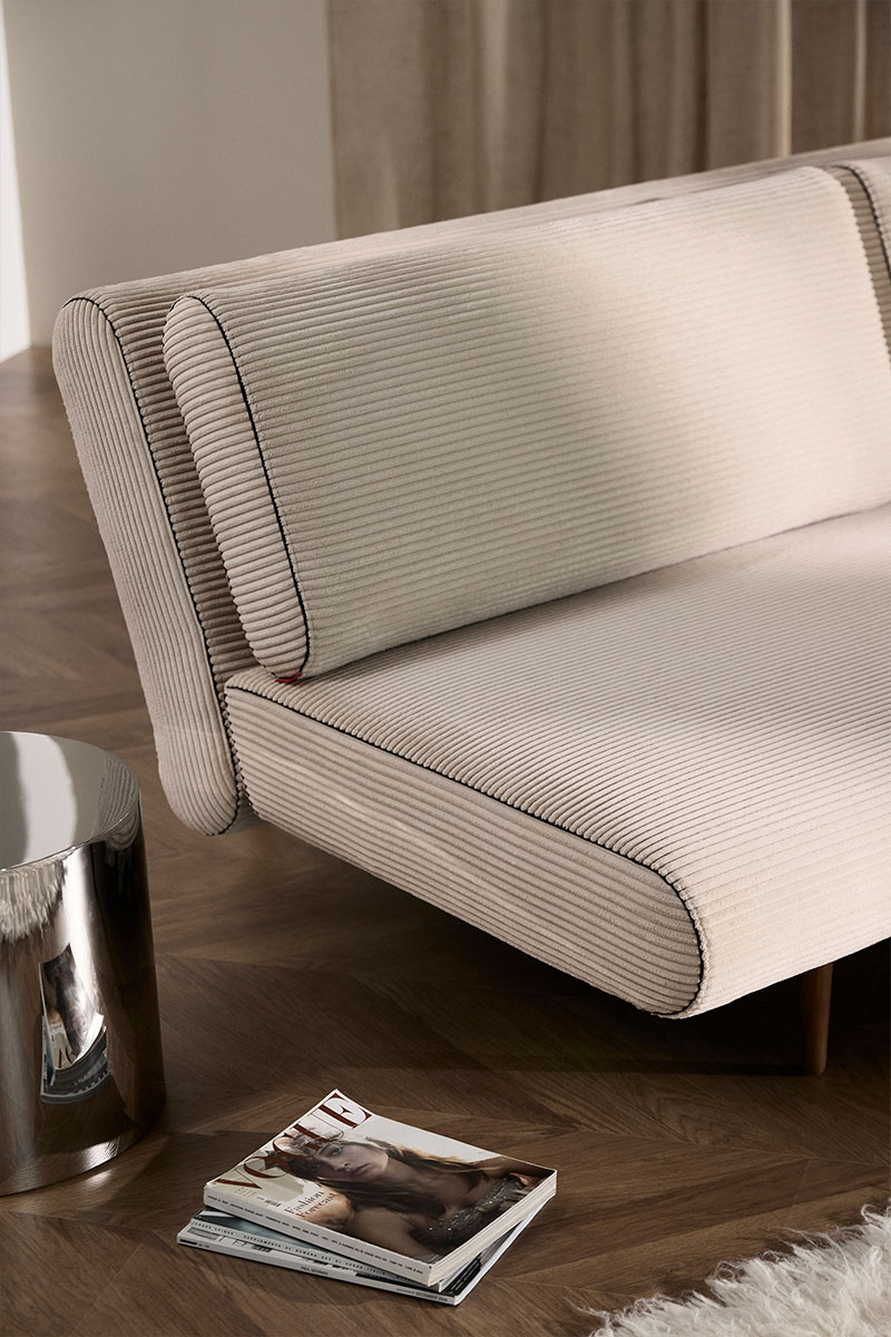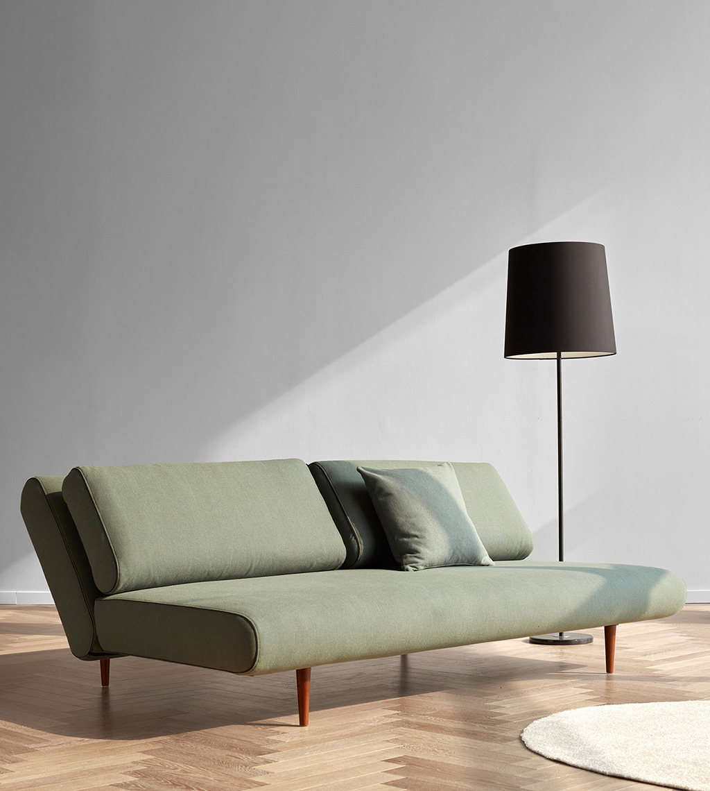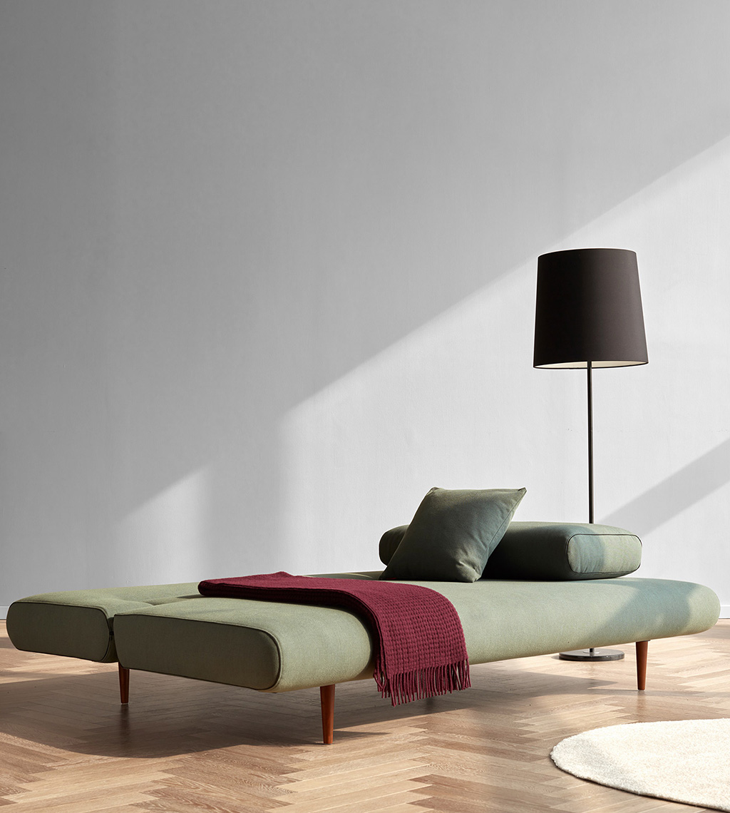 Tai jau klasika tapusio modelio UNFURL modelio transformacija į erdvesnį, poilsiui skirtą baldą. Kelių pozicijų „Clic- clack“ fiksacijos mechanizmas leidžia susirasti patogiausią poziciją sėdint, ilsintis ar miegant. Sėdėjimo ir miego komfortą užtikrina integruotos kūginės spyruoklės. Tamsaus medžio “Styletto„ tipo kojelės.